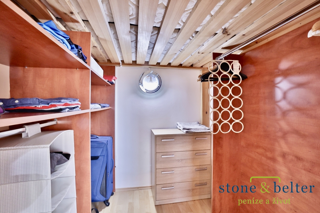 Součástí bytu je praktické mezonetové spaní s velkou šatnou pod patrem, kde je dostatek polic, komoda a závěsný systém pro oblečení. V hlavním pokoji je klimatizace.