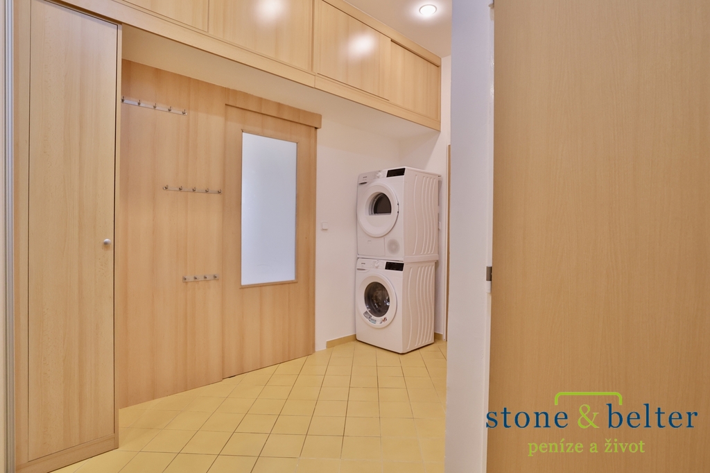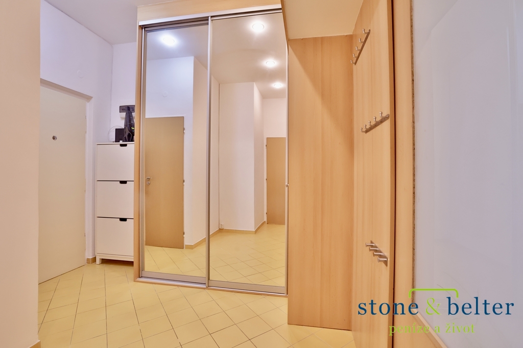 Obývací pokoj je propojen s kuchyňským koutem vybaveným spotřebiči. Byt má koupelnu s vanou a samostatné WC s oknem. V předsíni jsou umístěny pračka se sušičkou a velké vestavěné úložné skříně. Sklep není k dispozici.