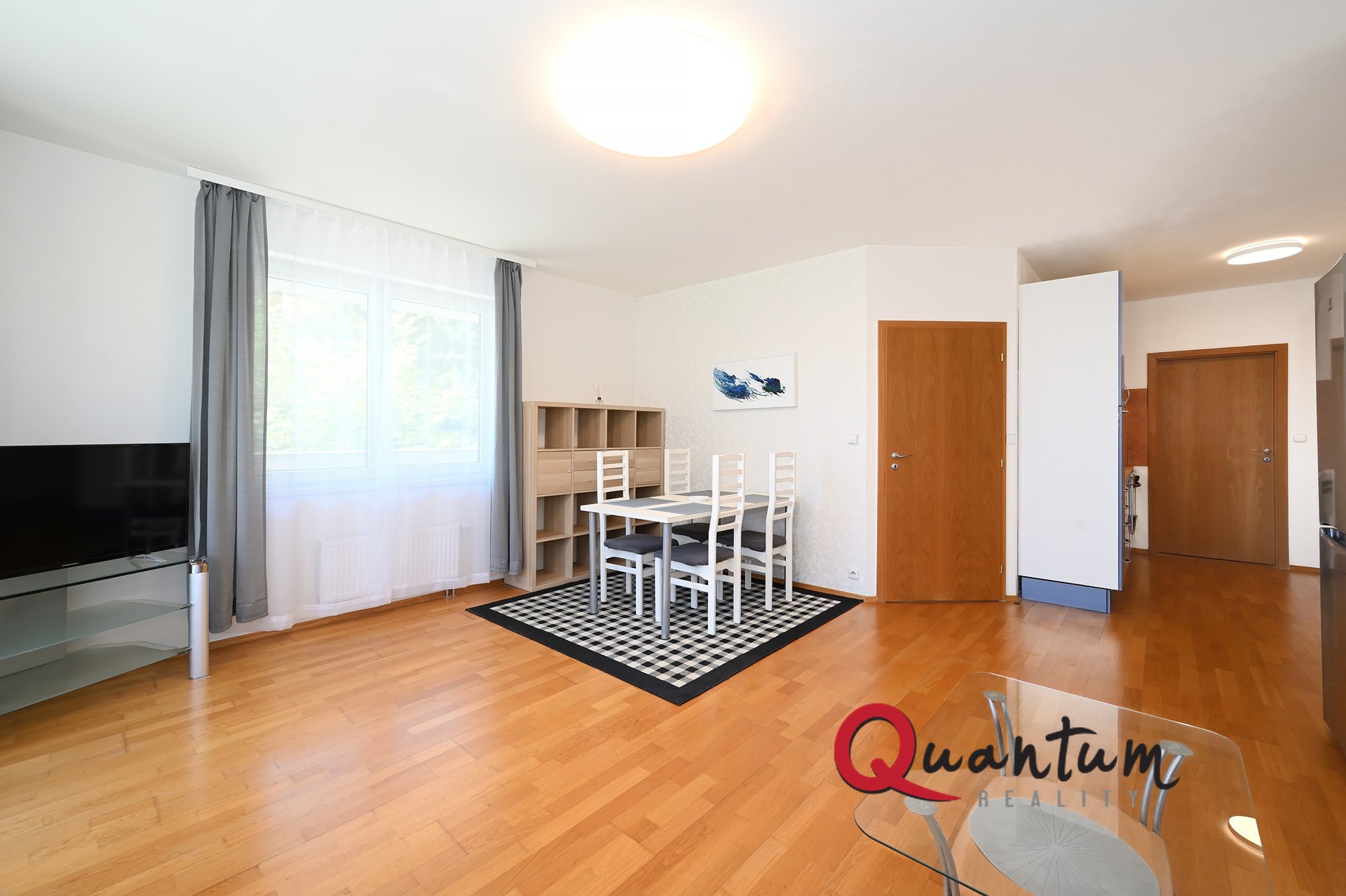 Dispozice bytu tvoří prostorný a velmi světlý obývací pokoj propojený s kuchyňským koutem. Obývací část je vybavena rozkládacím gaučem, jídelním stolem a televizí. Kuchyňský kout disponuje troubou, sklokeramickou varnou deskou, digestoří a lednicí, takže poskytuje vše potřebné pro pohodlné každodenní vaření.