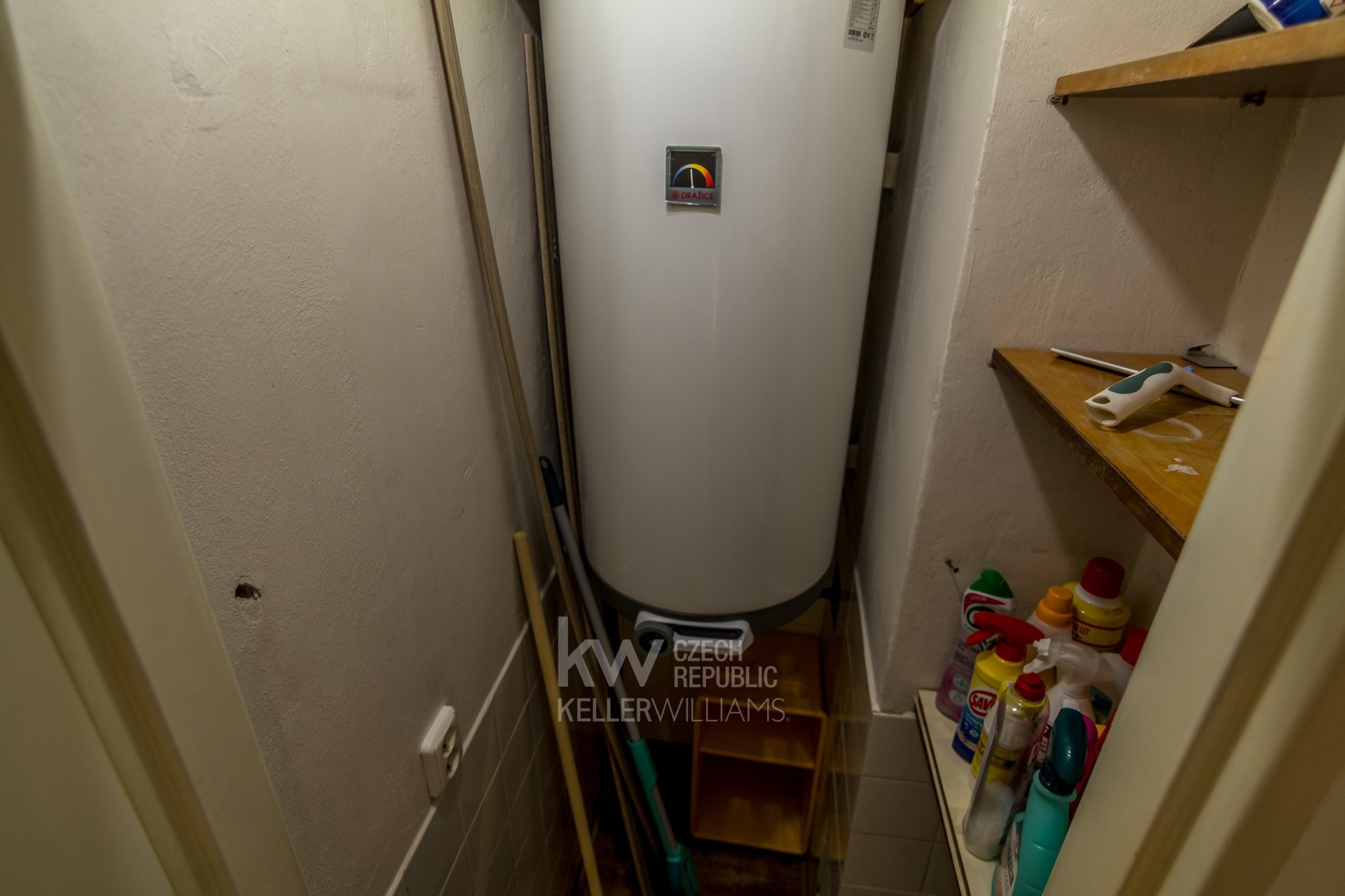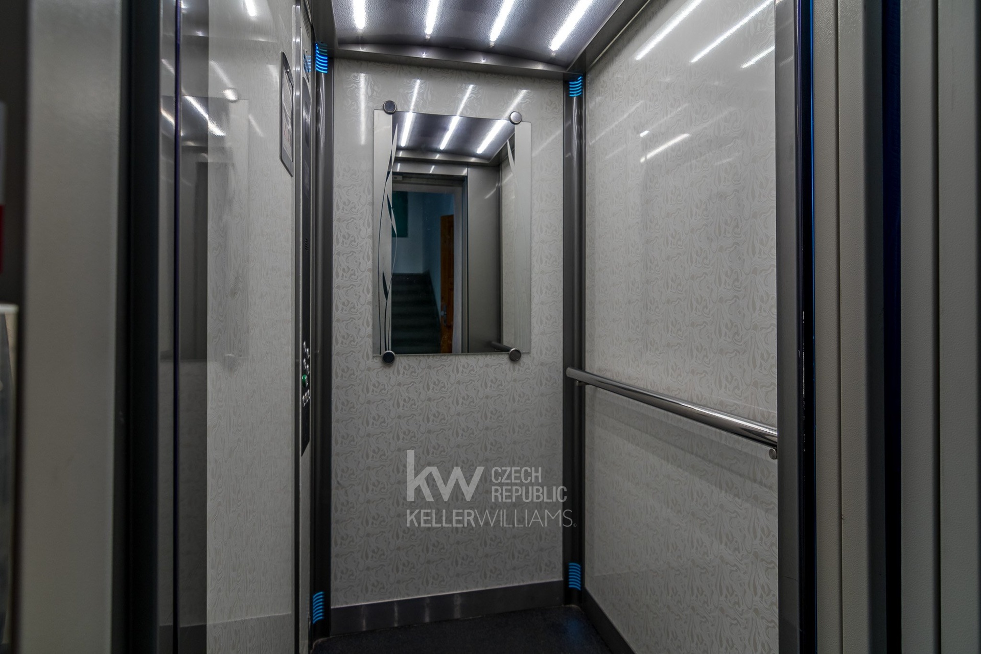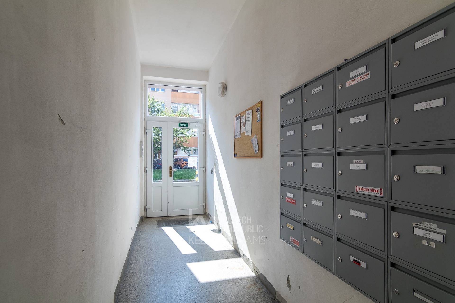 Bytová jednotka je umístěna v cihlovém domě s výtahem, který prošel zateplením. Interiér bytu je chytře řešený a připravený k okamžitému užívání. Srdcem bytu je obývací pokoj s plně vybaveným kuchyňským koutem (myčka, lednice, trouba, sklokeramická varná deska, digestoř, mikrovlnná trouba). Prostor je efektivně využit díky praktické sklápěcí posteli, která přes den šetří místo. Dispozici doplňuje druhý pokoj, koupelna se sprchovým koutem, samostatné toaleta a prostorná komora. K bytu náleží sklep v suterénu a k dispozici je také lodžie na patře, sdílená pouze s jednou sousední jednotkou.