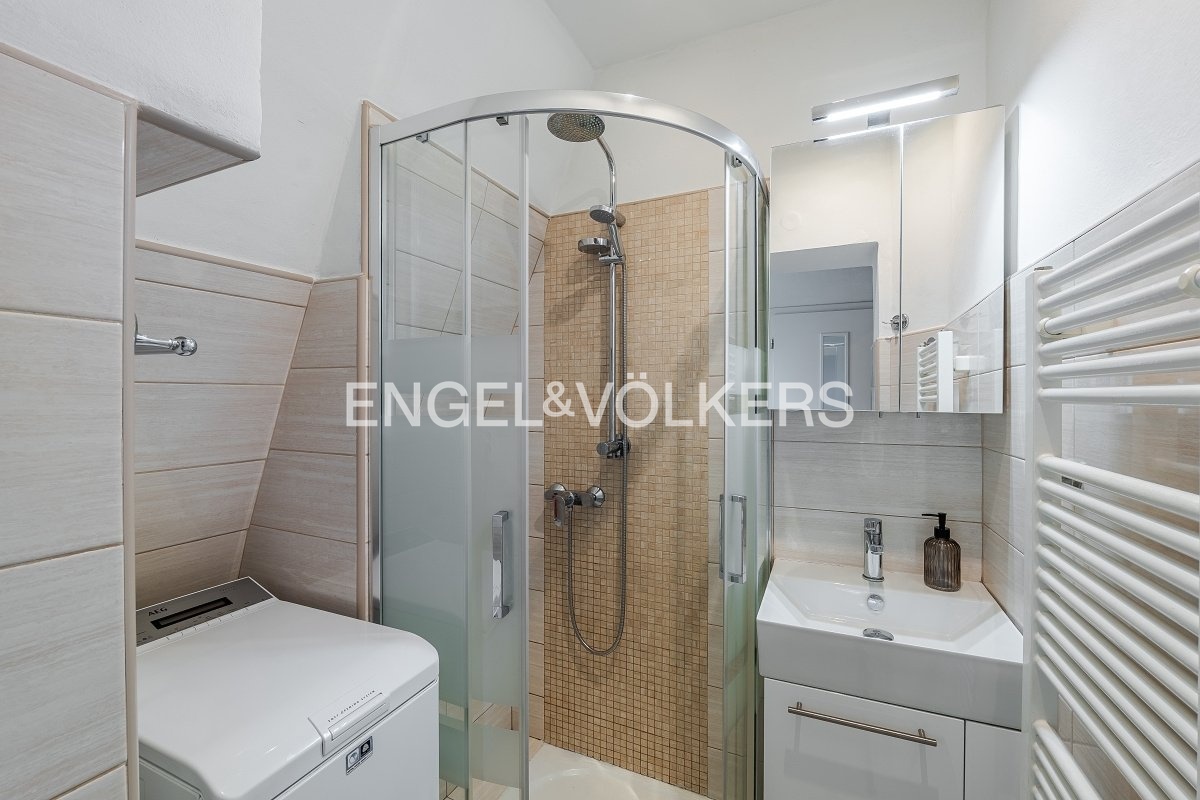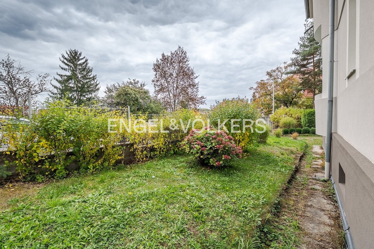 Interiér je laděn do světlých harmonických tónů a vybaven designovým nábytkem na míru. Součástí bytu je soukromá zahrádka, zděný sklep o velikosti 5 m² a společná sušárna.