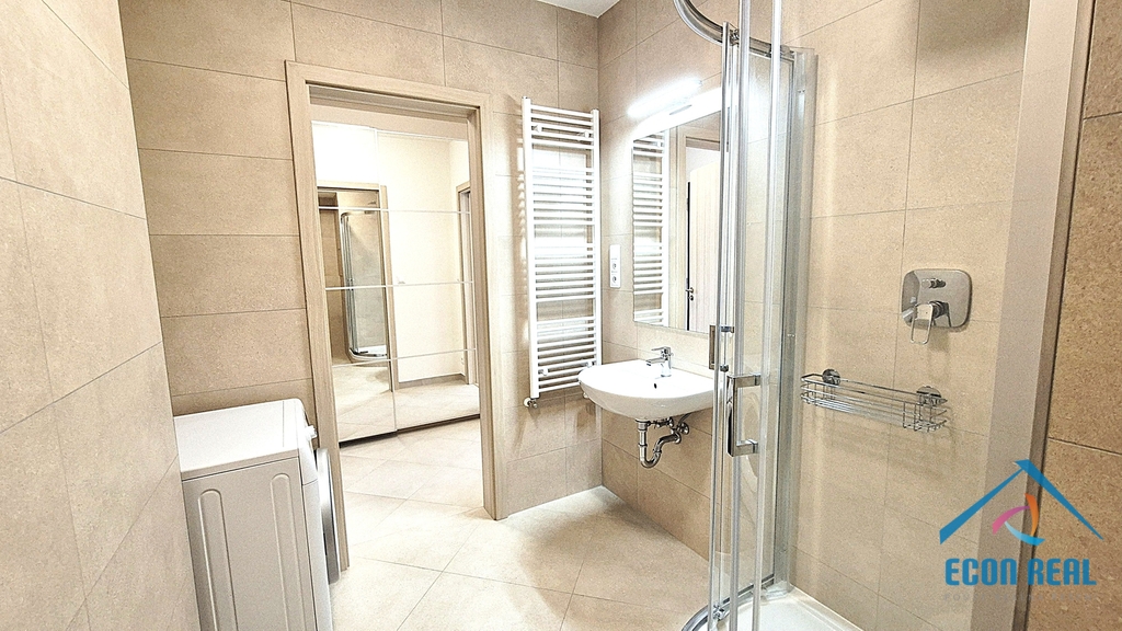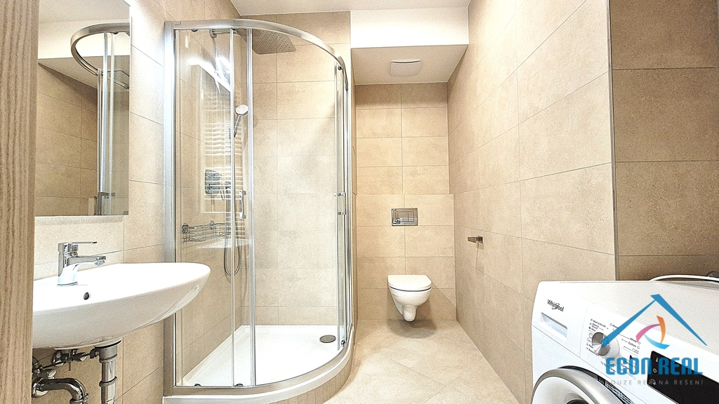 Společnost ECON REAL s.r.o. si Vám dovoluje nabídnout pronájem v podstatě nového bytu 1+kk, výměry 32 m2 (28,7 m2 byt + 4,1 m2 lodžie + 2 m2 zděná sklepní kóje a parkovací místo v garážích pod domem). Byt se nachází ve 4. patře bytového domu, je bezbariérový a orientovaný na JV a je vybaven dvěma kvalitními a velmi prakticky řešenými šatními skříněmi a kuchyňskou linkou s varnou sklokeramickou deskou, troubou, myčkou a vestavěnou lednicí s mrazákem. Příjemná koupelna disponuje propojením moderního sprchového koutu, s toaletou a umyvadlem se zrcadlem. Pračka s integrovanou sušičkou je součást vybavení. Celý interiér je moderní a světlý, vstupní dveře jsou bezpečnostní.