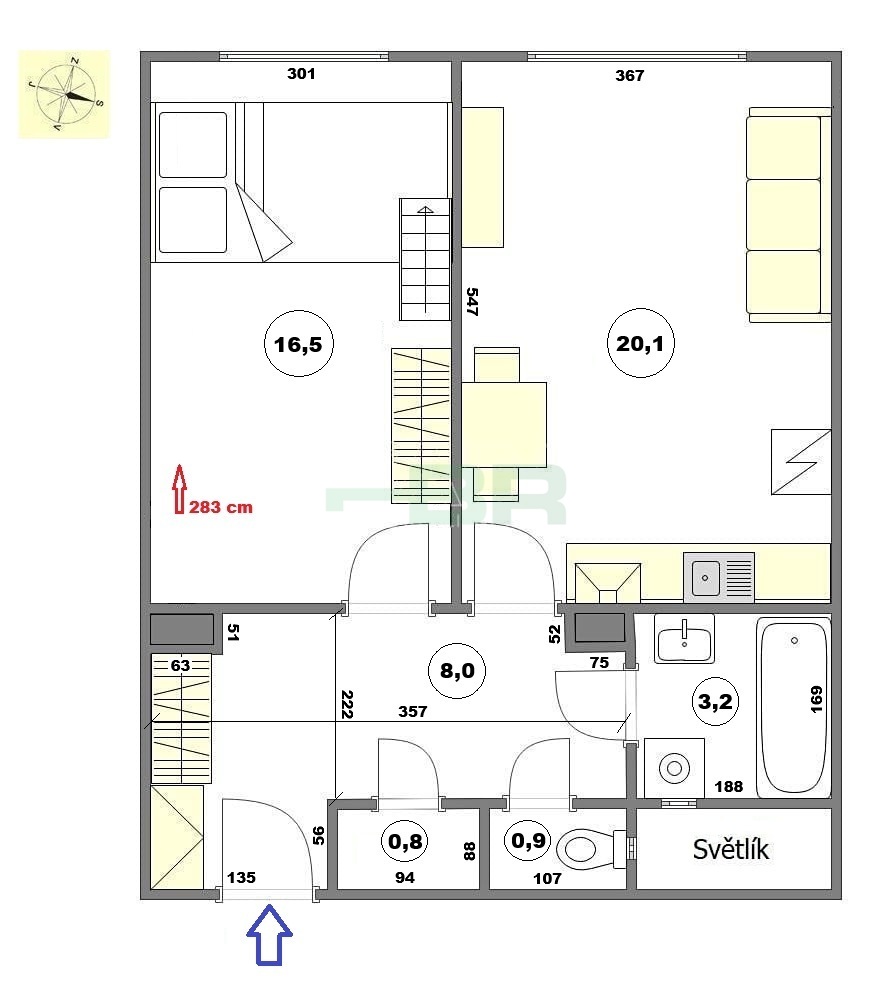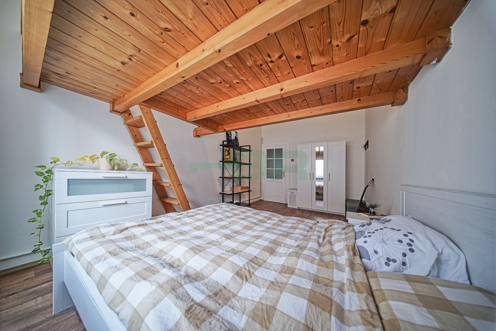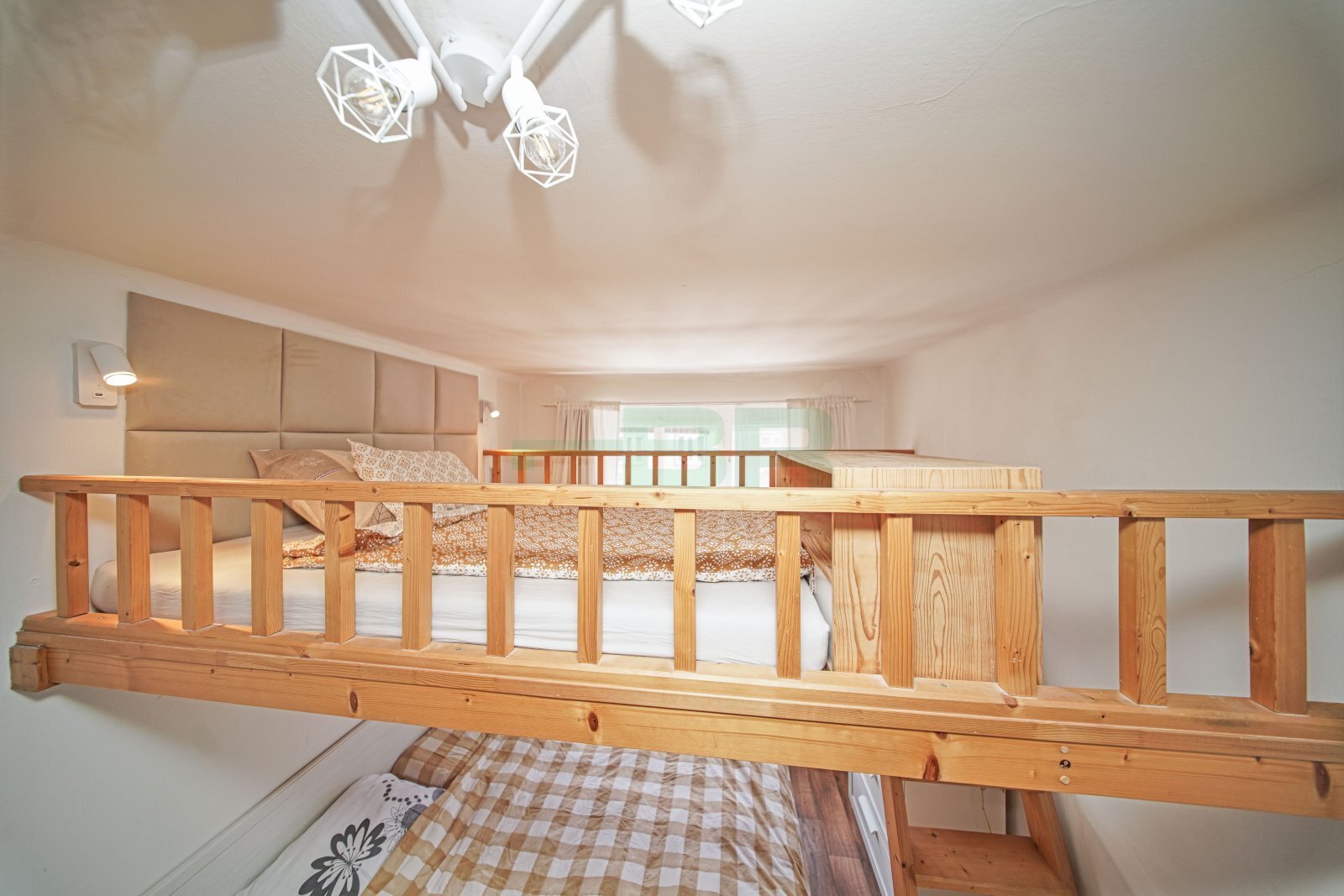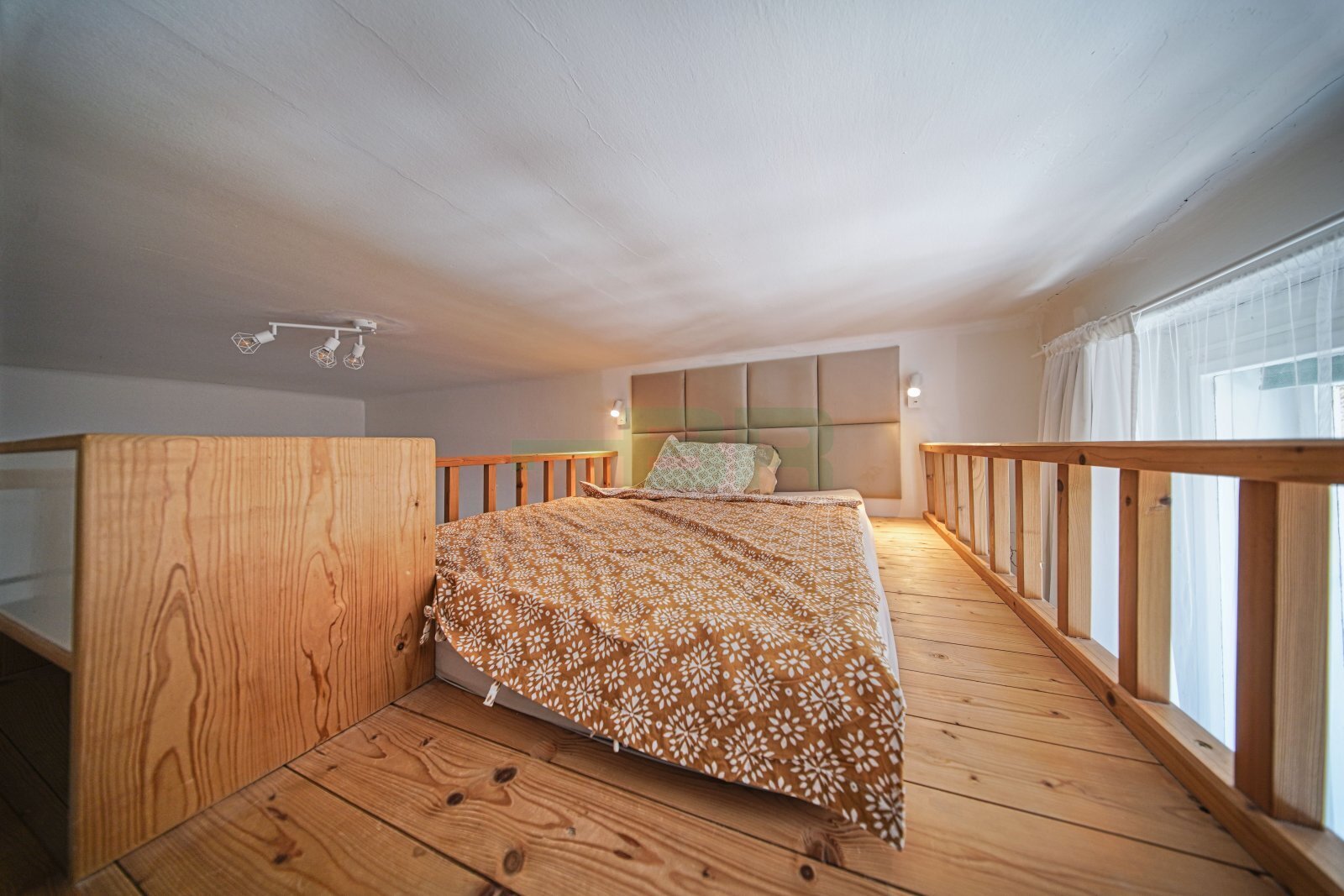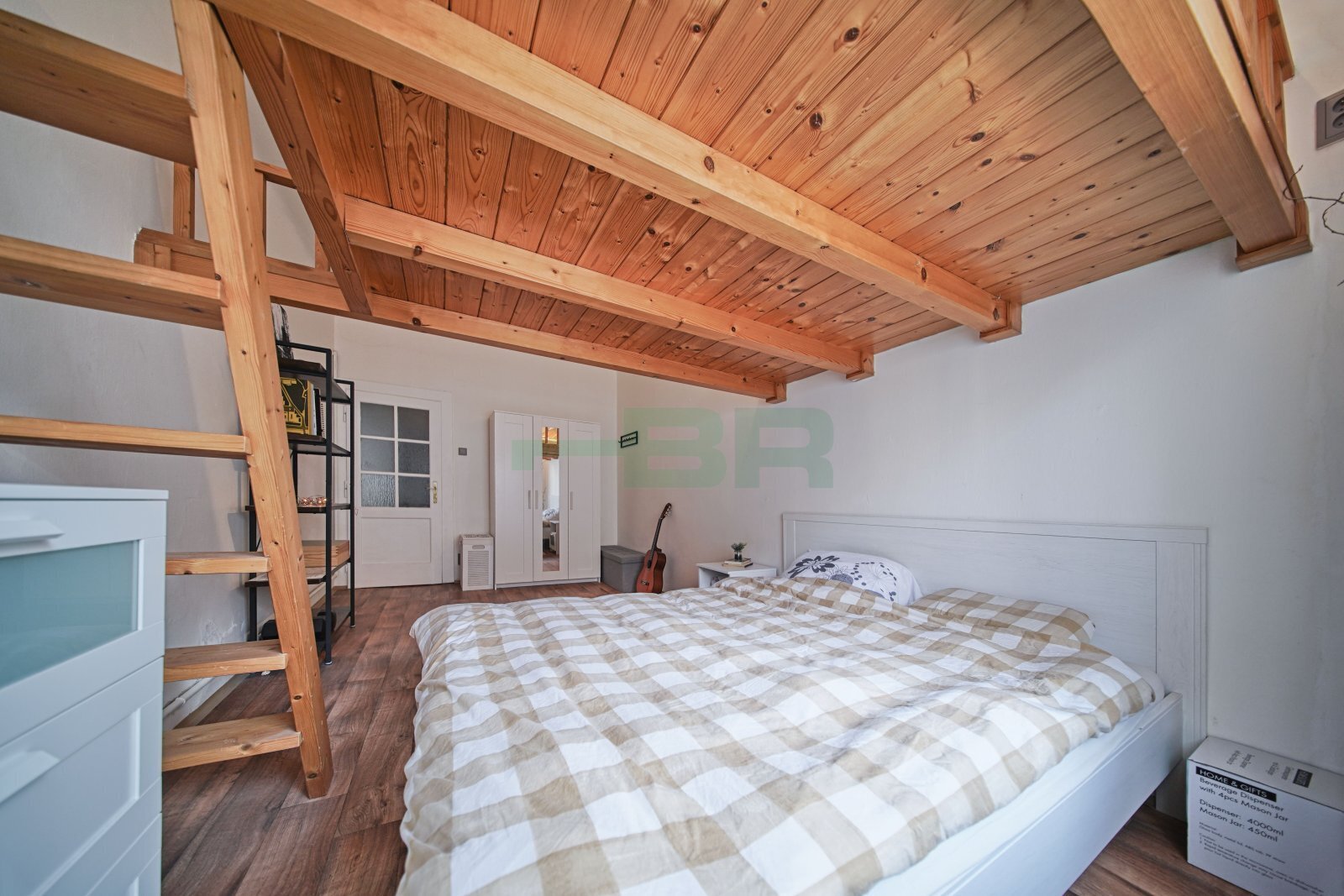 Byt 2+kk (49,5 m2), patro na spaní (6 m2), drátěný sklep (3 m2).