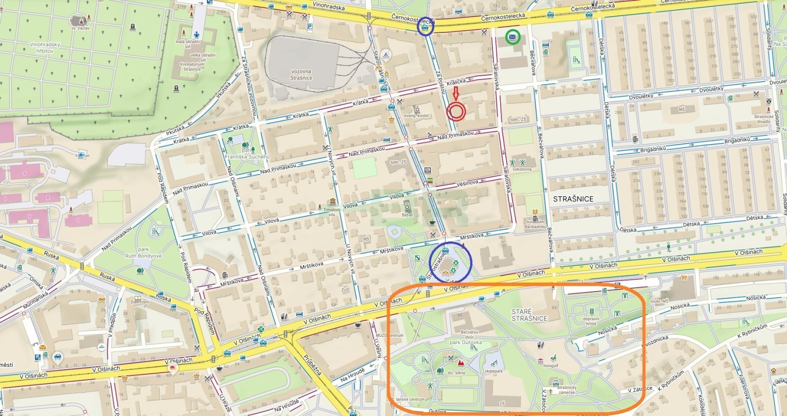 Krásné okolí s plnou občanskou vybaveností a sportovního vyžití. 400 m od domu park Gutovka s minigolfem, lezeckou stěnou, skate parkem, lanovým centrem, Strašnickým zámečkem a několika dětskými hřišti.
