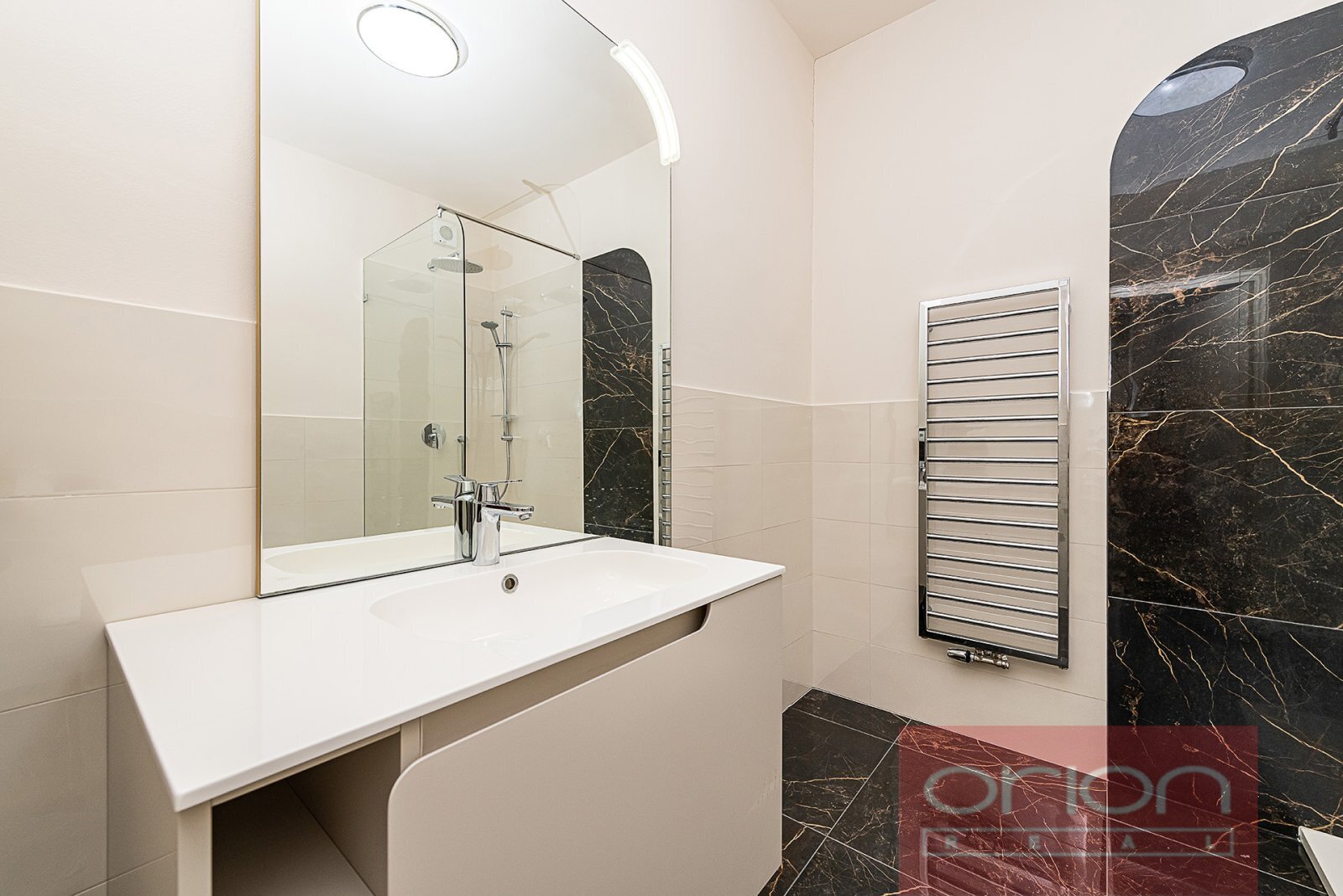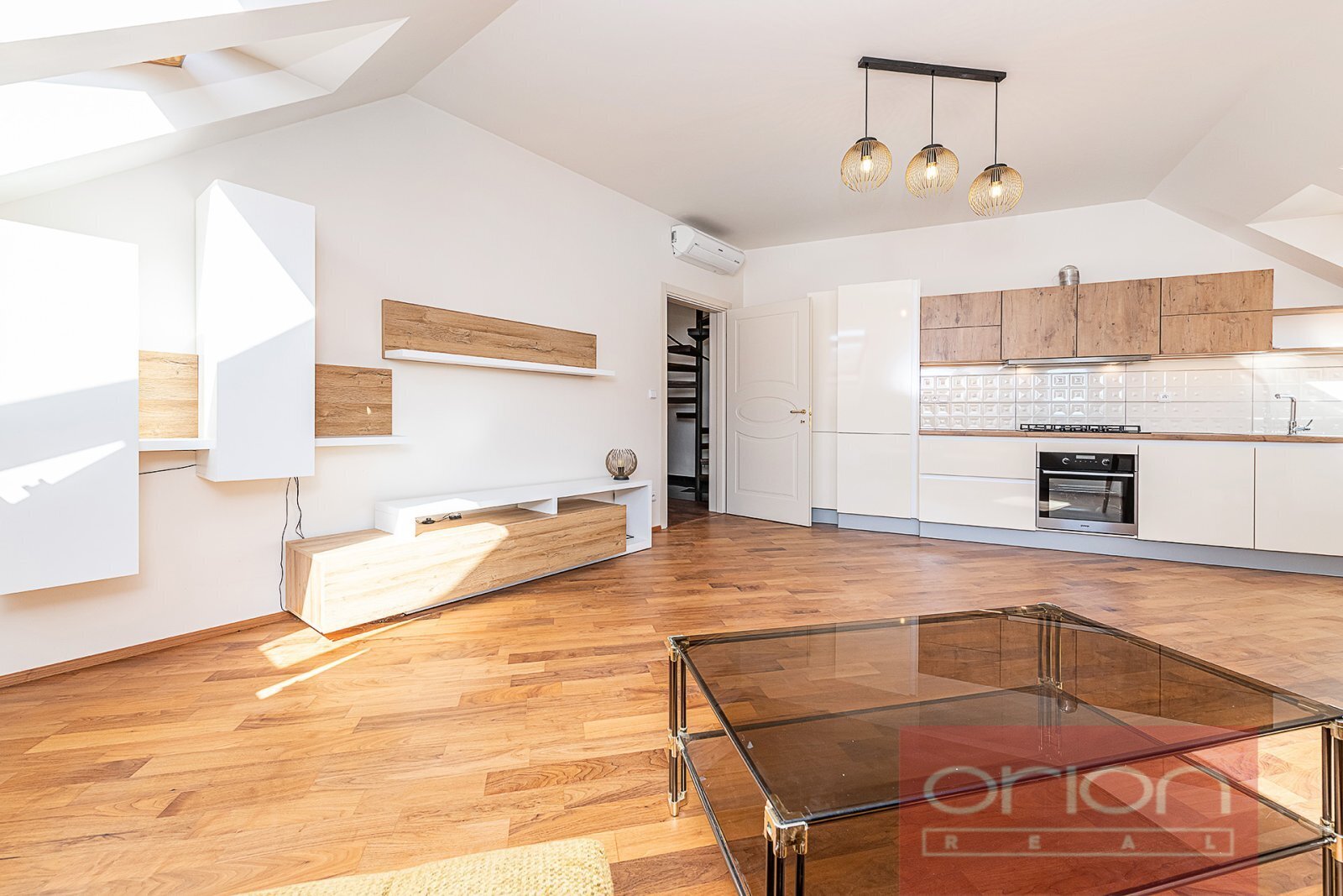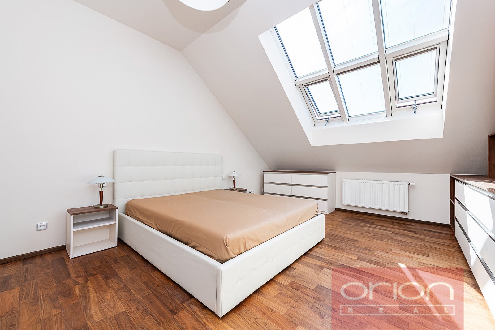 Nabízíme k pronájmu nově zařízený byt s klimatizací o velikosti 3+kk v 5. patře kompletně zrekonstruovaného secesního domu s výtahem. Byt s plochou 101 m² nabízí v nižším patře velkou vstupní chodbu, prostorný obývací pokoj spojený s kuchyní vybavenou všemi spotřebiči a krásným výhledem na okolní domy, ložnici s postelí a vestavěnými skříněmi, koupelnu se sprchou, toaletou a bidetem, samostatnou toaletu, komoru. Z chodby vede schodiště do pokoje, který lze využít jak pracovnu nebo druhou ložnici. K vybavení bytu patří dřevěné podlahy v pokojích, v ostatních místnostech dlažba, plynový kotel, velkoformátová okna, klimatizace. Dům je v oblíbené části Praha 3 - Žižkov, jen pár minut chůze od stanice metra Jiřího z Poděbrad a od parku Riegrovy sady. V místě je veškerá občanská vybavenost: obchody, restaurace, bary, bistra, v blízkosti nákupní centrum Flóra.