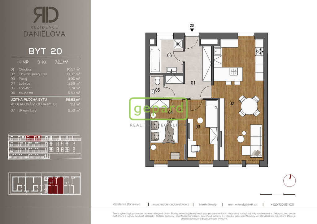 Podlahová plocha bytu činí 72,1 m2 + sklep o velikosti 2,56 m2. Zakázková kuchyňská linka s vestavnými spotřebiči a lednicí, koupelnové vybavení a světla jsou již součástí pronájmu. Byt je situován ve čtvrtém nadzemním podlaží objektu ze čtyřech podlaží a je přístupný bezbariérově, což zajišťuje pohodlné užívání pro všechny. Rozměry místností jsou následující: