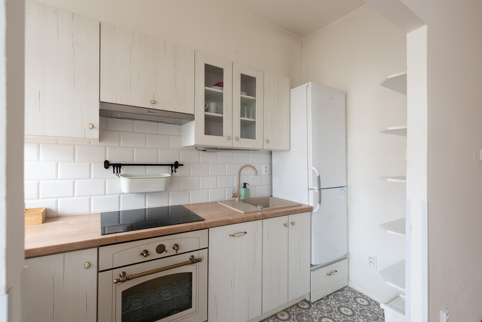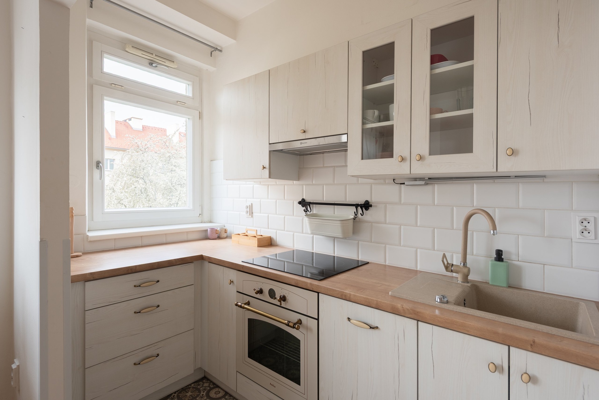 Moderní kuchyňská linka je vybavena myčkou nádobí, troubou, indukční varnou deskou a vestavěnou lednicí.