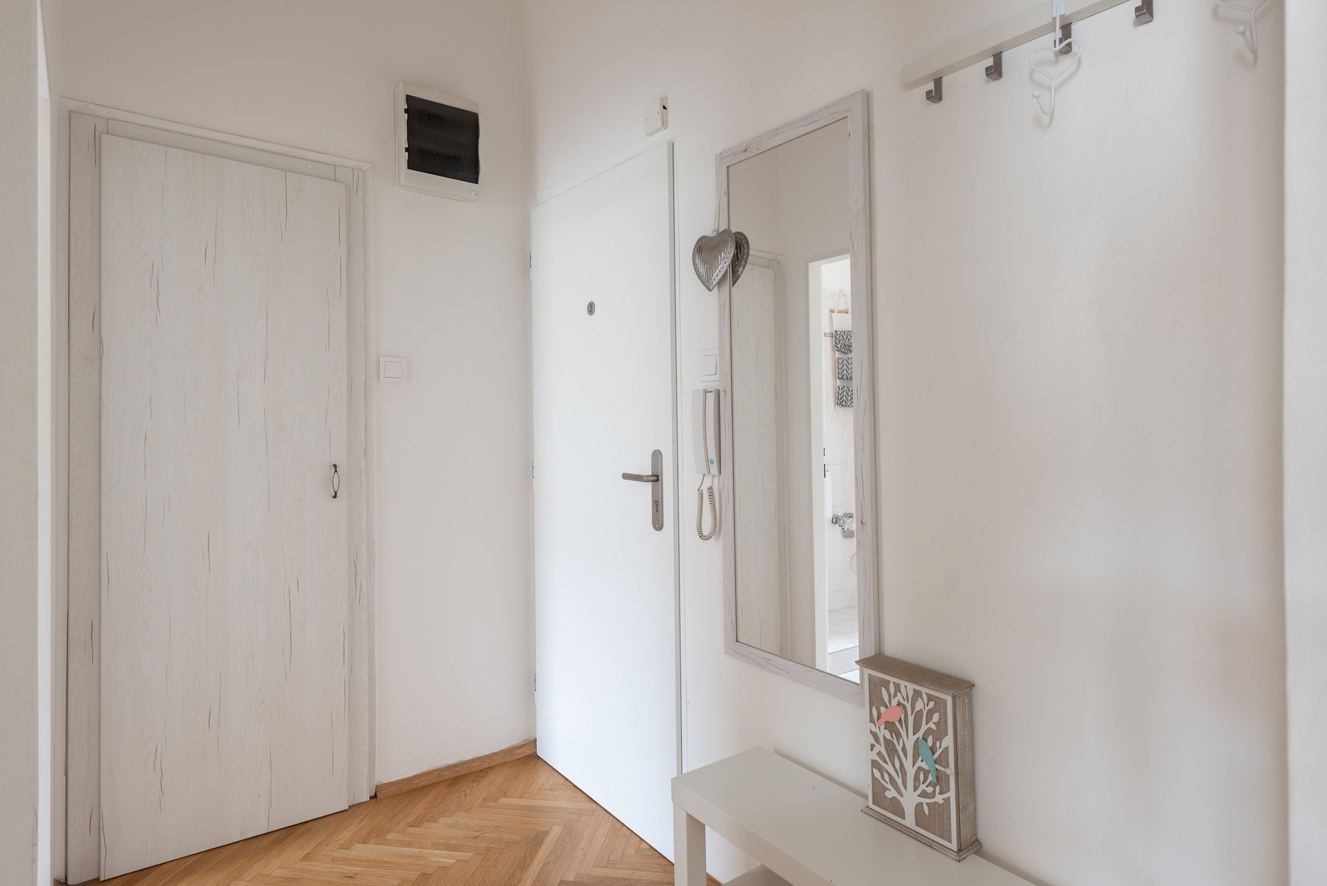 Interiér prošel rekonstrukcí a poskytuje komfortní bydlení. Na podlahách jsou parkety, okna jsou plastová a vytápění je řešeno podlahovým topením. Byt je laděn do elegantních krémových tónů a disponuje vestavěnými skříněmi s dostatkem úložného prostoru. Součástí bytu je také praktická komora. K dispozici je sedačka v obývacím pokoji a postel v ložnici (bez matrace).