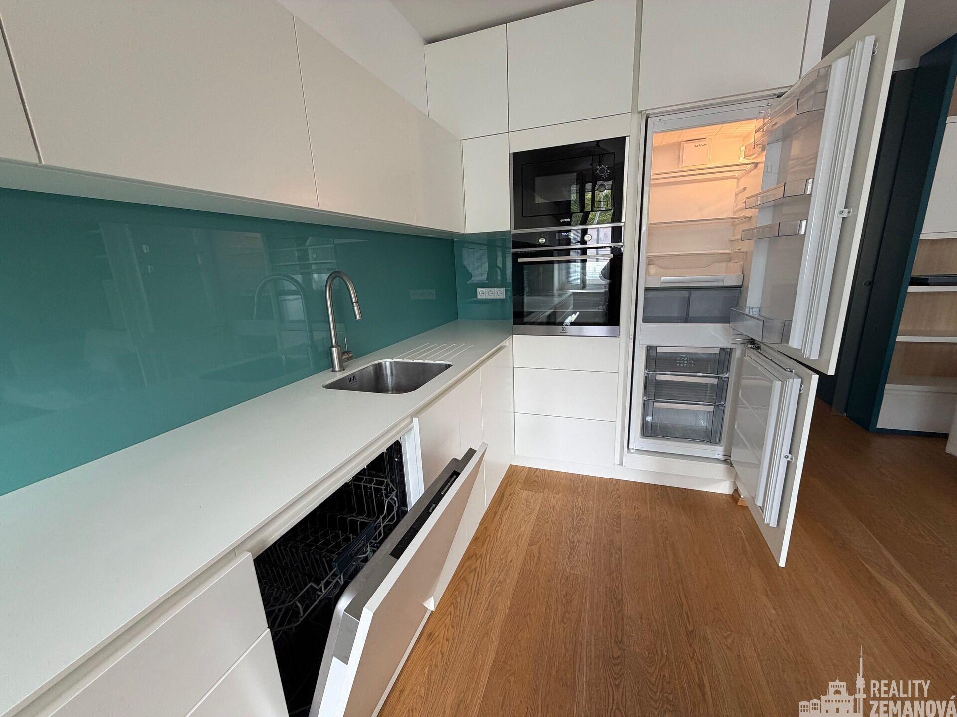 Moderní kuchyně na míru s lakovanou linkou je vybavena kvalitními vestavnými spotřebiči, včetně trouby s pyrolýzou, myčky, lednice s mrazákem a mikrovlnné trouby. Ložnice nabízí nábytek z masivního dubu, který podtrhuje celkový nadčasový charakter bytu. Koupelna je řešena v moderním designu s podomítkovou třícestnou sprchovou baterií.
