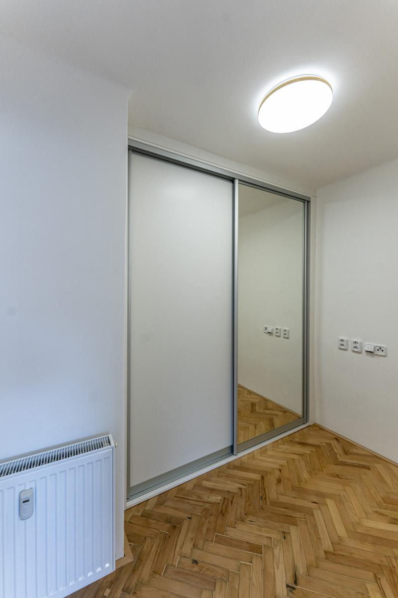 Po vstupu do bytu Vás uvítá chodba, z které se hned dostanete do nově instalované, moderně vybavené kuchyně, která disponuje kuchyňskou linkou s myčkou, plynovým sporákem a elektrickou troubou. Následují dva prostorné pokoje, které jsou umístěny vedle kuchyně a jsou propojené dveřmi, přičemž každý pokoj má i samostatný vstup z chodby. V pokojích je krásná renovovaná dřevěná podlaha, zatímco v kuchyni a na chodbě je položena elegantní dlažba. Po levé straně vstupní chodby se nachází praktická komora a samostatná toaleta. Koupelna je vybavena sprchovým koutem a je průchozí, za ní se nachází šatna s velkou vestavěnou skříní a vstupem do zadní ložnice. Tato šatna může být využita nejen jako úložný prostor, ale také do ní lze umístit malý stůl a využívat jako pracovní koutek, případně místo pro kreativní činnosti nebo relaxaci.