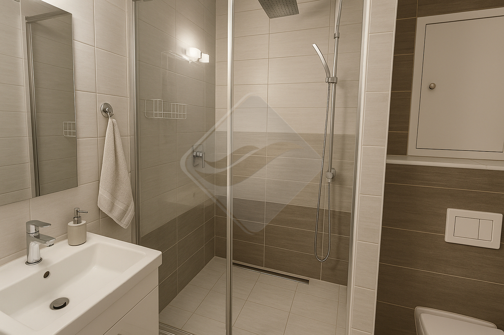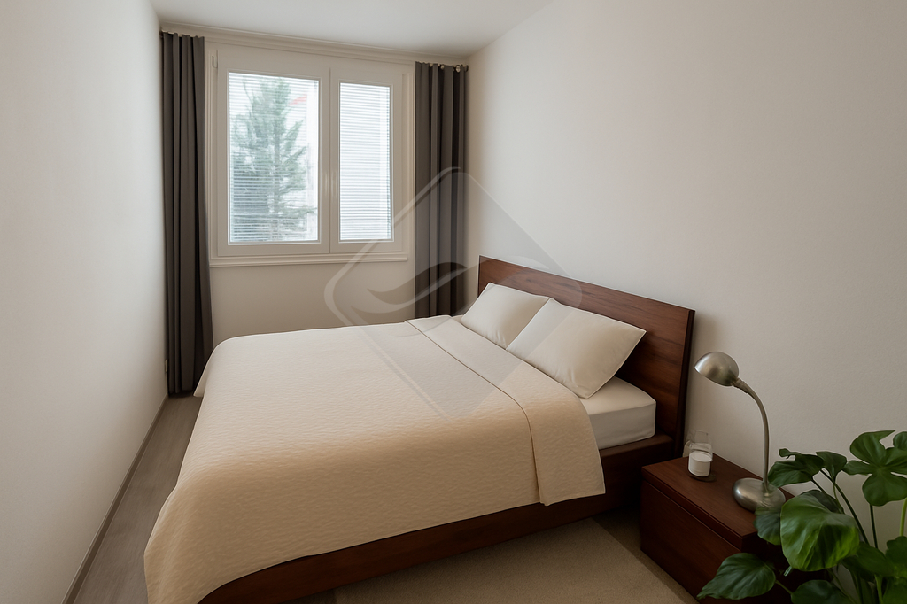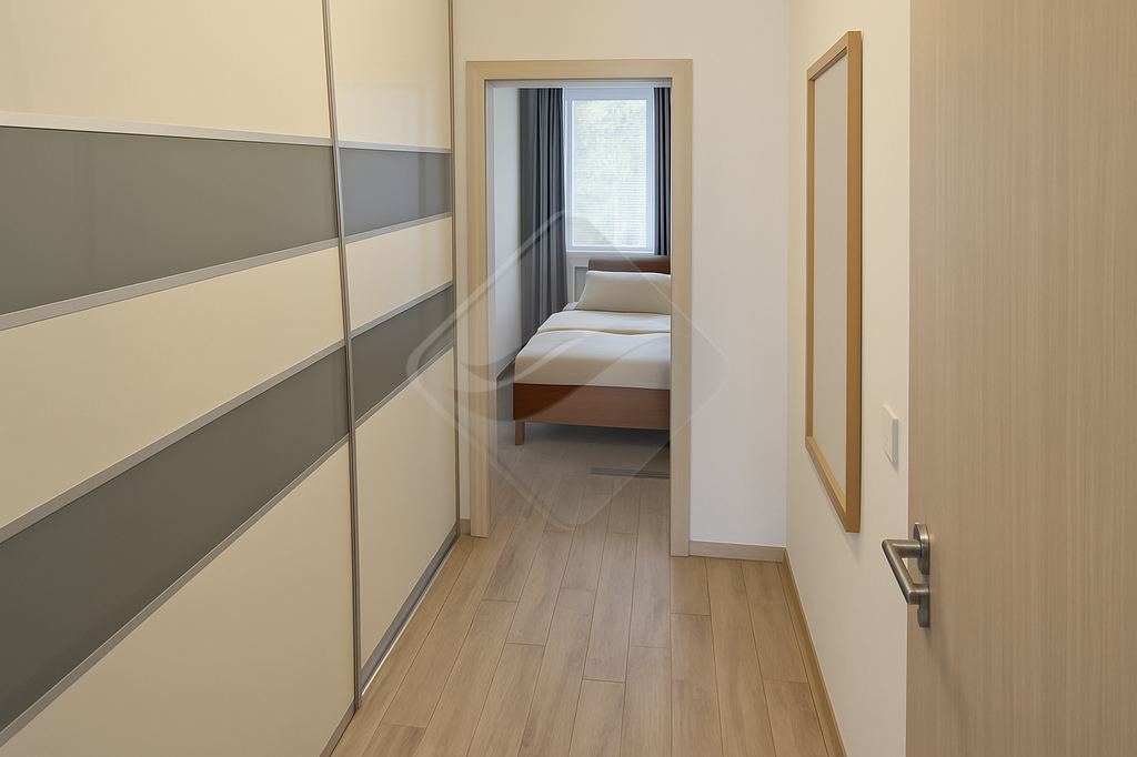 Podlahové krytiny v bytě tvoří kombinace plovoucí podlahy a dlažby, které dotvářejí elegantní vzhled. K bytu náleží také komora přímo na patře, která poskytuje další úložný prostor.
