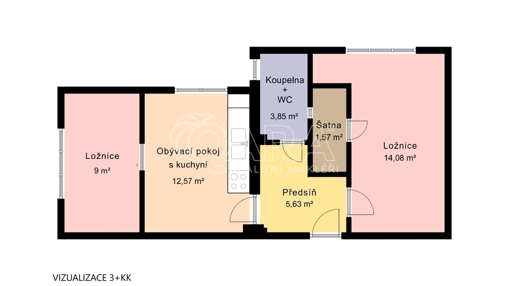 Skladba: Předsíň, prostorný obývací pokoj s kuchyňským koutem s možností rozdělení, ložnice s komorou, koupelna s toaletou a vlastním oknem.