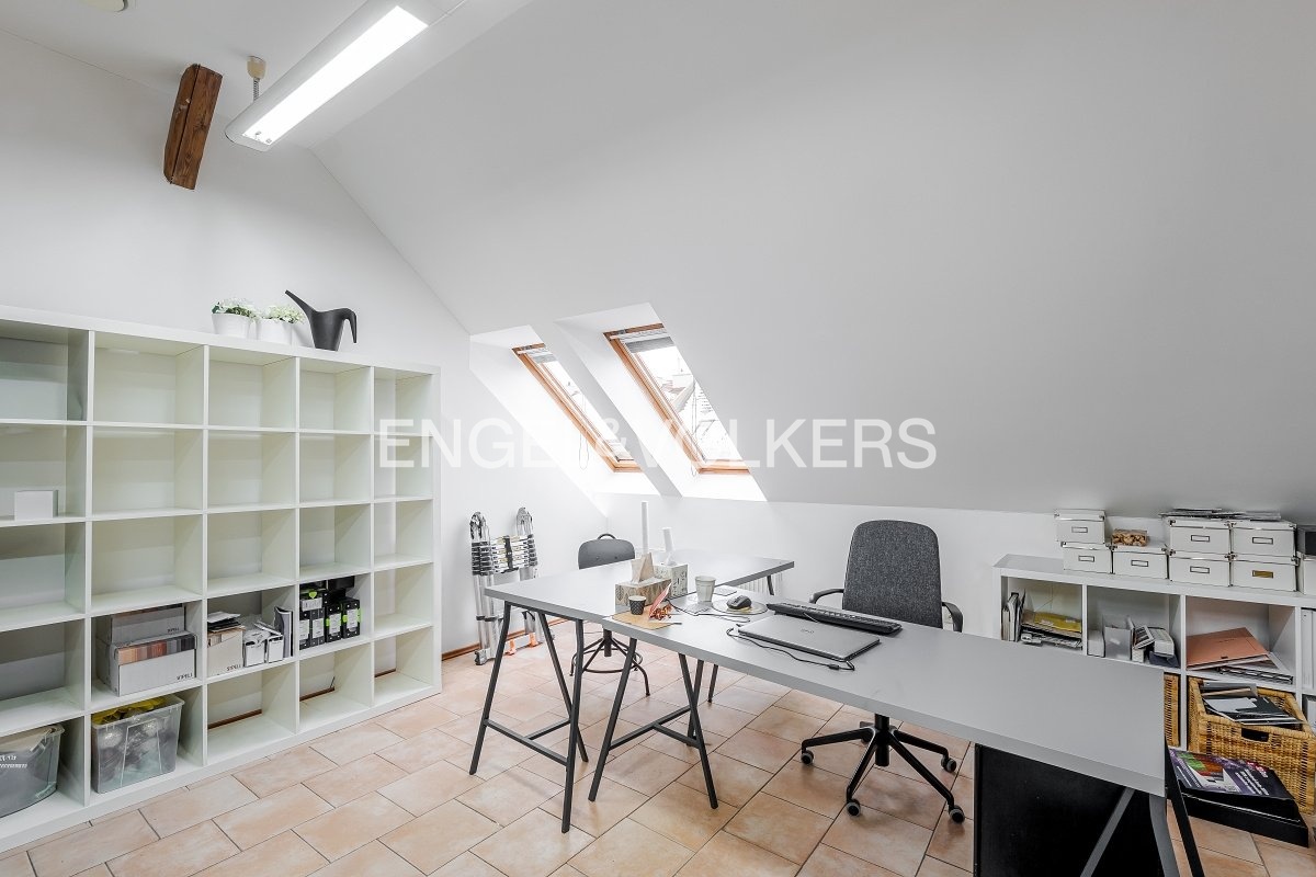 K pronájmu nabízíme atraktivní kancelářský prostor v žádané lokalitě na Jagellonské ulici na pražských Vinohradech. Jedná se o frekventovanou část této rezidenční čtvrti s výbornou dopravní dostupností a kompletní občanskou vybaveností. Přístup do kanceláře je řešen vstupem z domu přes společnou chodbu, přičemž v budově je k dispozici výtah. Samotný prostor je situován v podkroví a na první pohled zaujme svým charakterem s přiznaným krovem. Dispozice je řešena jako open-space s praktickou dlažbou na podlaze, přičemž dostatek denního světla zajišťují dřevěná dvousklá střešní okna opatřená horizontálními kovovými žaluziemi pro snadnou regulaci svitu.