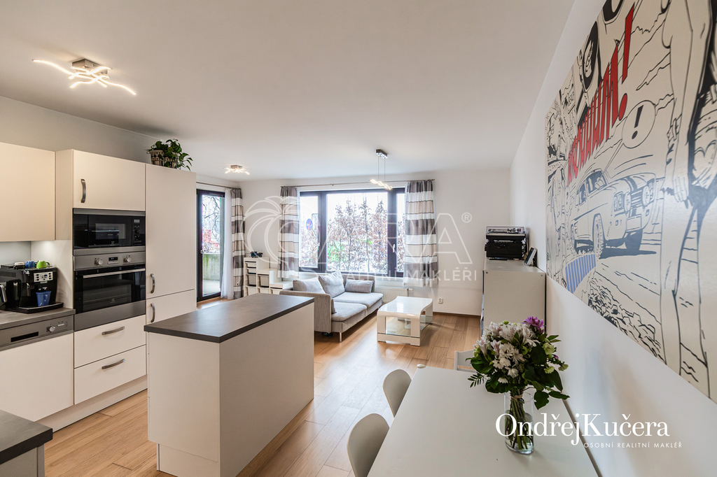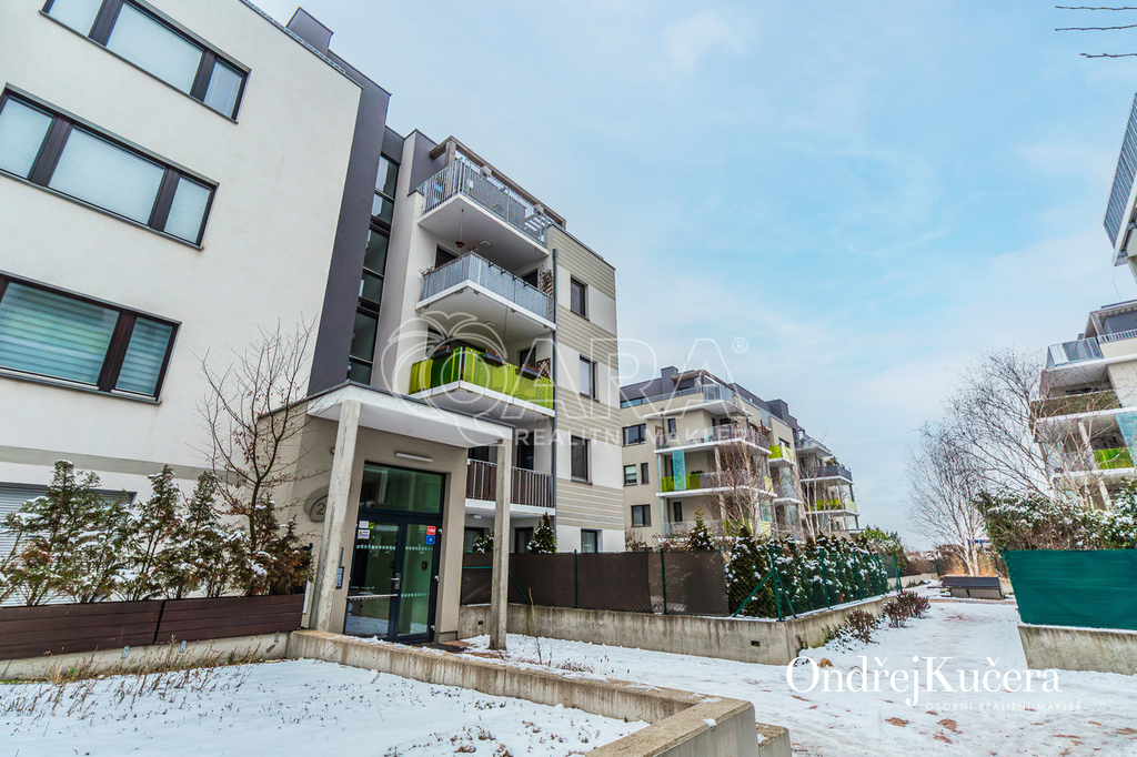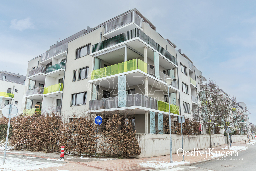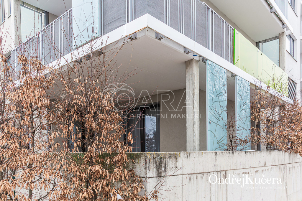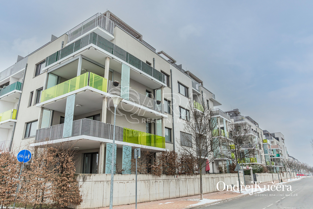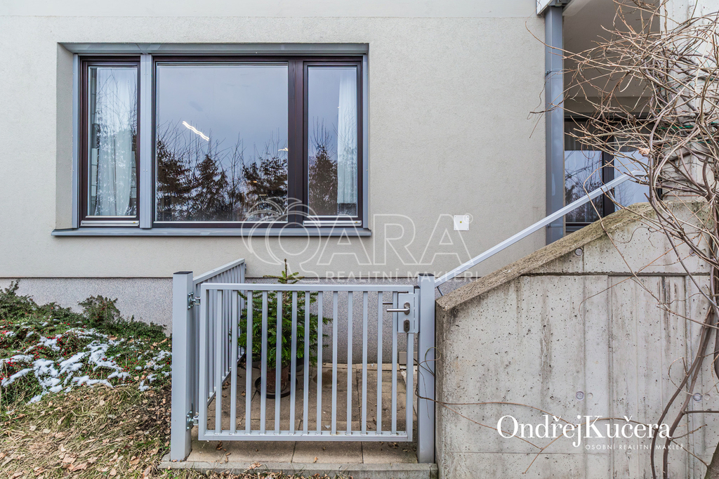 Tento byt o ploše 100 m2 a s celkovou výměrou 188 m2 včetně příslušenství (bez sklepa a garážových stání) se nachází ve zvýšeném přízemí nízkoenergetické novostavby z roku 2017. Je vybavený klimatizací pro komfortní bydlení. Dominantou bytu je světlý obývací pokoj s plně vybaveným kuchyňským koutem a prakticky umístěným ostrůvkem na práci i vaření. Na něj navazuje hlavní ložnice, která má vlastní koupelnu s toaletou a sprchovým koutem. Další dva samostatné pokoje jsou v zadní části bytu a lze je využít jako dětské pokoje, pracovnu nebo pokoj pro hosty. Hlavní terasa obklopuje celý byt a je přístupná z několika pokojů. Z terasy je dále vstup na soukromou zahradu. Díky velkým oknům a přímému vstupu na terasu a zahradu je prostor krásně vzdušný a světlý. Po vstupu do bytu vás přivítá prostorná předsíň s místem pro vestavěné skříně. Hned u vstupu je prakticky umístěna druhá samostatná toaleta. Další koupelna s vanou je pak v zadní části bytu, kde se nachází i prostorná komora. K bytu také náleží prostorný sklep 4,4 m2 a dvě parkovací stání v suterénu domu s kamerovým systémem.