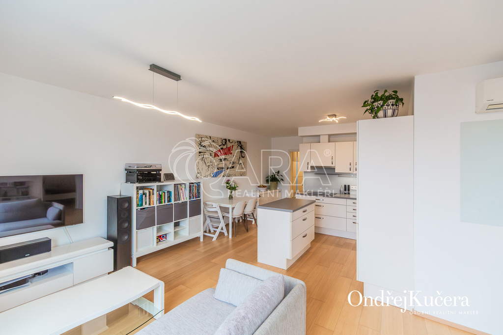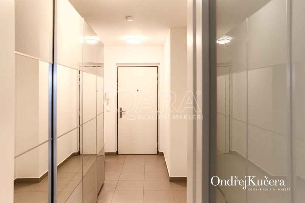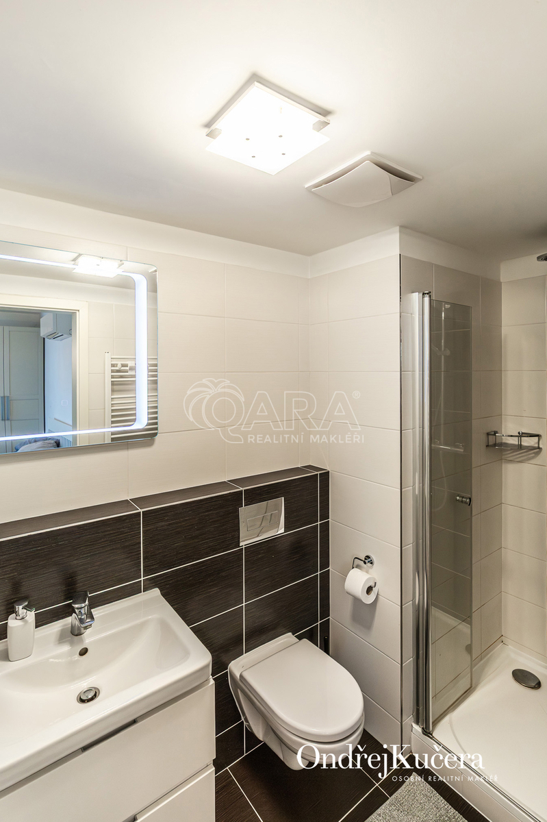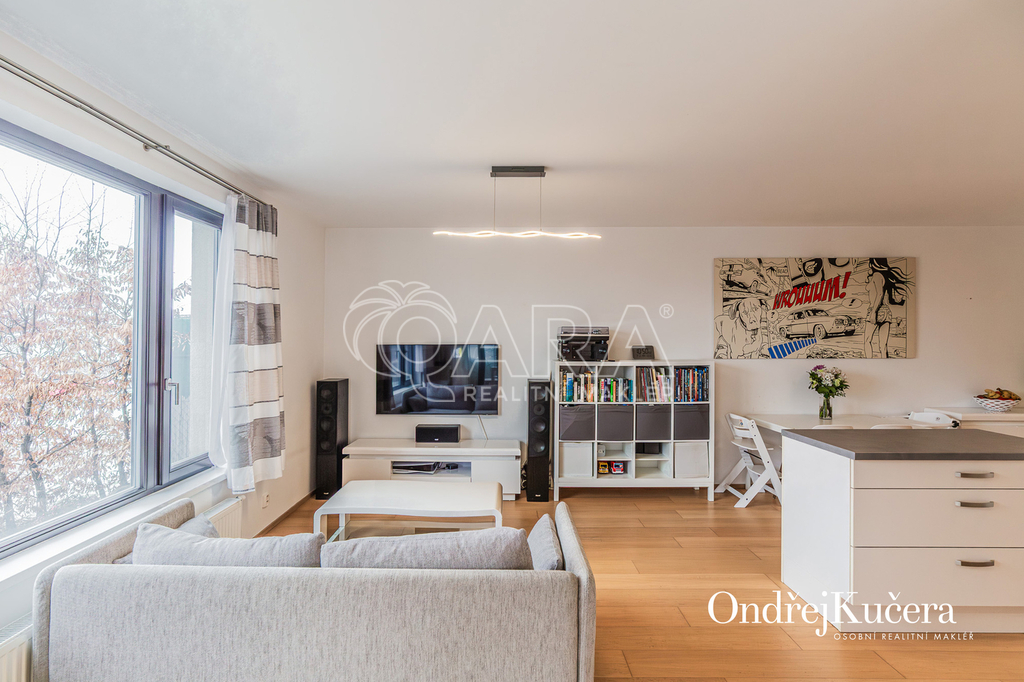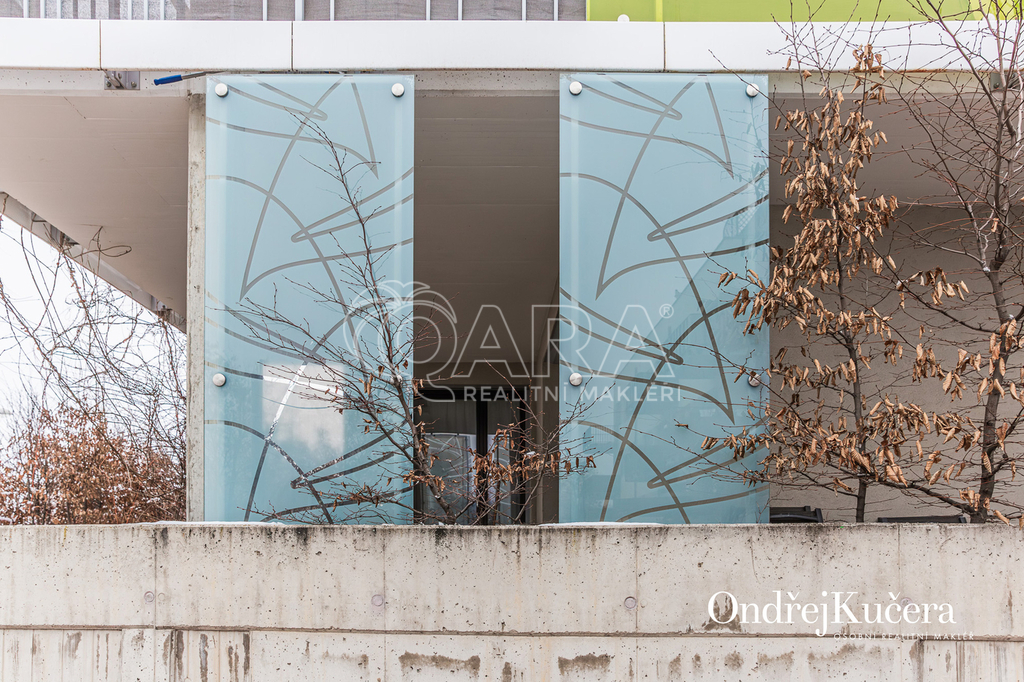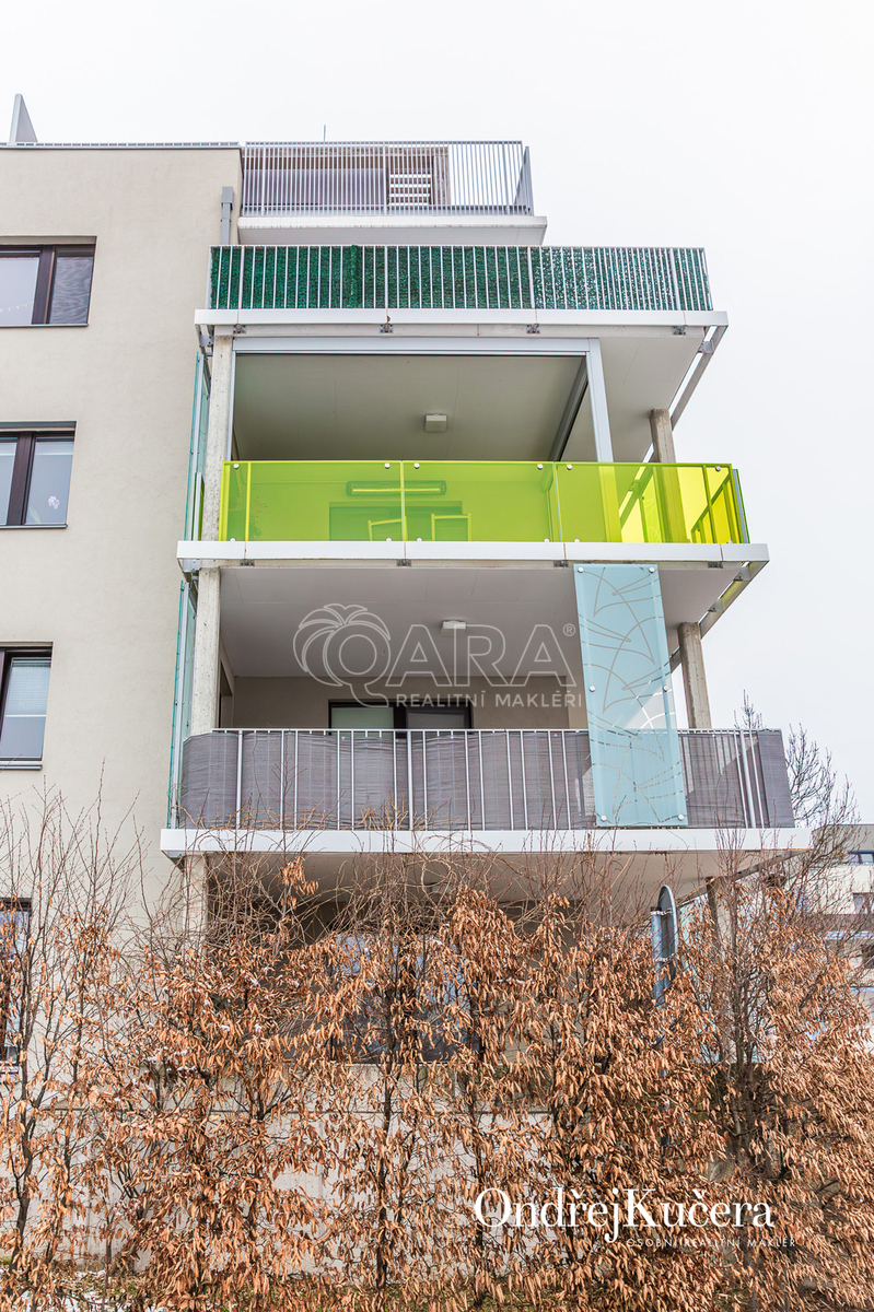 Tento byt o ploše 100 m2 a s celkovou výměrou 188 m2 včetně příslušenství (bez sklepa a garážových stání) se nachází ve zvýšeném přízemí nízkoenergetické novostavby z roku 2017. Je vybavený klimatizací pro komfortní bydlení. Dominantou bytu je světlý obývací pokoj s plně vybaveným kuchyňským koutem a prakticky umístěným ostrůvkem na práci i vaření. Na něj navazuje hlavní ložnice, která má vlastní koupelnu s toaletou a sprchovým koutem. Další dva samostatné pokoje jsou v zadní části bytu a lze je využít jako dětské pokoje, pracovnu nebo pokoj pro hosty. Hlavní terasa obklopuje celý byt a je přístupná z několika pokojů. Z terasy je dále vstup na soukromou zahradu. Díky velkým oknům a přímému vstupu na terasu a zahradu je prostor krásně vzdušný a světlý. Po vstupu do bytu vás přivítá prostorná předsíň s místem pro vestavěné skříně. Hned u vstupu je prakticky umístěna druhá samostatná toaleta. Další koupelna s vanou je pak v zadní části bytu, kde se nachází i prostorná komora. K bytu také náleží prostorný sklep 4,4 m2 a dvě parkovací stání v suterénu domu s kamerovým systémem.