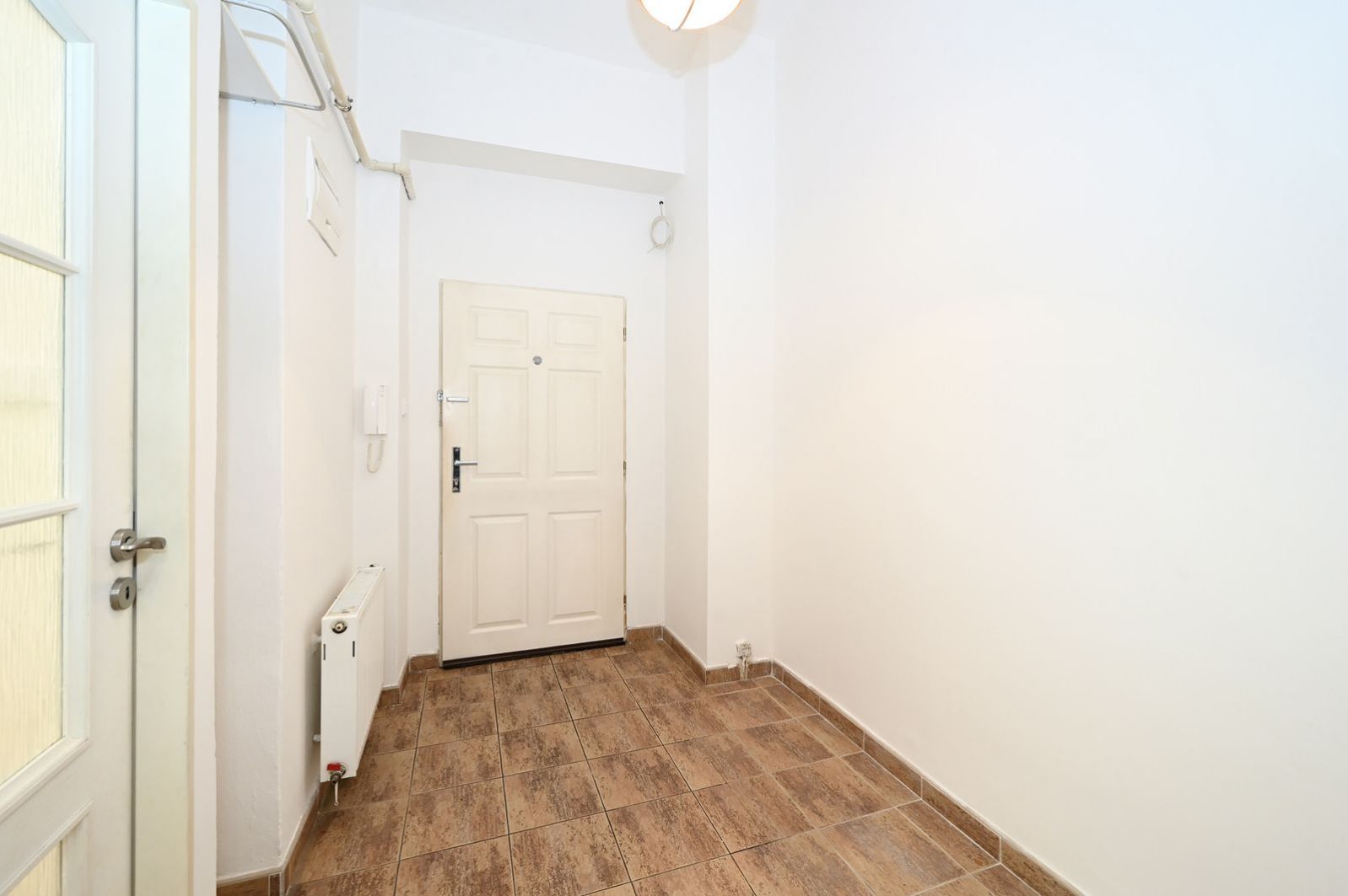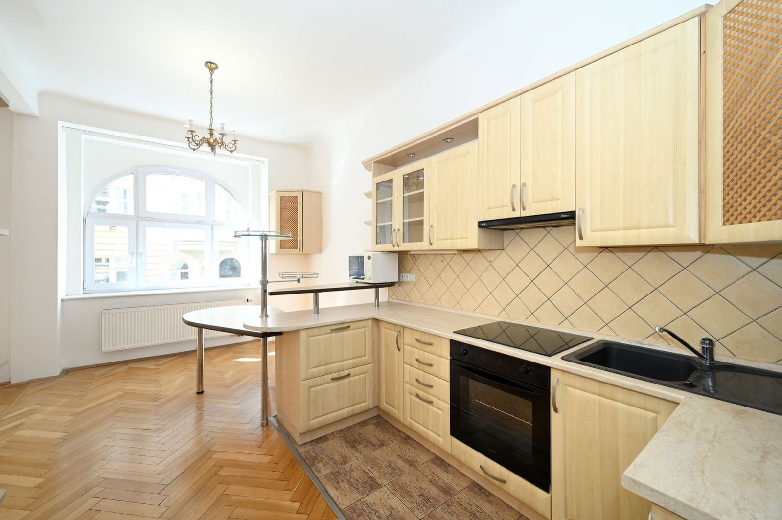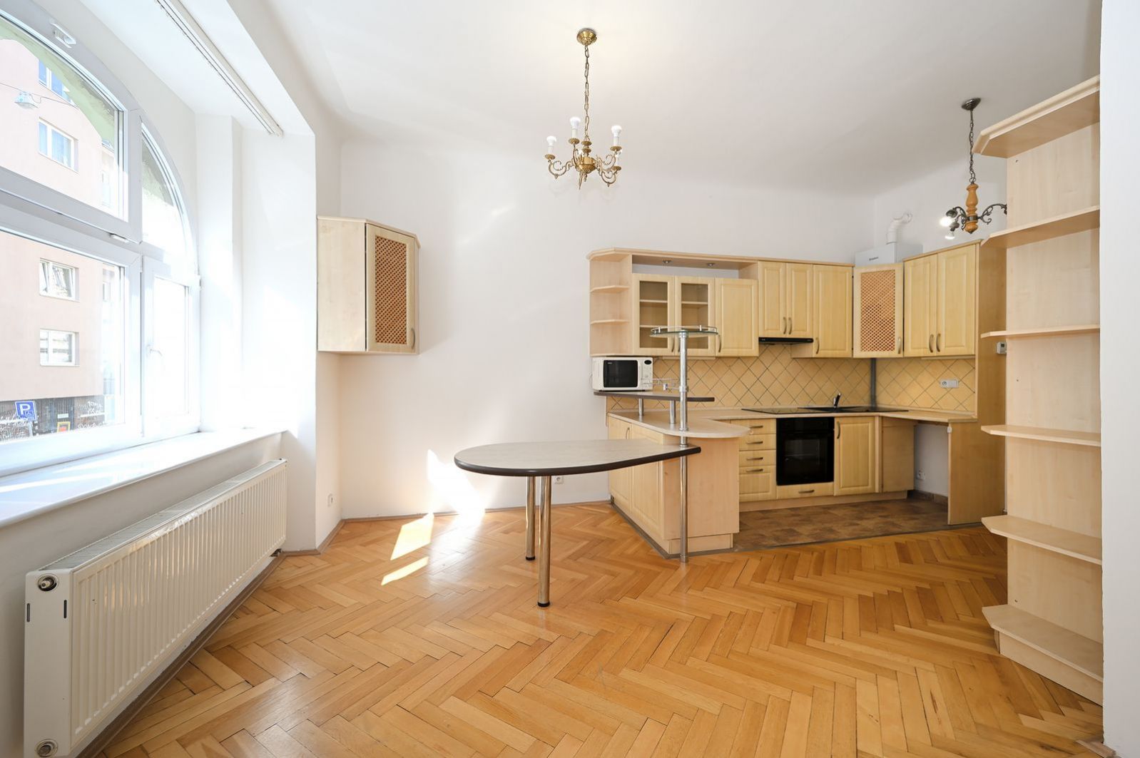 Samotný byt nabízí velkorysý obytný prostor s dostatkem místa pro obývací část i spaní. Díky velkým oknům a vysokým stropům je interiér velmi světlý a působí vzdušným dojmem. Na podlahách jsou dřevěné parkety, které podtrhují charakter celého bytu.