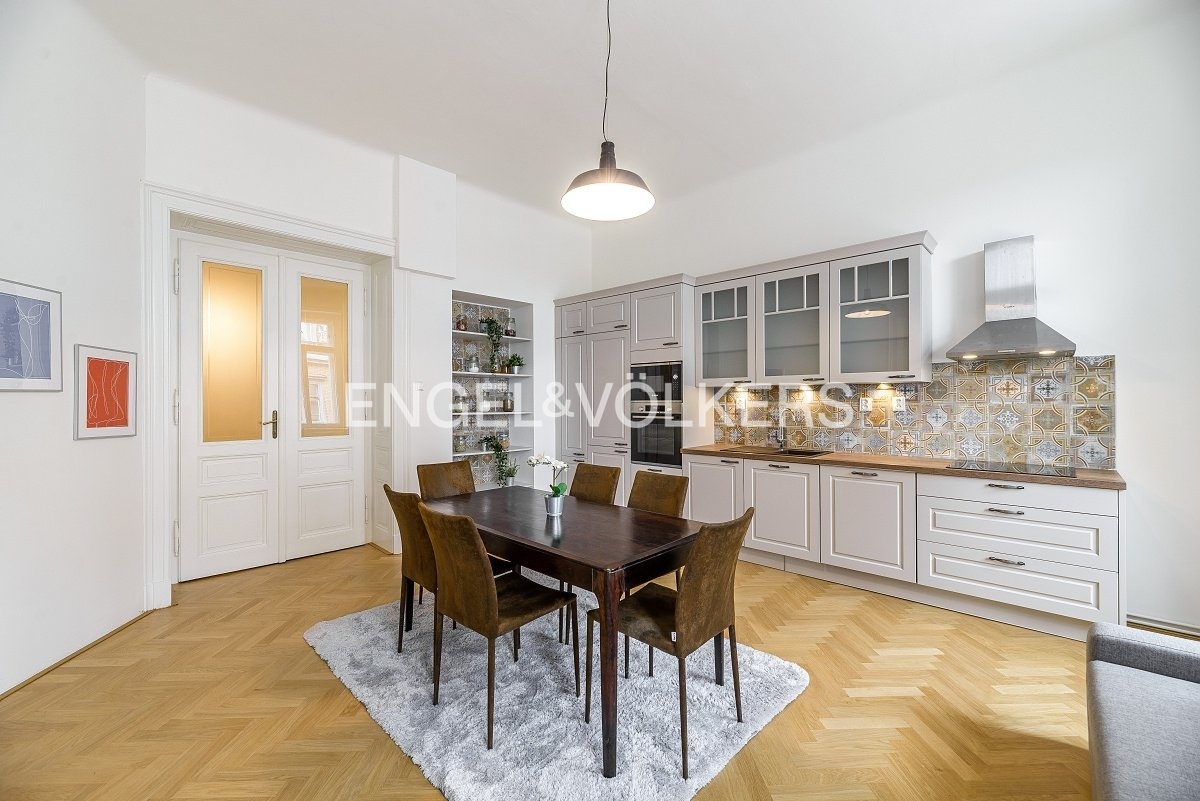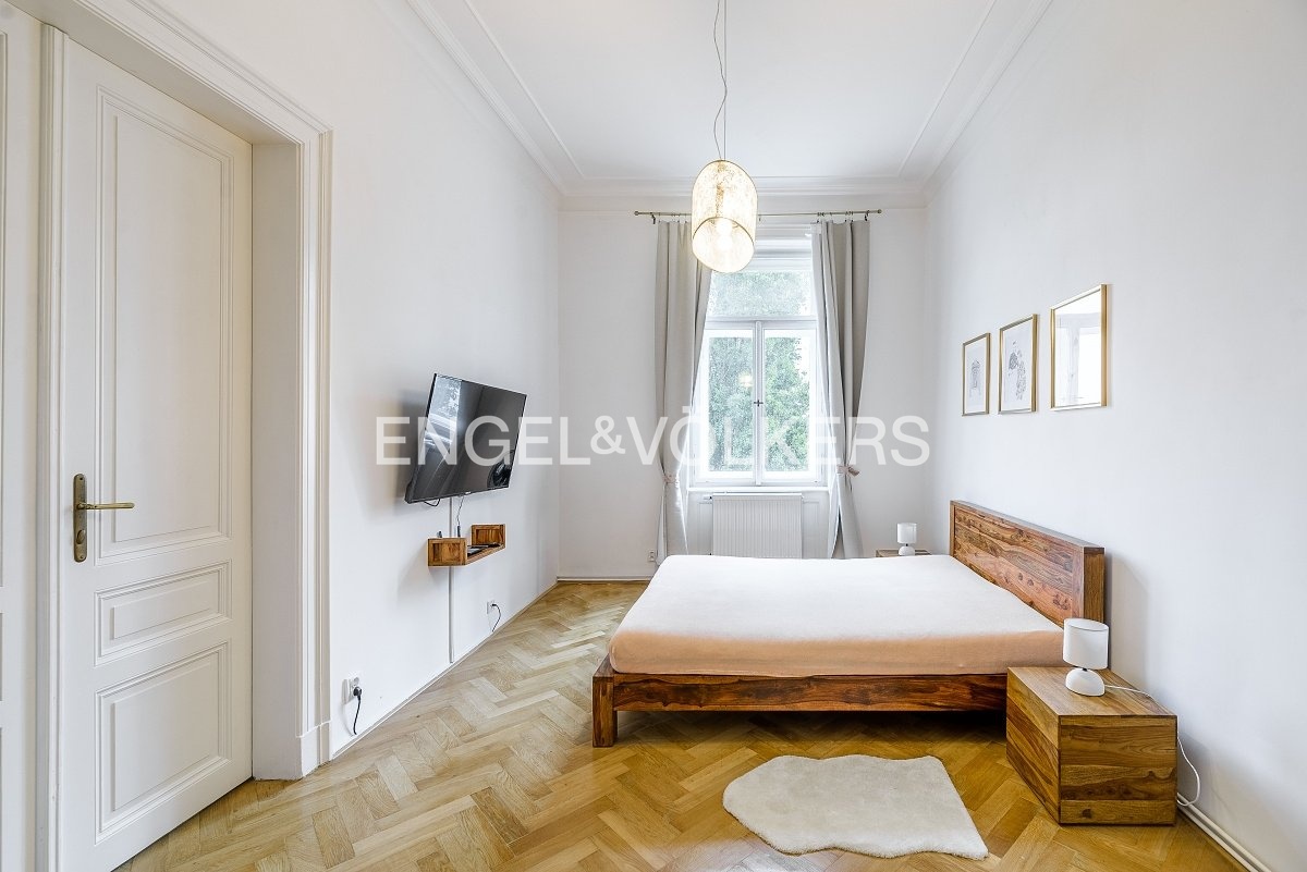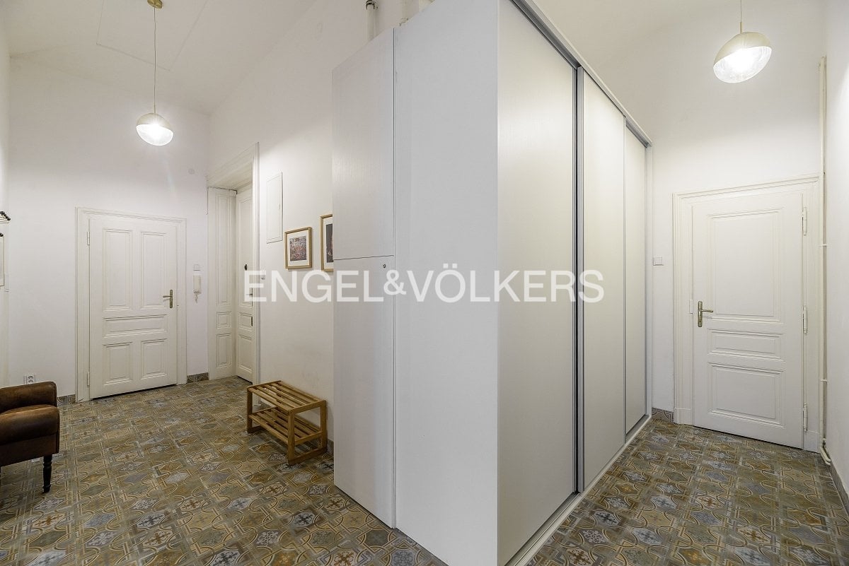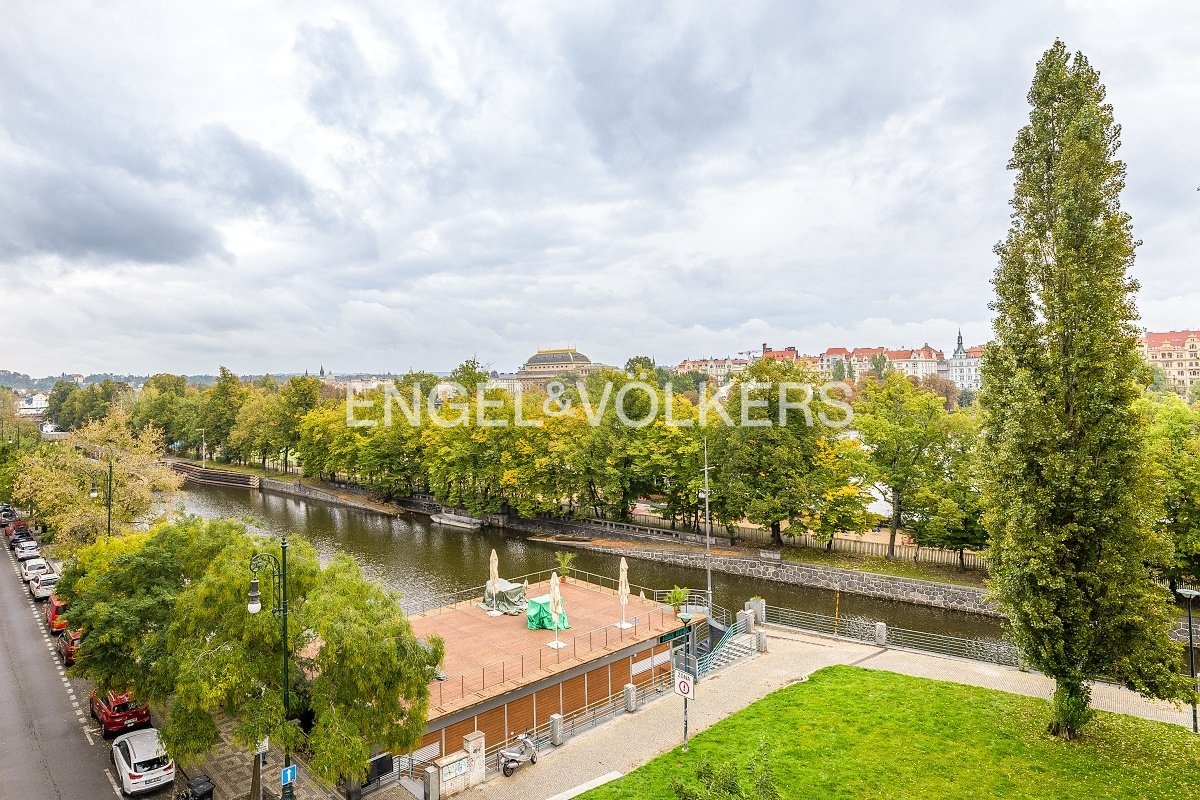V historickém činžovním domě s výtahem v blízkosti Malé Strany je k dispozici byt s výhledem na Národní divadlo a Tančící dům.