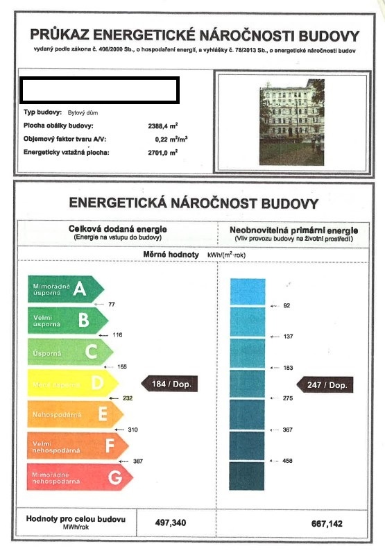Ukazatel energetické náročnosti budovy:184 kWh/m²