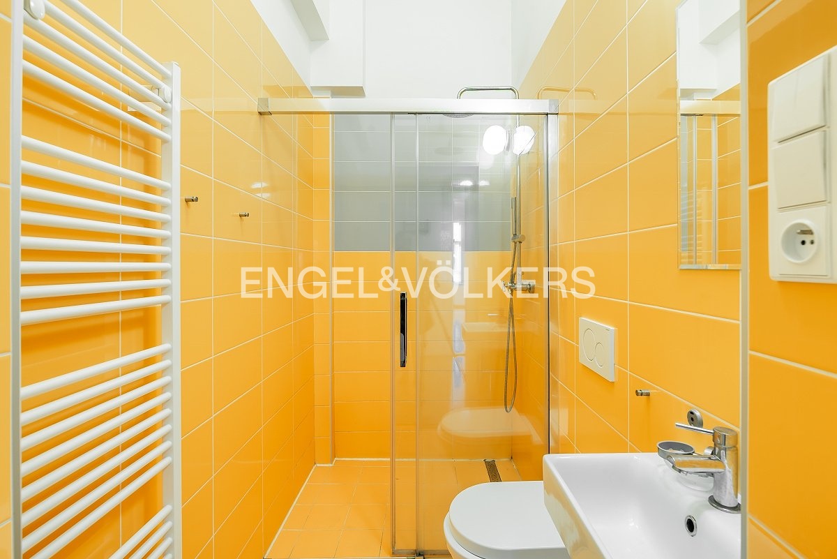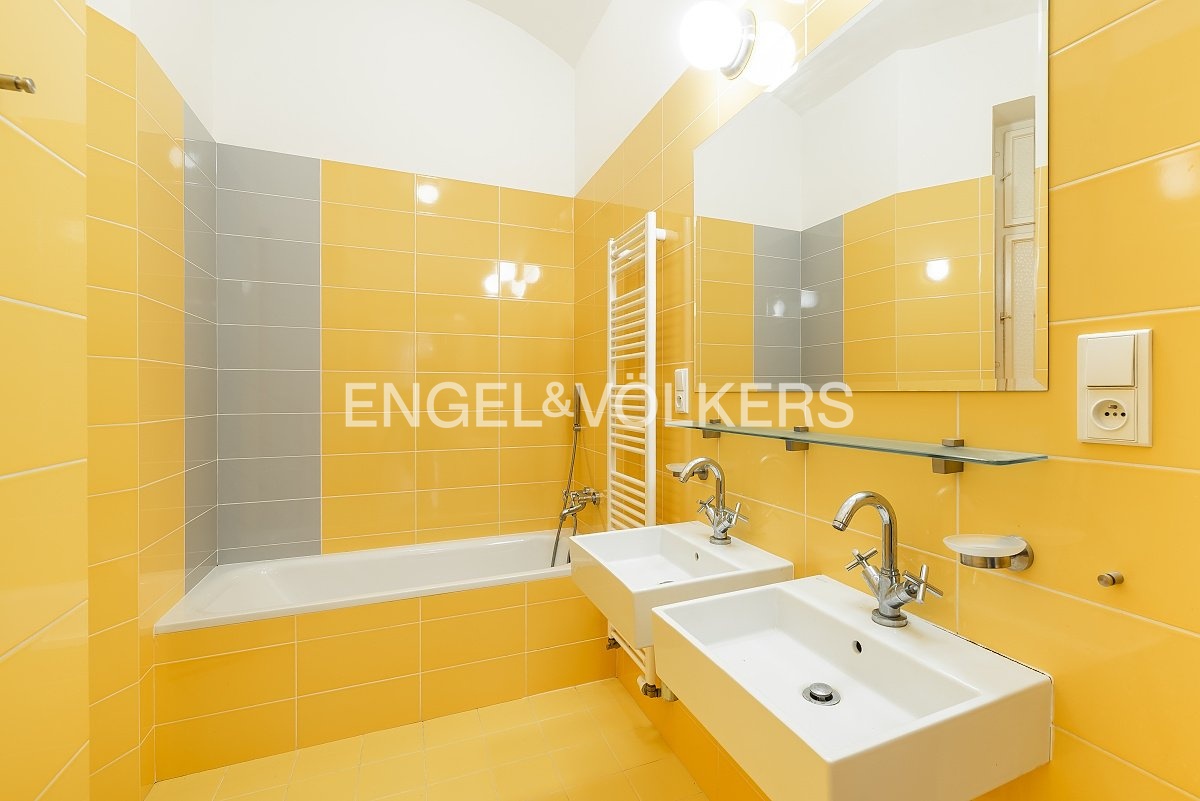 Dispozici tvoří světlý obývací pokoj, samostatná kuchyň plně vybavená spotřebiči, dvě ložnice a dvě koupelny – jedna s vanou a toaletou, druhá se sprchovým koutem. V interiéru byly zachovány původní detaily, jako jsou dřevěné podlahy, zdobené stropy a špaletová okna. Byt se pronajímá nezařízený.