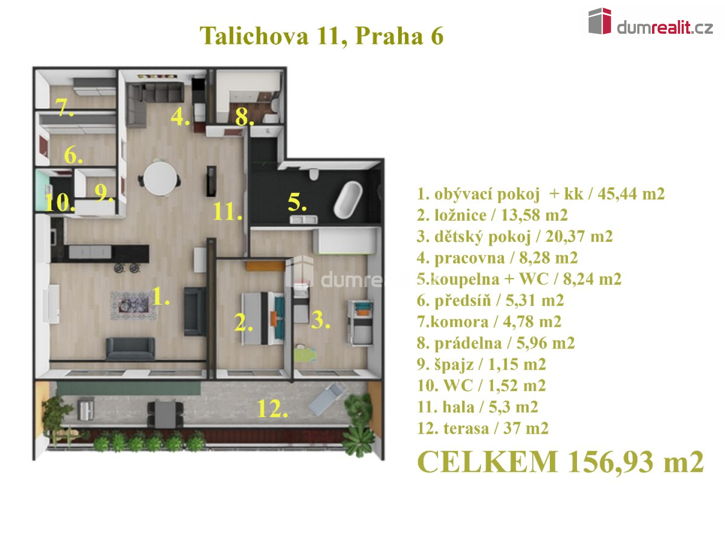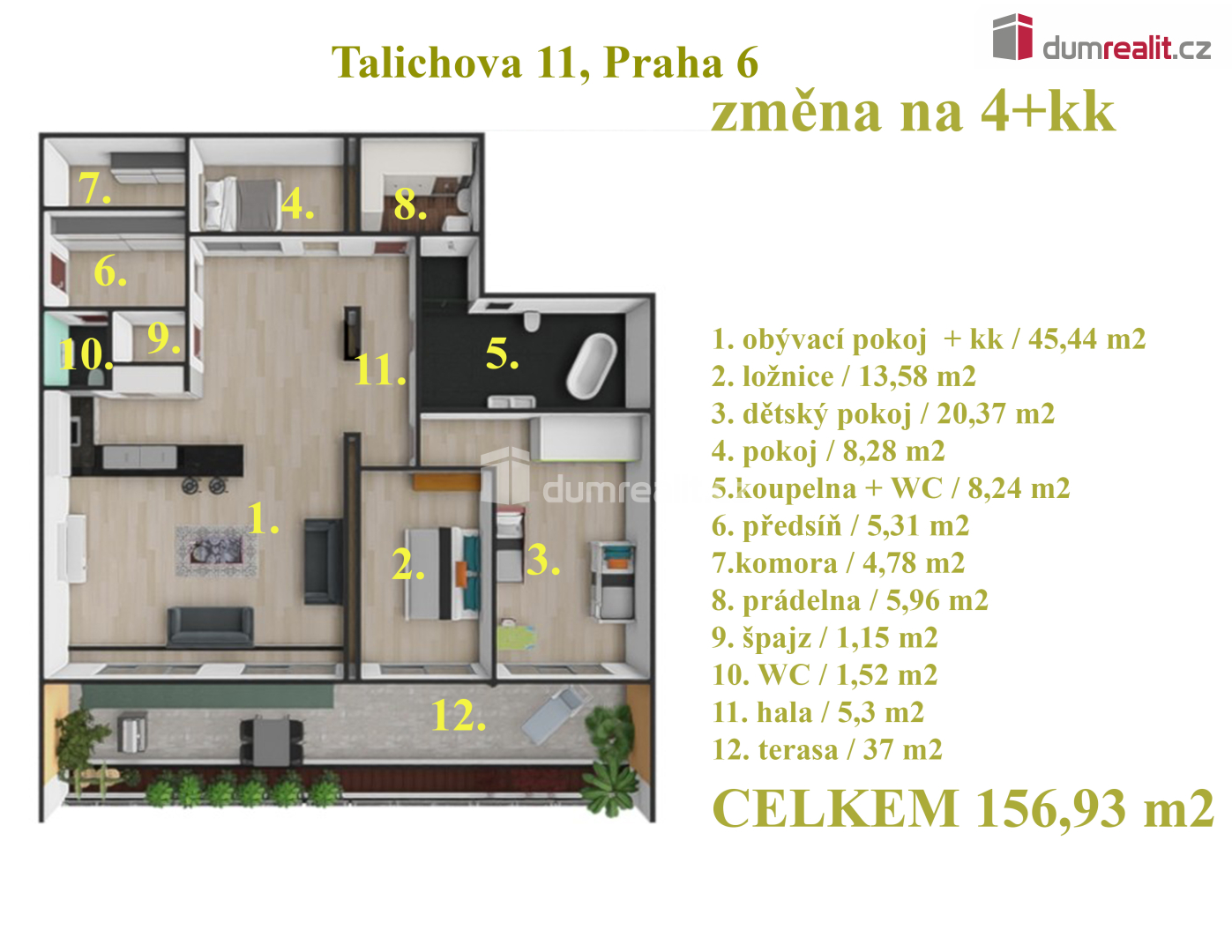Hledáte byt 3+kk po nákladné rekonstrukci s velkou terasou, ideálně v Praze 6, v Top lokalitě? Mám zde pro vás exkluzivní nabídku kompletně zrekonstruovaného bytu 3+kk (120 m²) s terasou (37 m²) v Praze 6 – Břevnov, ulice Talichova, v docházkové vzdálenosti od parku Břevnovská klášterní zahrada. Tento byt byl v roce 2013 kompletně zrekonstruován a je v TOP stavu – kompletní interiéry vč. změny dispozice na 3+kk (lze předělat na 4+kk), podlahy, vstupní dveře, interiérové dveře, plastová okna – trojskla, topení – konvektory, elektrika, koupelna + WC, kuchyně + spotřebiče a terasa. Dispozici tohoto moderního bytu 3+kk (120 m²) tvoří: prostorný obývací pokoj prakticky spojený s kuchyní (45,44 m²) a se vstupem na terasu (37 m²) s výhledem do zeleně – orientace jihovýchod, s jídelním koutem s prostorem pro odpočinek (8,28 m²), ložnice (13,58 m²) se vstupem na terasu, dětský pokoj (20,37 m²) také se vstupem na terasu, předsíň (5,31 m²), velká komora (4,78 m²), spíž (1,15 m²), hala (5,3 m²), prádelna s prostorem na pračku/ sušičku a umyvadlem (5,96 m²), velká koupelna (8,24) m² s volně stojící vanou, sprchovým koutem a umyvadlem. Ve velké kuchyni od společnosti Sykora je vestavěná lednice s mrazákem, varná deska, 2 x digestoř s odtahem mimo byt, myčka, vestavěná trouba, parní trouba a vinotéka. Pracovní deska je z umělého kamene technistone. Byt lze předělat na 4+kk velmi jednoduše – viz 3d plánky. Vytápění bytu je centrální dálkové, SVJ nemá úvěr, výtah, střecha, stoupačky, zateplení domu jsou po rekonstrukci. Vstup do bytu v tomto kaskádové domě je bezbariérový, je z ulice Talichova, v 8.patře je výtah, byt je umístěn ve 3. patře domu. Byt je volný ihned, je v osobním vlastnictví, v rámci služeb RK Vám zařídíme exkluzivní hypoteční úvěr. V okolí bytu je absolutní klid, 1 minutu od domu je park (Břevnovský Klášter), zastávka MHD (Bus – Talichova nebo Radimova 2 minuty od domu; tramvaj do centra ze zastávky Vojenská nemocnice nebo U Kaštanu), nemocnice ÚVN, školy, školky, obchod Billa je přímo pod domem. Velmi doporučuji všem, kteří hledají nový domov v Praze 6 - Břevnov a požadují byt v TOP stavu. Tento prostorný byt 3+kk (120 m²) s terasou (37 m²) vás chytne za srdce. Kompletní webová prezentace s více fotkami z bytu je na našich stránkách. Ev. číslo: 652731.