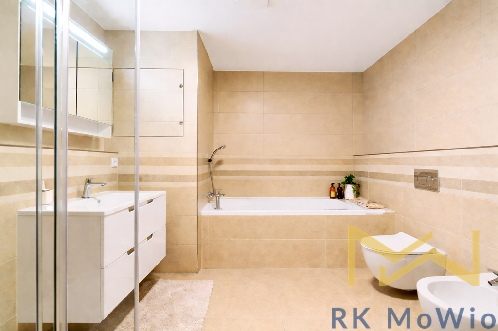 Vybavení bytu zahrnuje kuchyňskou linku se spotřebiči (sklokeramická varná deska, trouba, lednice s mrazákem, myčka, mikrovlnná trouba), vestavěné skříně, kompletní nábytek včetně sedací soupravy, jídelního stolu a postelí, přípojka pro pračku a plynový kotel. Interiér je plně zařízen a připraven k okamžitému nastěhování. K bytu náleží sklep a parkovací stání v podzemních garážích, které je již zahrnuto v ceně nájmu.
