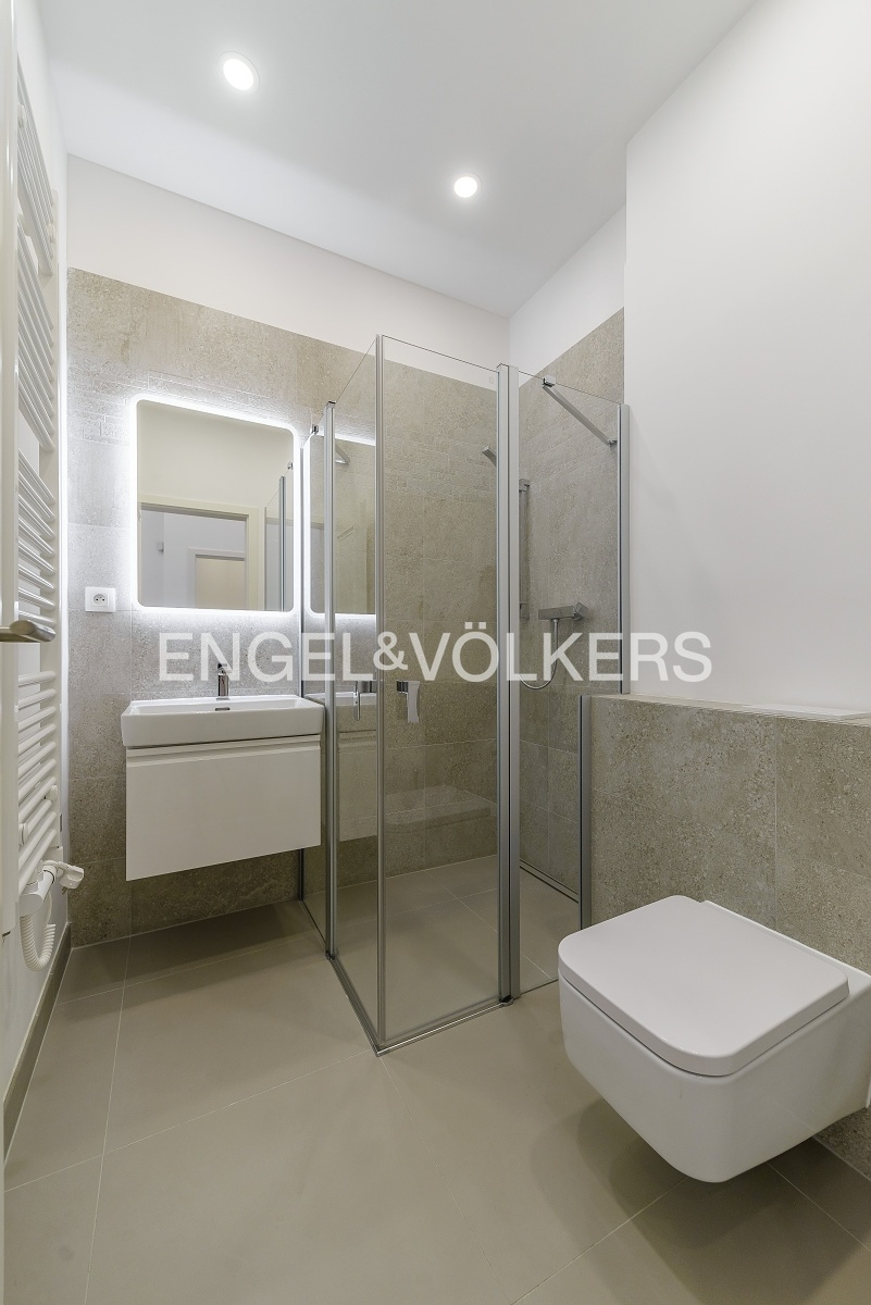 Praktická dispozice tohoto bytu nabízí vstupní místnost, dvě neprůchozí ložnice přičemž jedna s en-suite koupelnou s vanou, toaletou a bidetem. Druhá koupelna s toaletou a sprchovým koutem.