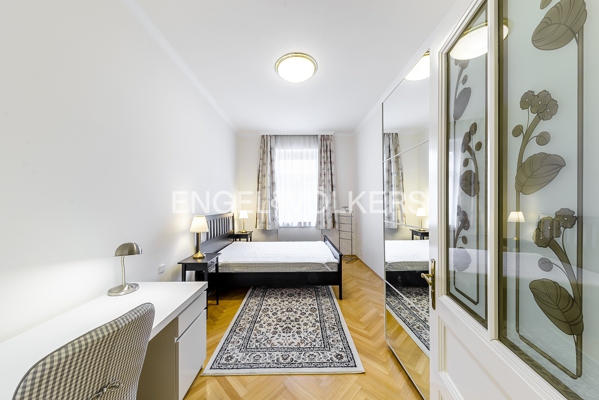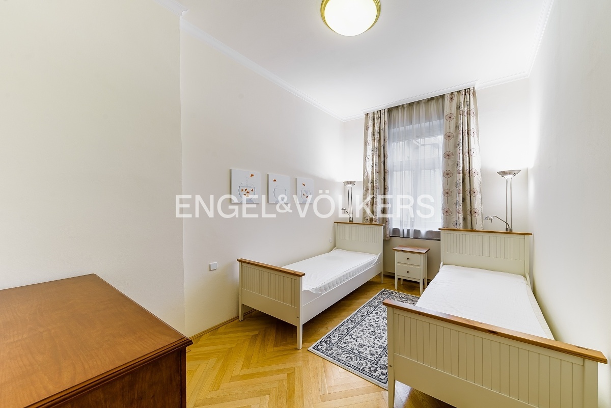 Moderní a kompletně vybavený byt s dispozicí 4+1 v 5. podlaží historického činžovního domu na Rašínově nábřeží poskytující unikátní výhledy na Vltavu a Hradčany. Srdcem bytu je prostorný obývací pokoj se vstupem na balkon. Kuchyně je oddělená a kompletně zařízená vestavěnými spotřebiči. Apartmán má tři ložnice orientované do tichého vnitrobloku. Tři koupelny, v kombinacích s vanou, sprchovým koutem a bidetem. Prostorná vstupní hala, dvě šatny a technická místnost. V domě je výtah. Byt se pronajímá kompletně vybavený nábytkem. Satelitní anténa s programy dle přání klienta. Internet a telefonní linka je již zahrnuta v poplatcích. Kompletní zálohy na energie a služby spojené s bytem jsou 10 000 Kč.
