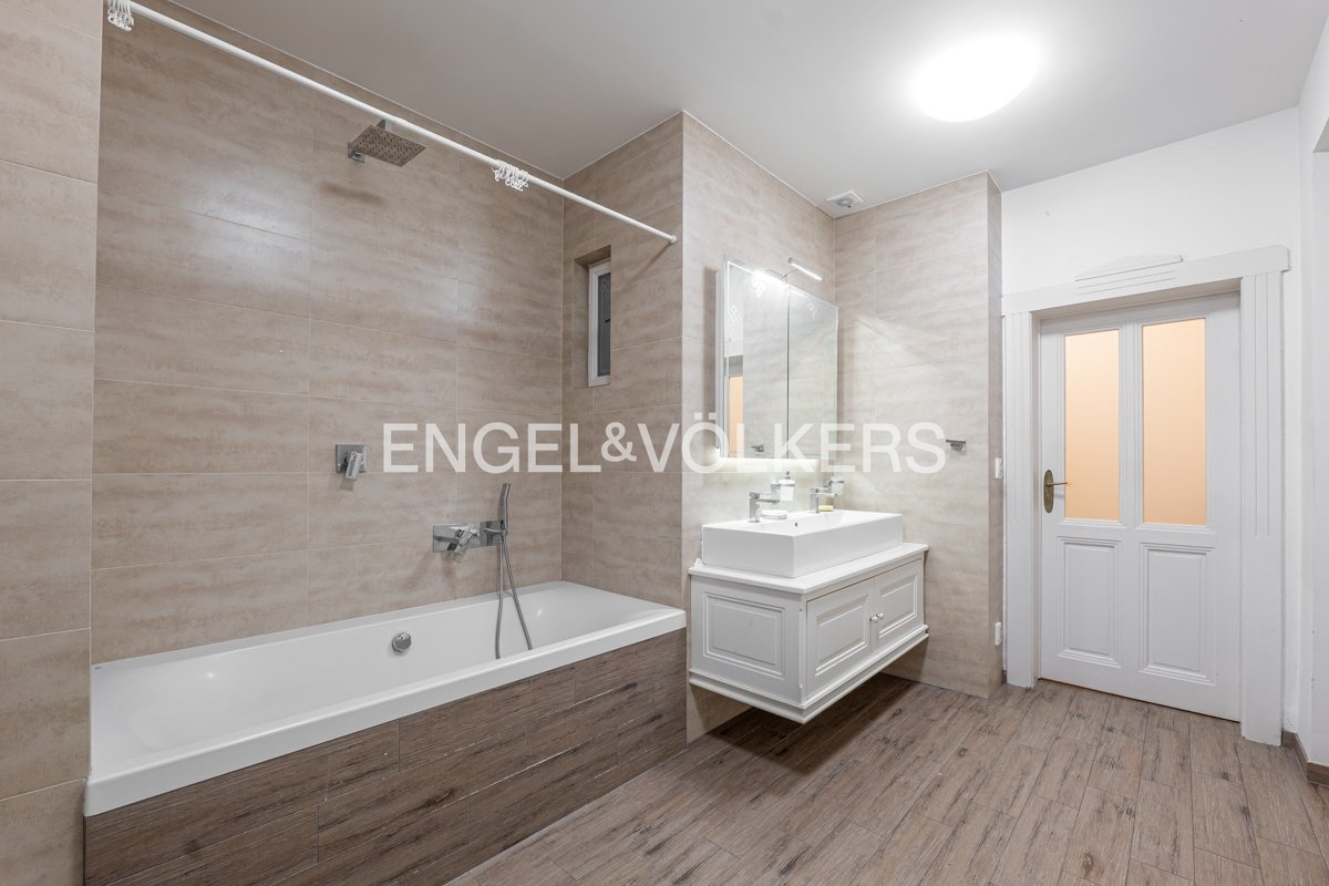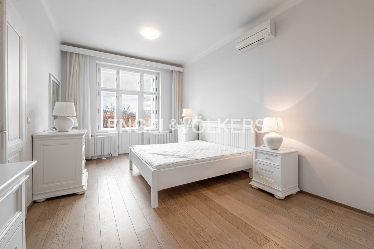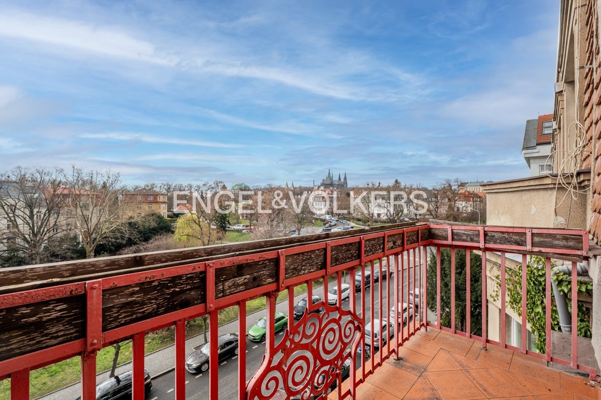 K pronájmu je k dispozici exkluzivní a prostorný byt s klimatizací o rozloze 115 m² a dvěma balkony, z nichž jeden poskytuje úchvatný výhled přímo na Pražský hrad. Tento elegantní byt se nachází ve 3. patře činžovního domu bez výtahu, který si zachoval mnoho původních prvků.