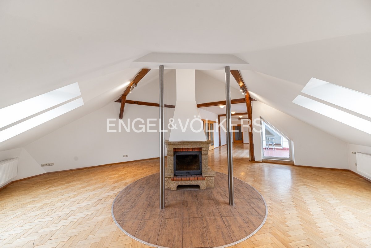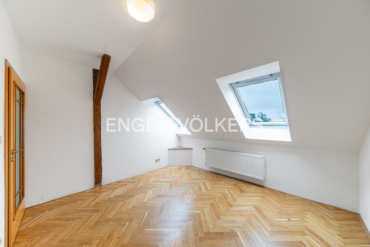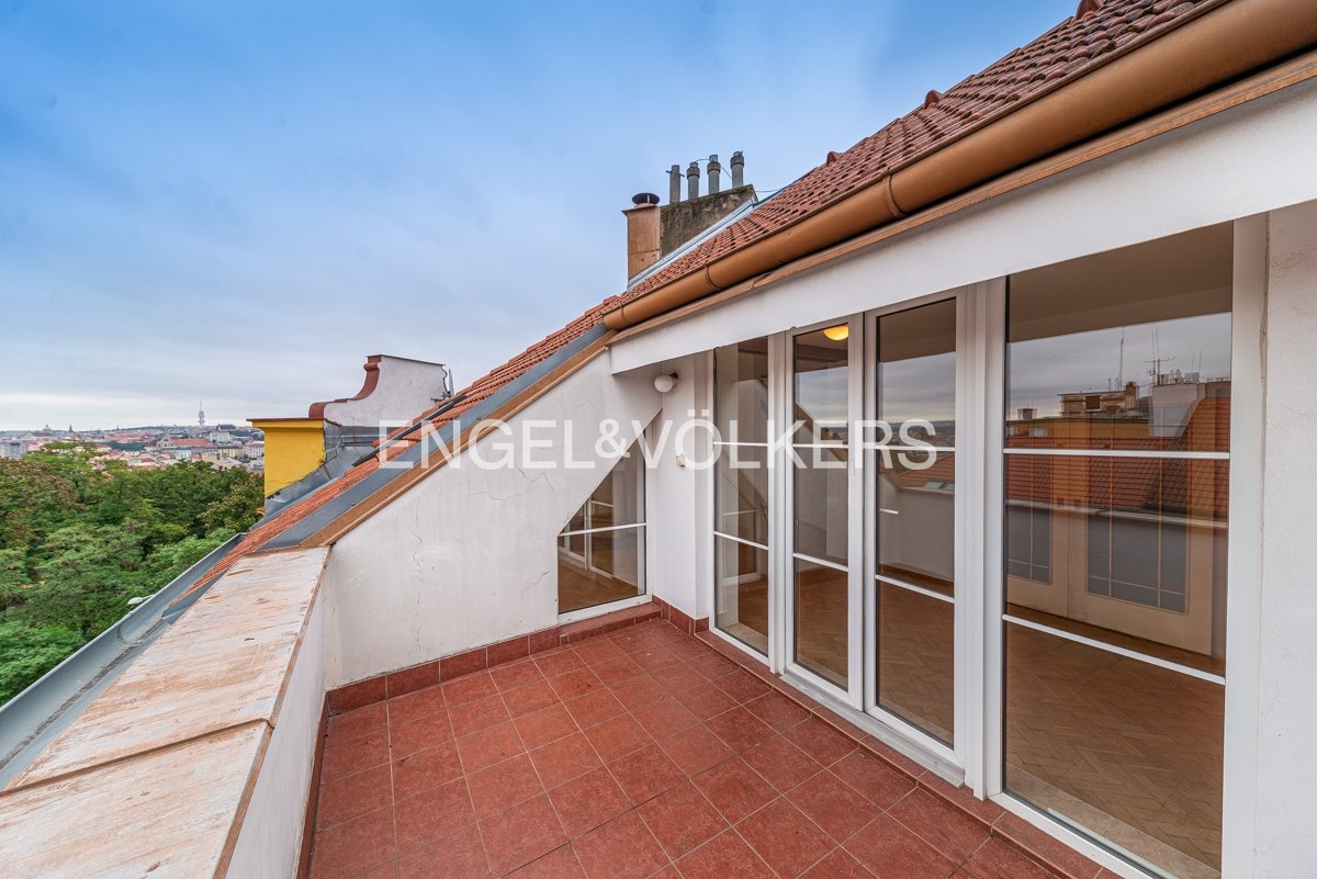 K dlouhodobému pronájmu je připraven prostorný podkrovní byt s krásným výhledem, dvěma terasami a pěti ložnicemi. Nachází se ve 4., a zároveň nejvyšším, patře kompletně zrekonstruovaného činžovního domu s výtahem. Celý dům stojí v klidné ulici hned u zeleně – přímo u sadů Na Skalce, kousek od parku Santoška.