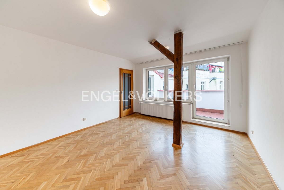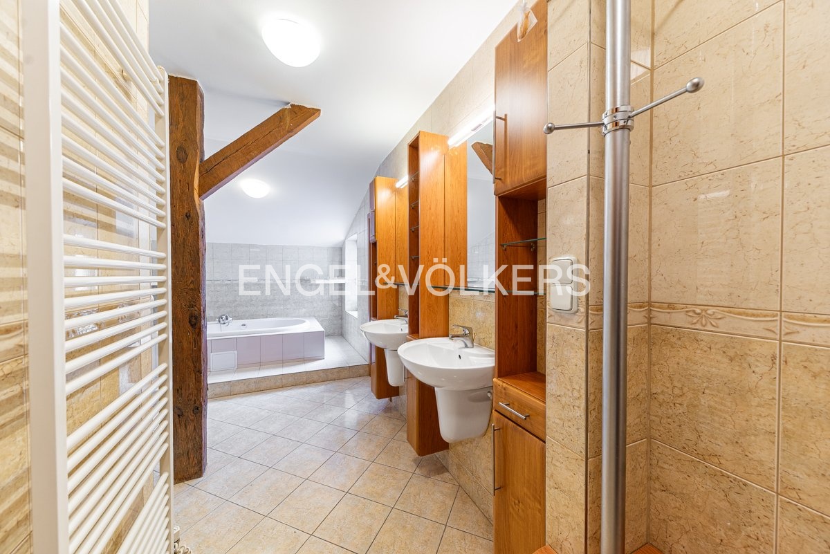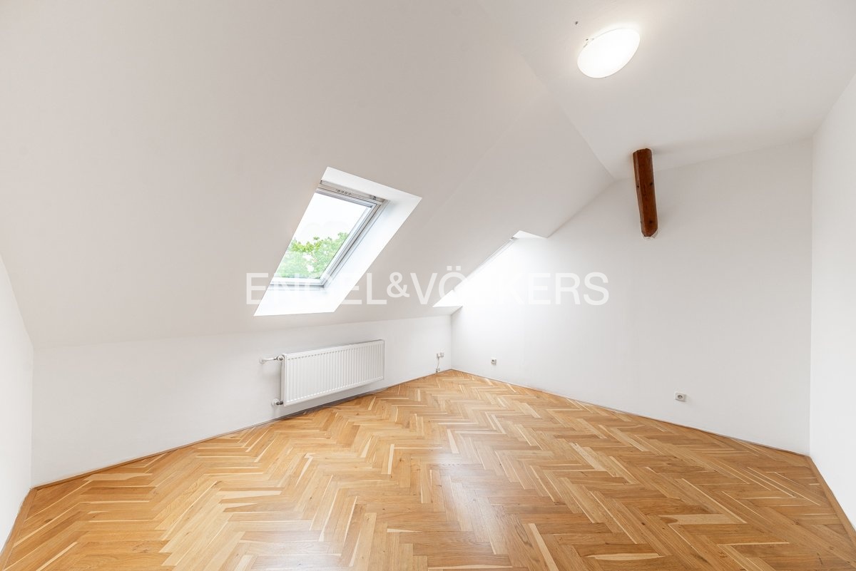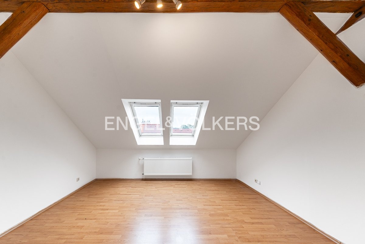 K dlouhodobému pronájmu je připraven prostorný podkrovní byt s krásným výhledem, dvěma terasami a pěti ložnicemi. Nachází se ve 4., a zároveň nejvyšším, patře kompletně zrekonstruovaného činžovního domu s výtahem. Celý dům stojí v klidné ulici hned u zeleně – přímo u sadů Na Skalce, kousek od parku Santoška.
