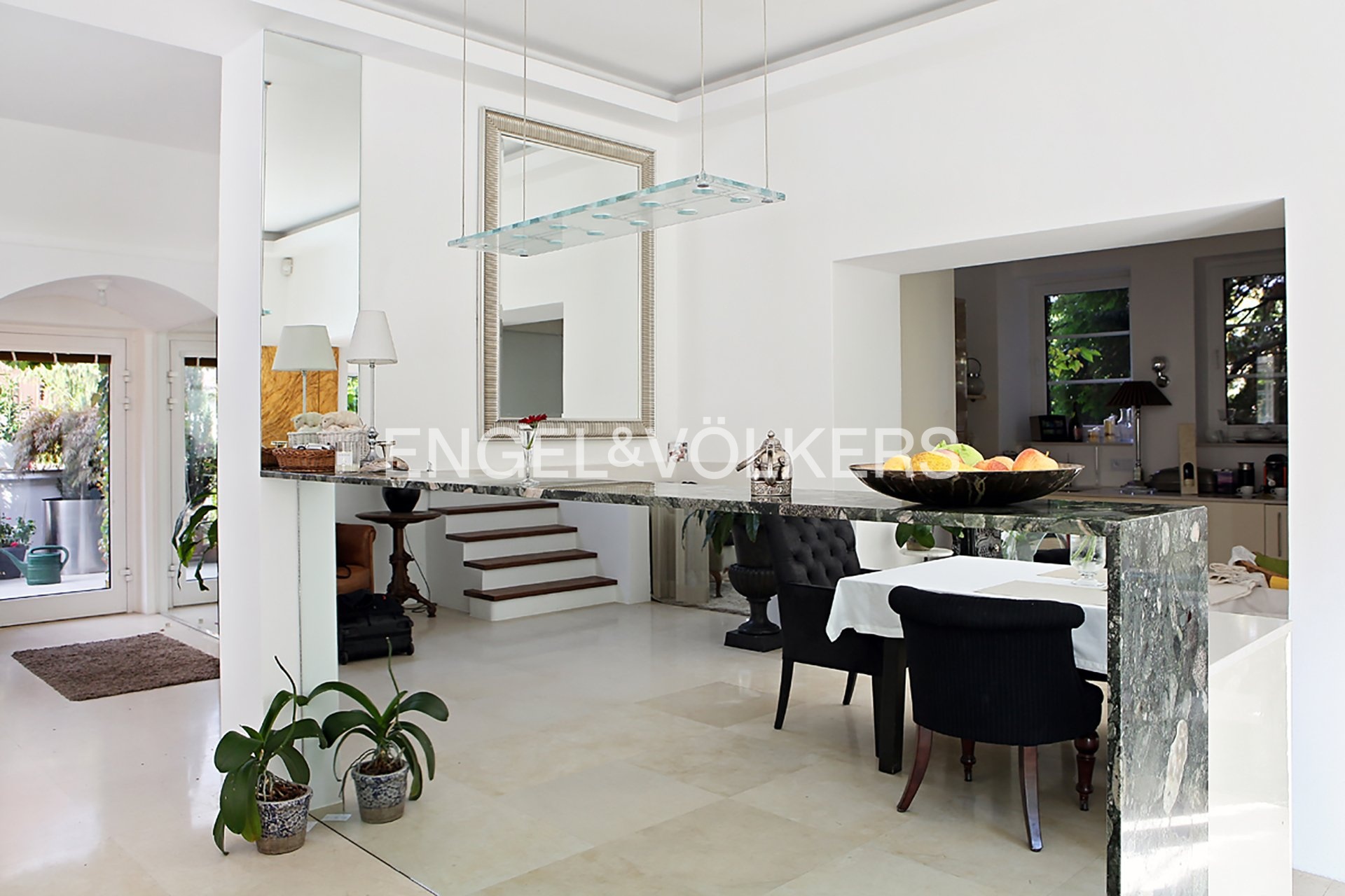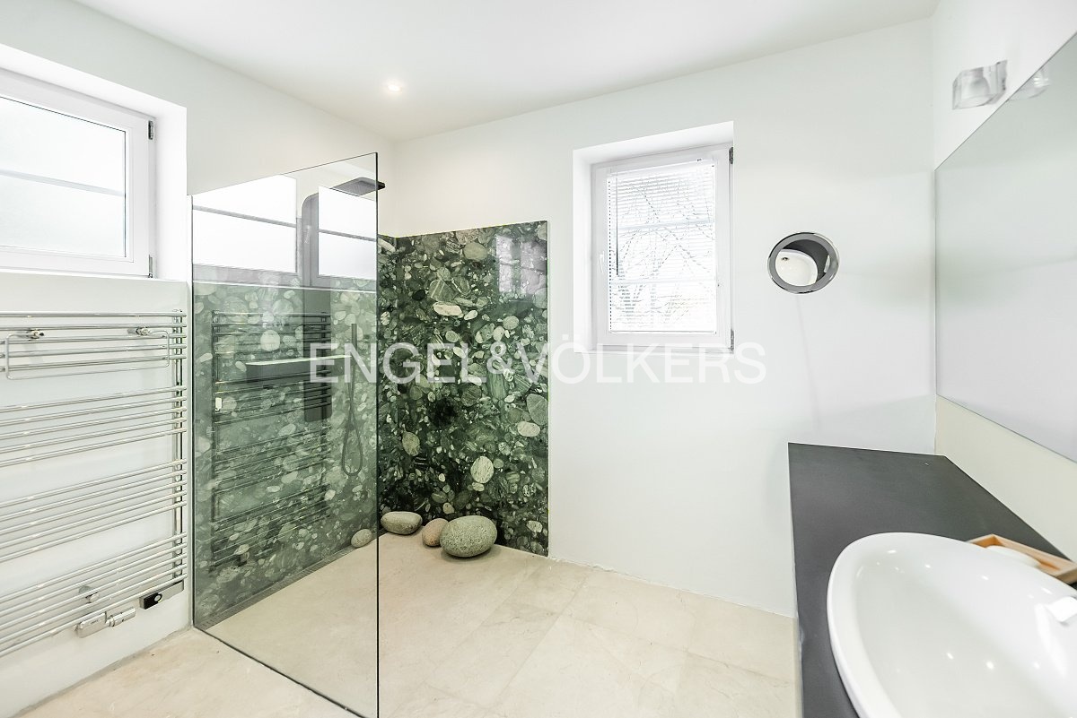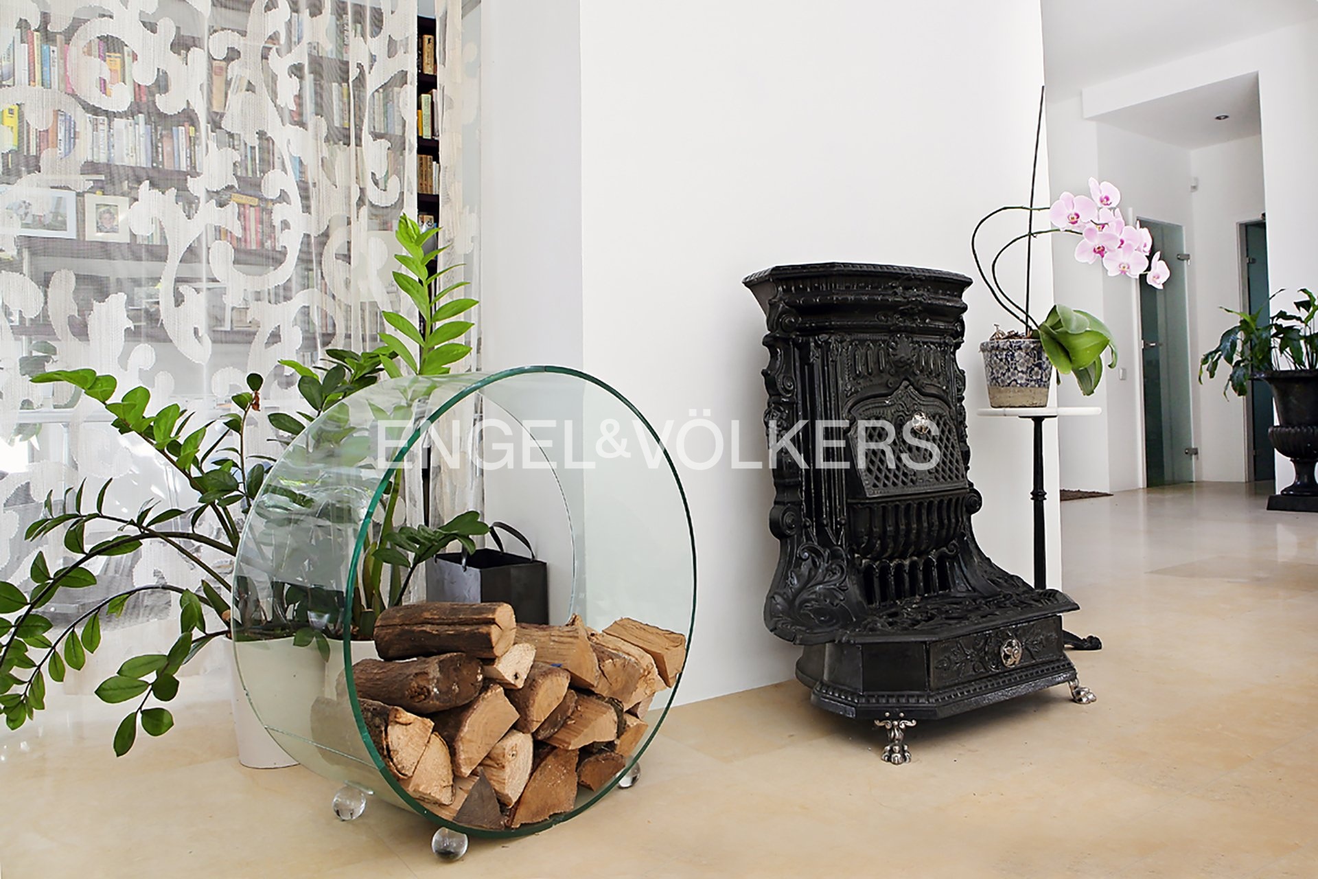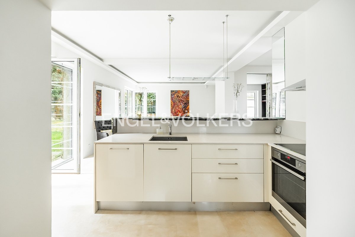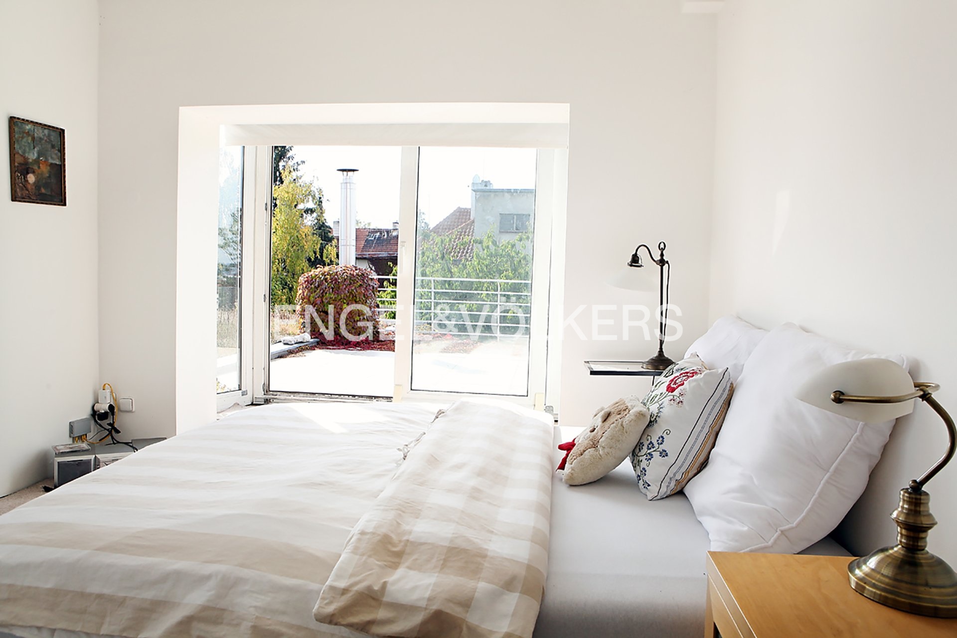 Dům disponuje třemi terasami o celkové výměře 48 m². V přízemí se nachází vstupní hala, světlý obývací pokoj s jídelnou a vstupem na terasu, kuchyně, pracovna a koupelna. V patře jsou dvě ložnice (z toho jedna s balkonem), další terasa, koupelna, šatna a samostatné WC. V podkroví je další místnost s přístupem na terasu. Součástí je také vyhřívaný zahradní domek a sklep. Dům je vybaven kuchyňskou linkou se spotřebiči, vestavěnými skříněmi, pračkou a sušičkou. K dispozici je vysokorychlostní internet, dřevěné podlahy a dlažba.