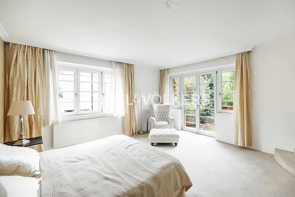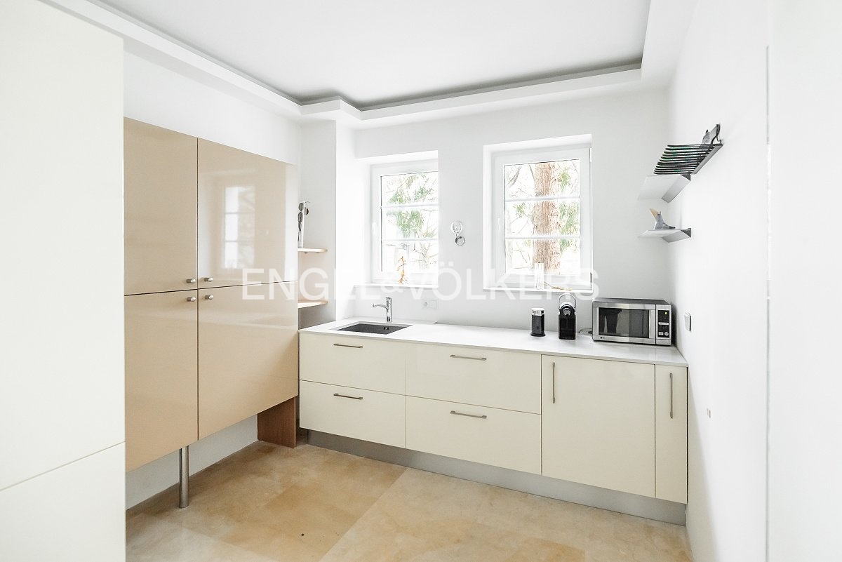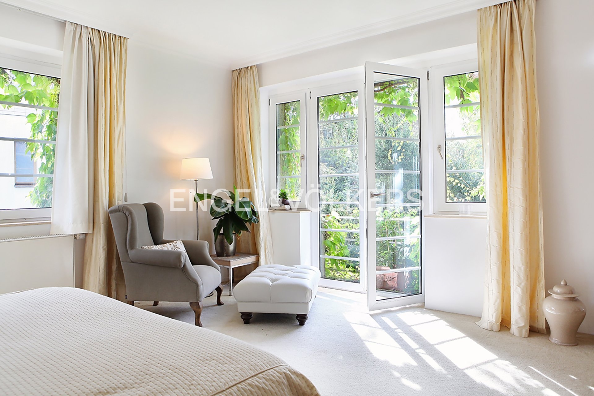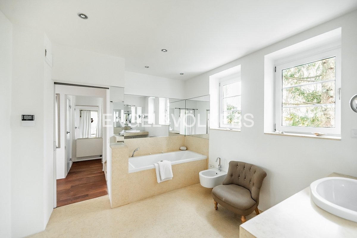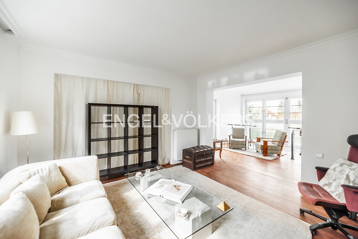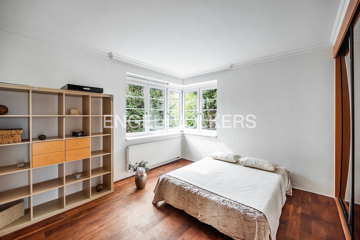 Dům disponuje třemi terasami o celkové výměře 48 m². V přízemí se nachází vstupní hala, světlý obývací pokoj s jídelnou a vstupem na terasu, kuchyně, pracovna a koupelna. V patře jsou dvě ložnice (z toho jedna s balkonem), další terasa, koupelna, šatna a samostatné WC. V podkroví je další místnost s přístupem na terasu. Součástí je také vyhřívaný zahradní domek a sklep. Dům je vybaven kuchyňskou linkou se spotřebiči, vestavěnými skříněmi, pračkou a sušičkou. K dispozici je vysokorychlostní internet, dřevěné podlahy a dlažba.