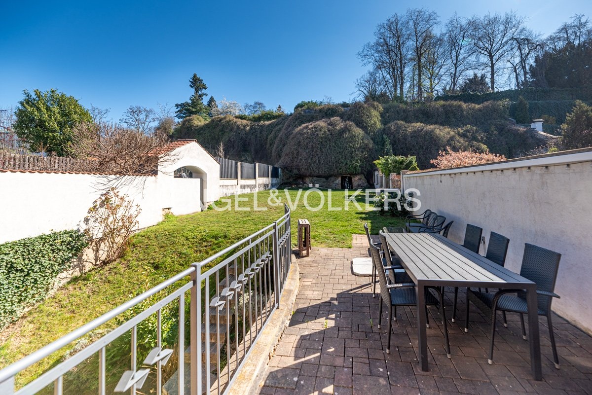 K domu náleží pěkná, udržovaná zahrada zakončená skálou, která zajišťuje dostatek soukromí a příjemnou atmosféru. Součástí je také garáž s vjezdem z ulice s možností parkování dvou aut za sebou.
