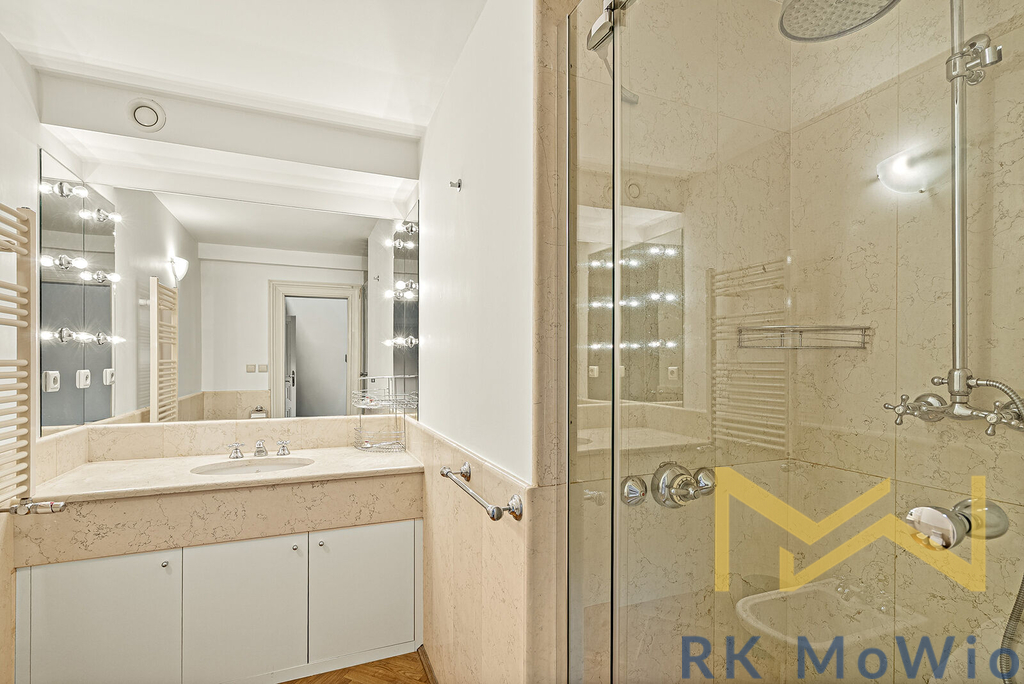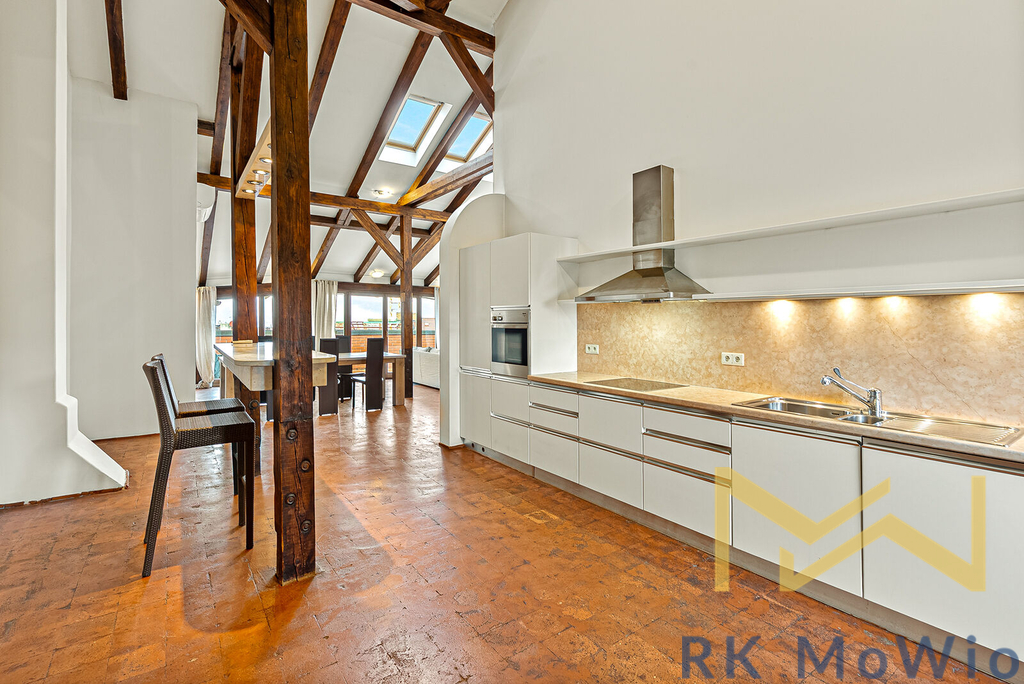 Půdorys bytové jednotky tvoří vstupní chodba, vzdušný obývací pokoj se vstupem na terasu, kuchyňský kout a jídelní prostor, hlavní ložnice s vlastní koupelnou (s vanou, umyvadlem, bidetem a toaletou), další 2 ložnice s privátními koupelnami (vždy se sprchou, umyvadlem, bidetem a toaletou), prádelna, komora a toaleta pro hosty. Všechny ložnice mají přístup na galerii se střešními okny. Vybavení bytu: kuchyňská linka (včetně lednice s mrazákem, sklokeramické varné desky, digestoře, elektrické trouby a myčky), vestavěné skříně, pračka a sušička, dřevěné trámy, velkoformátová okna, dřevěné podlahy a dlažba. Možnost pronájmu parkovacího stání v budově. Foto je ilustrativní.