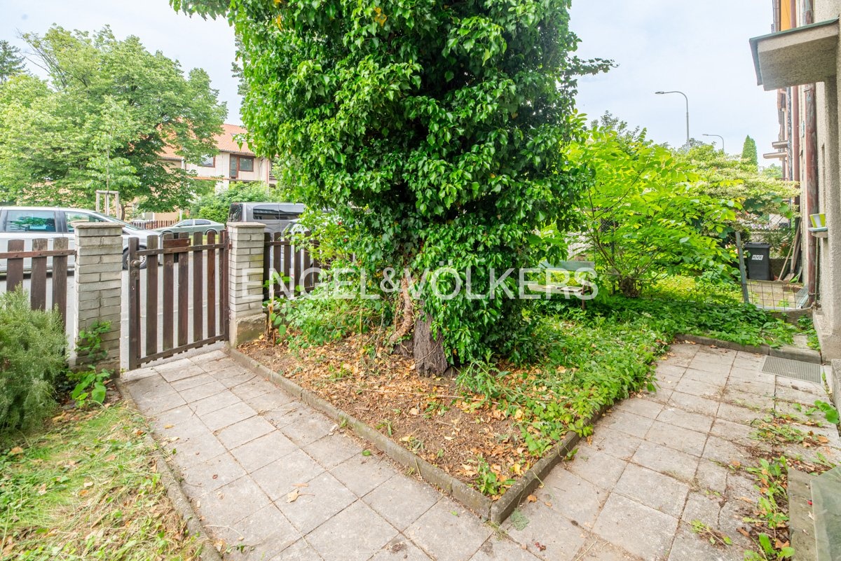 Zahrada o výměře 79 m² je situována za domem a navazuje na ni vjezdová brána – ideální pro vybudování parkovacího stání. Před domem je předzahrádka o velikosti 35 m², která poskytuje příjemný odstup od ulice a prostor pro relax nebo zeleň.