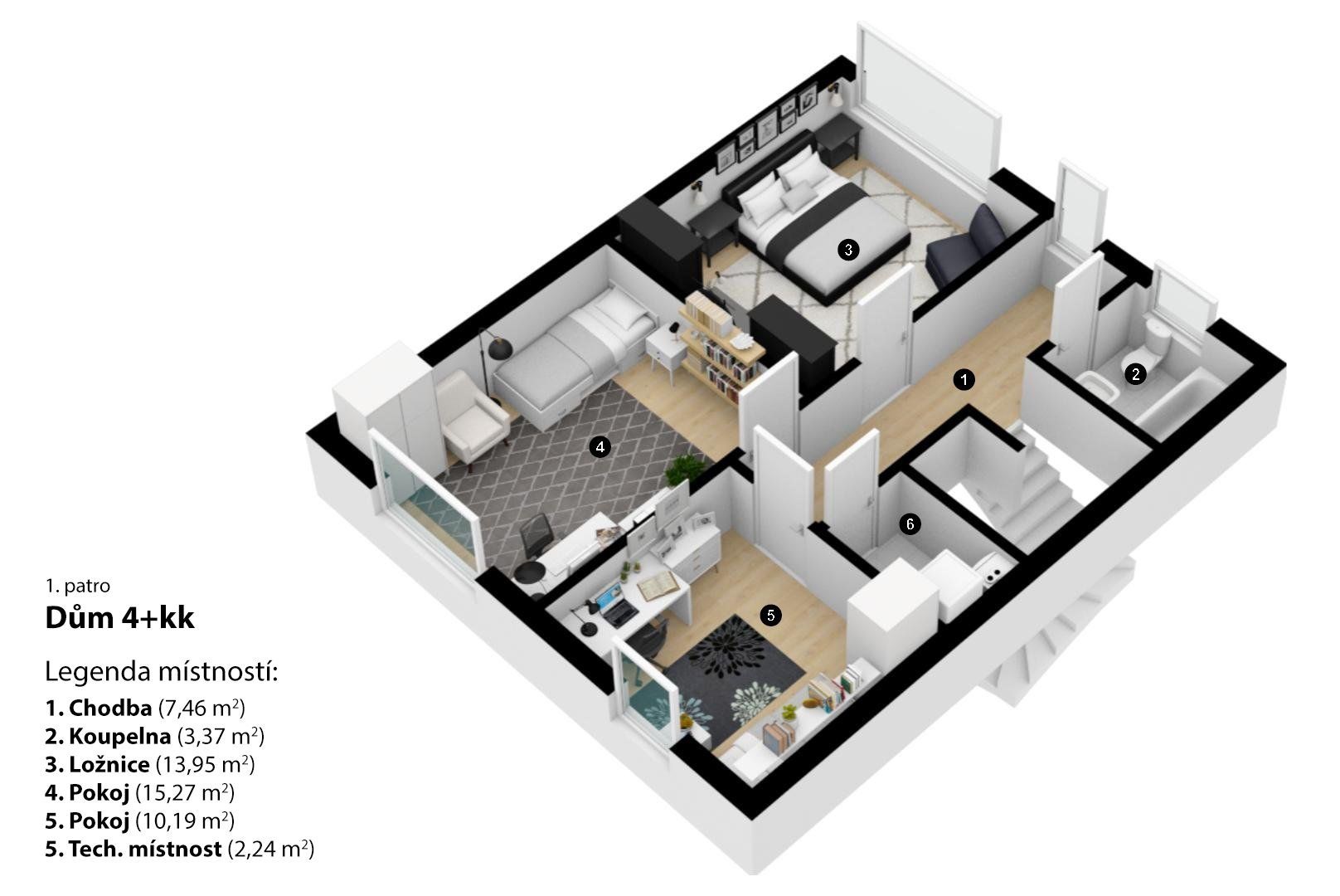 Dům je rozložen do dvou podlaží s podlahovou plochou 110 m². Obytná plocha 95 m² je rozdělena do dispozice 4+kk, která zahrnuje čtyři pokoje a kuchyňský kout. Jižně orientovaná terasa o rozloze 16 m² zajišťuje dostatek světla po celý den. K domu patří také prostorná zahrada o rozloze 179 m², ideální pro relaxaci a rekreační aktivity, a 38 m² před domem pro parkování dalšího automobilu.