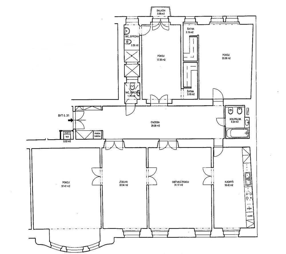 Byt je situován ve 3.patře renovovaného secesního domu s výtahem. Celková plocha činí 197 m2 a sestává ze vstupní haly, 5t- místností, kuchyně, 2x koupelnou, 3x WC. Kuchyně je vybavena kuch. linkou se zabudovanými spotřebiči, Vytápění je samostatným plynovým kotlem. V bytě jsou masivní parkety, zdobené štukové stropy, dvoukřídlé dveře.