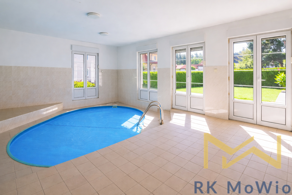 Půdorys domu je rozdělen do dvou podlaží. V přízemí se nachází vstupní hala, plně vybavená kuchyň se spotřebiči, jídelna, prostorný obývací pokoj s krbem a přímým vstupem na zahradu, ložnice, koupelna (vana, sprchový kout, umyvadlo, toaleta), samostatná toaleta a krytý vyhřívaný bazén. V patře je k dispozici pět ložnic, koupelna (vana, umyvadlo) a samostatná toaleta, součástí je také balkón. Dům disponuje praktickým dispozičním řešením, které přirozeně odděluje společenskou a klidovou část. Vybavení zahrnuje kuchyňskou linku se spotřebiči (sporák, trouba, myčka, lednice), bezpečnostní rolety na oknech a elektronický zabezpečovací systém s možností napojení na pult centrální ochrany. Podlahy tvoří kombinace keramické dlažby, plovoucí a vinylové podlahy. Součástí domu je sklep o velikosti cca. 60 m² a dvě garážová parkovací stání.