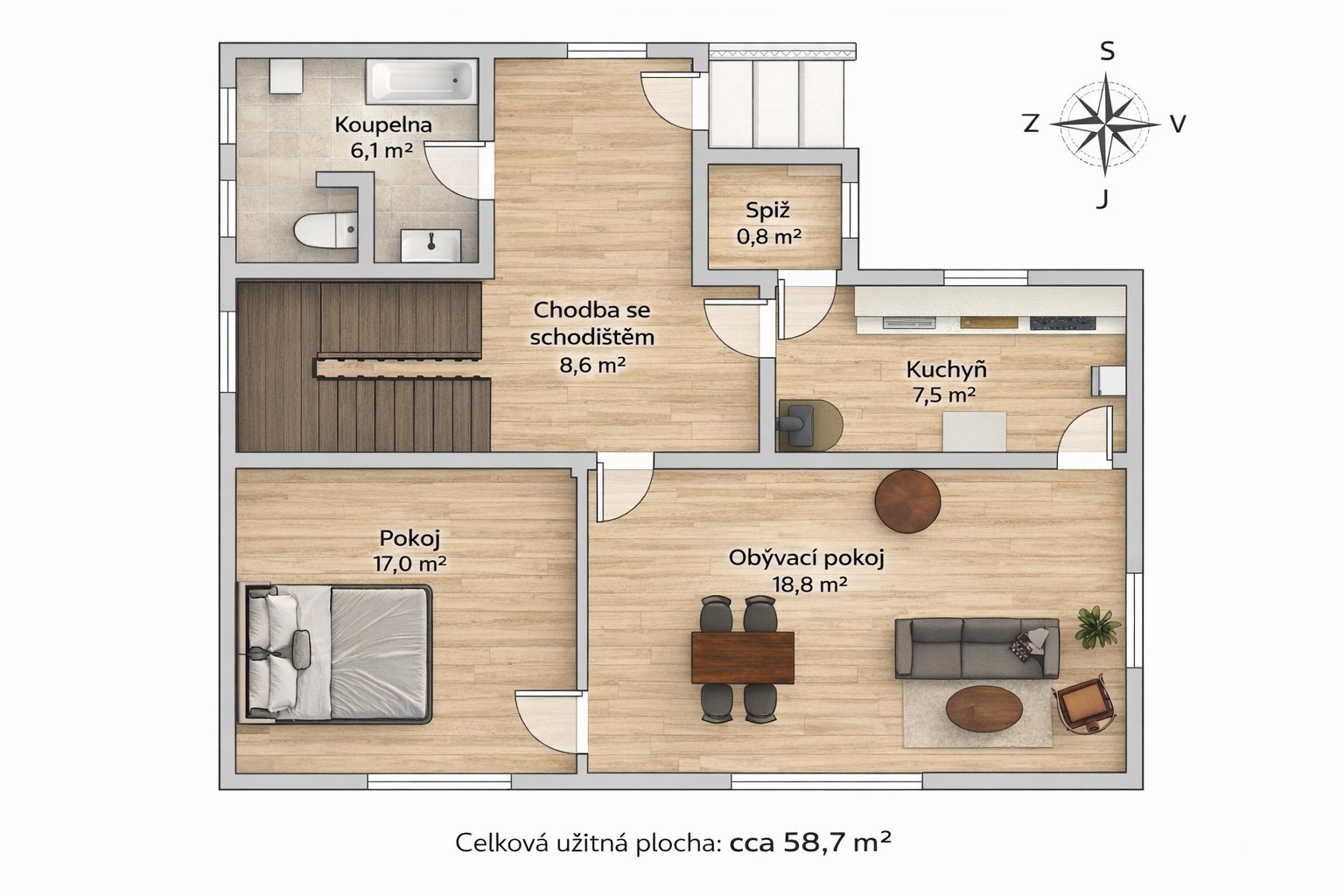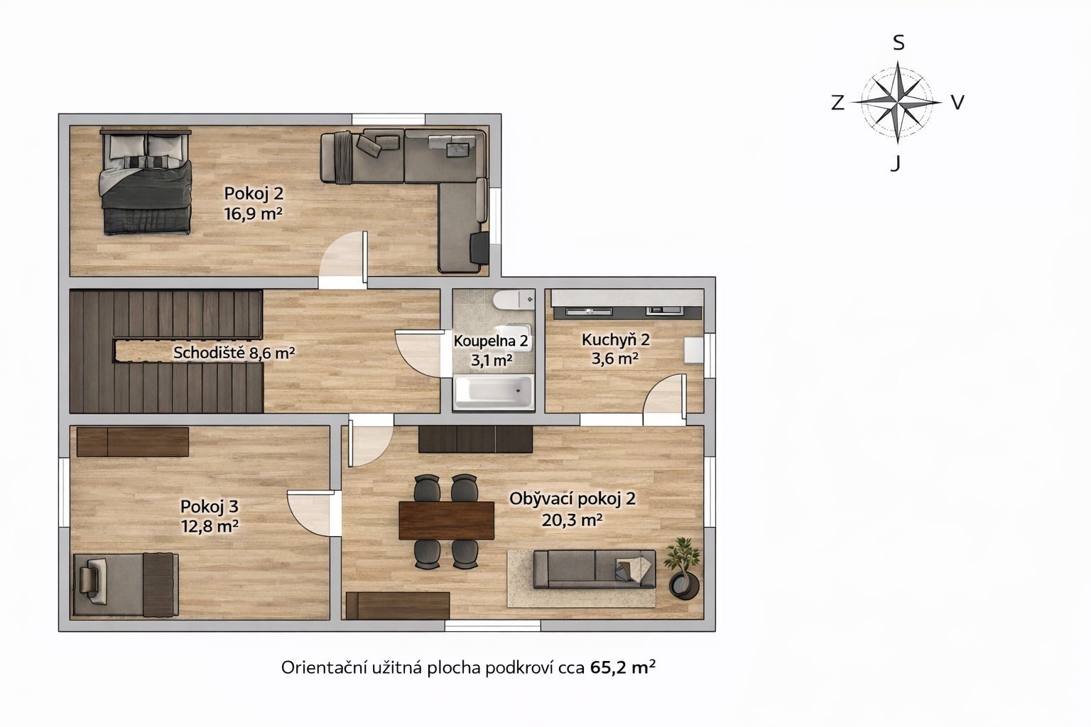 Celková obytná plocha obou nadzemních podlaží včetně schodiště činí přibližně 123 m². Dům je navíc podsklepený (cca 21 m² včetně schodiště), což poskytuje dostatek technického a úložného zázemí. Pod střechou se nachází neobyvatelné podkroví vhodné pro další skladování.