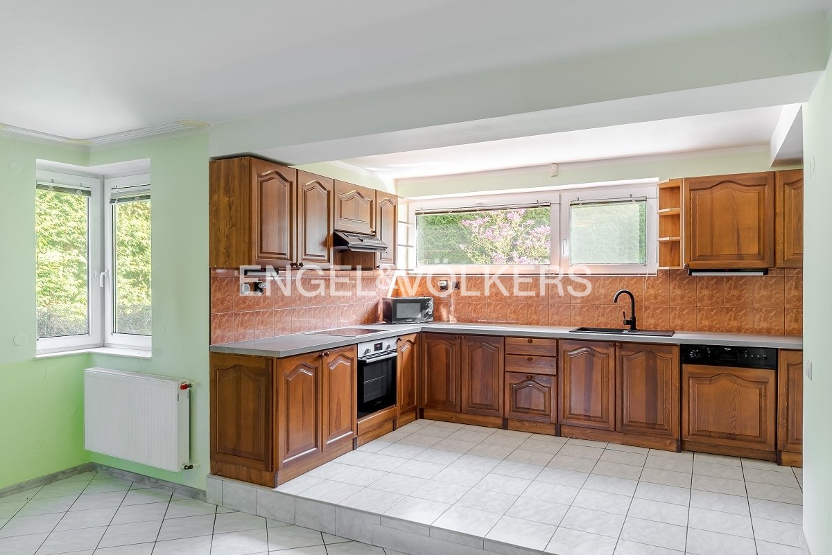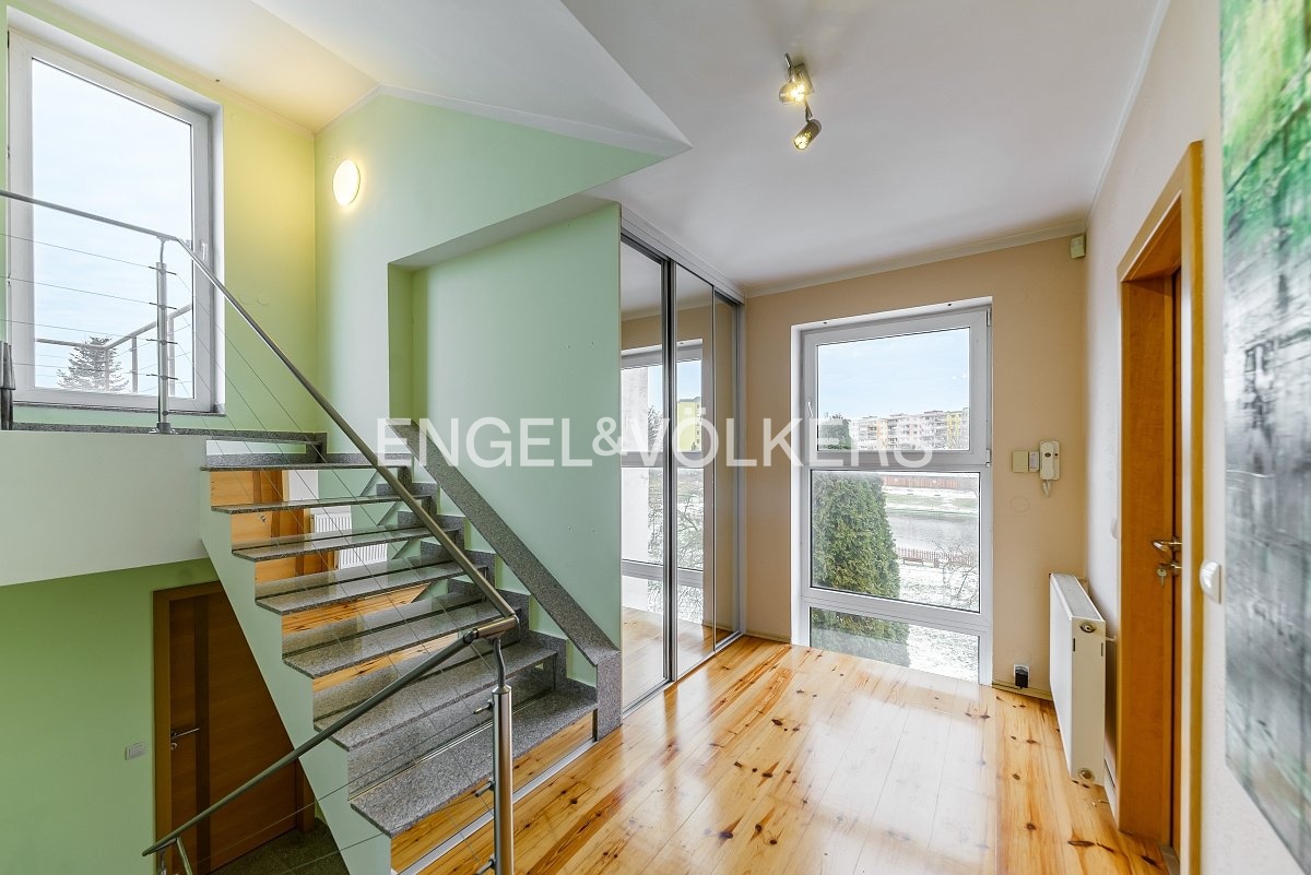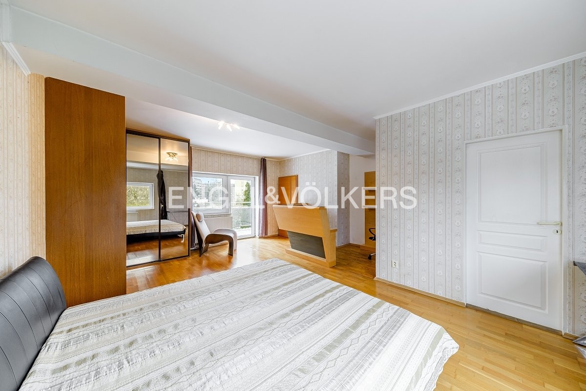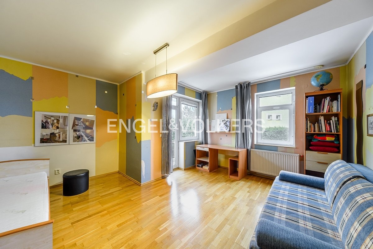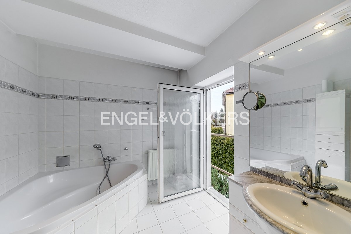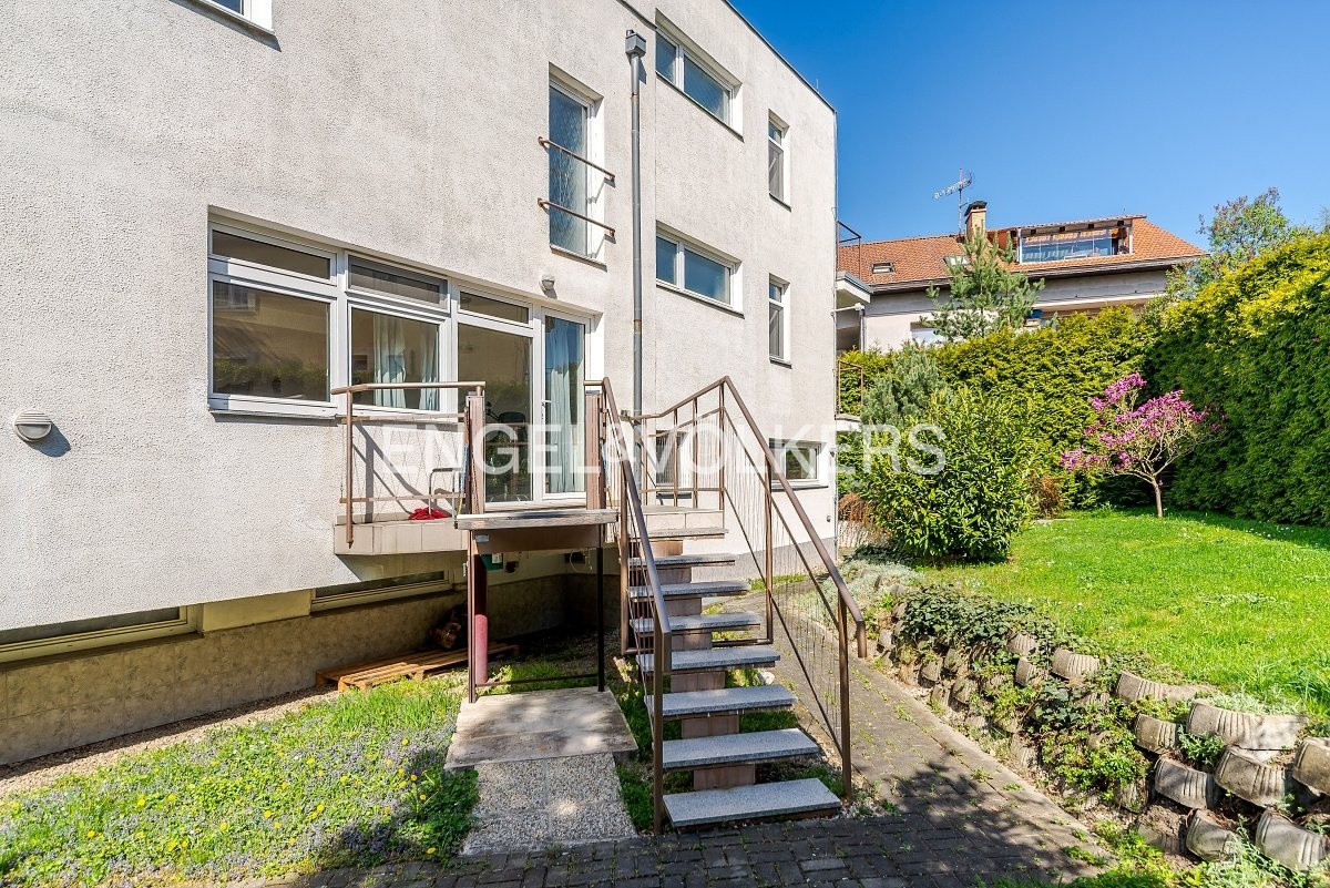 Jednotlivá mezipatra propojuje elegantní žulové schodiště, díky kterému je dům prakticky členěn a poskytuje dostatek soukromí pro každého člena domácnosti. Tento promyšlený rozvrh zároveň činí nemovitost ideální i pro dvougenerační bydlení. Každé podlaží má vlastní koupelnu a samostatnou toaletu, přičemž hlavní ložnice disponuje navíc svou soukromou koupelnou. K relaxaci slouží tři prostorné balkony a střešní terasa s panoramatickým výhledem do okolí. Obývací pokoj s krbem a samostatná kuchyň s jídelnou mají přímý vstup na zahradu. Suterén nabízí dostatek úložných a skladových prostor.