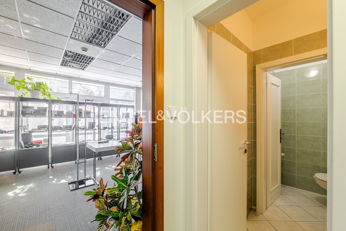 Interiér prostoru je navržen s důrazem na praktičnost a komfort. Na podlaze je položen kvalitní zátěžový koberec, světlé podhledy v kombinaci s úsporným kancelářským osvětlením vytvářejí příjemné a prosvětlené prostředí pro práci i prezentaci zboží. Celý prostor je vybaven moderními plastovými dveřmi s dvojskly a otevíratelnými okny, které zajišťují výbornou tepelnou i zvukovou izolaci. Součástí pronájmu je také vlastní sociální zařízení s toaletou a umyvadlem, což poskytuje nezbytné soukromí a pohodlí pro personál i zákazníky.