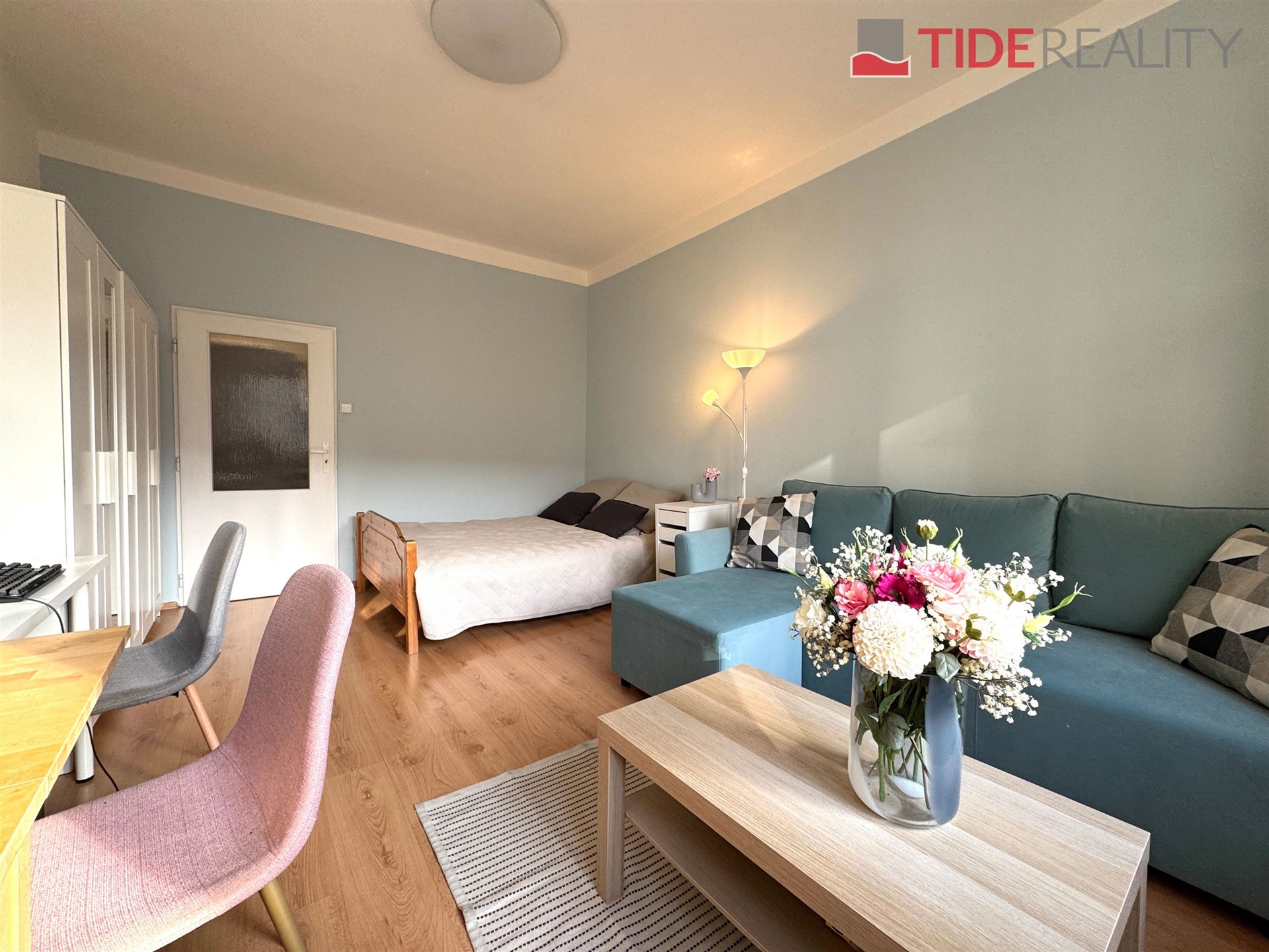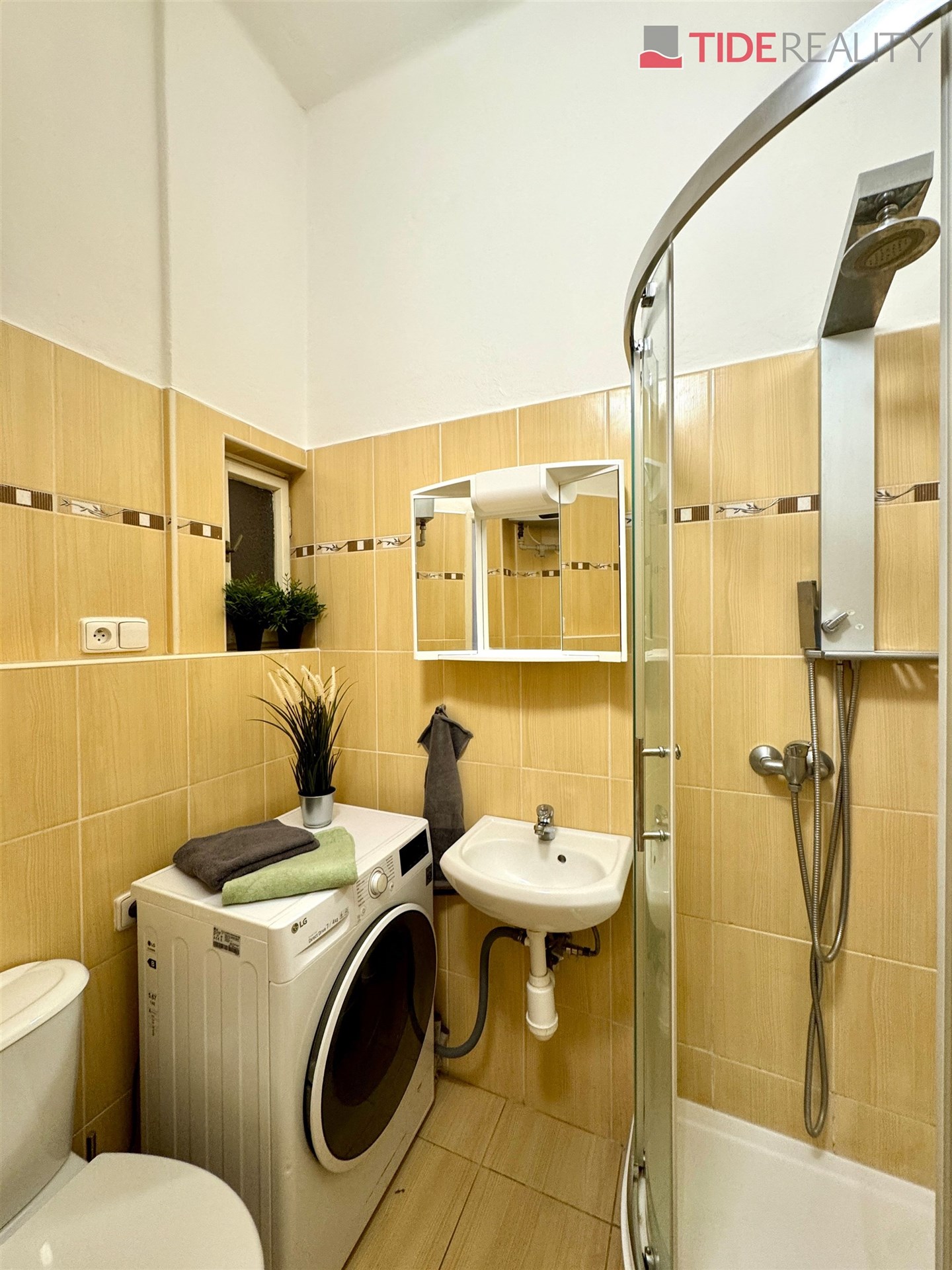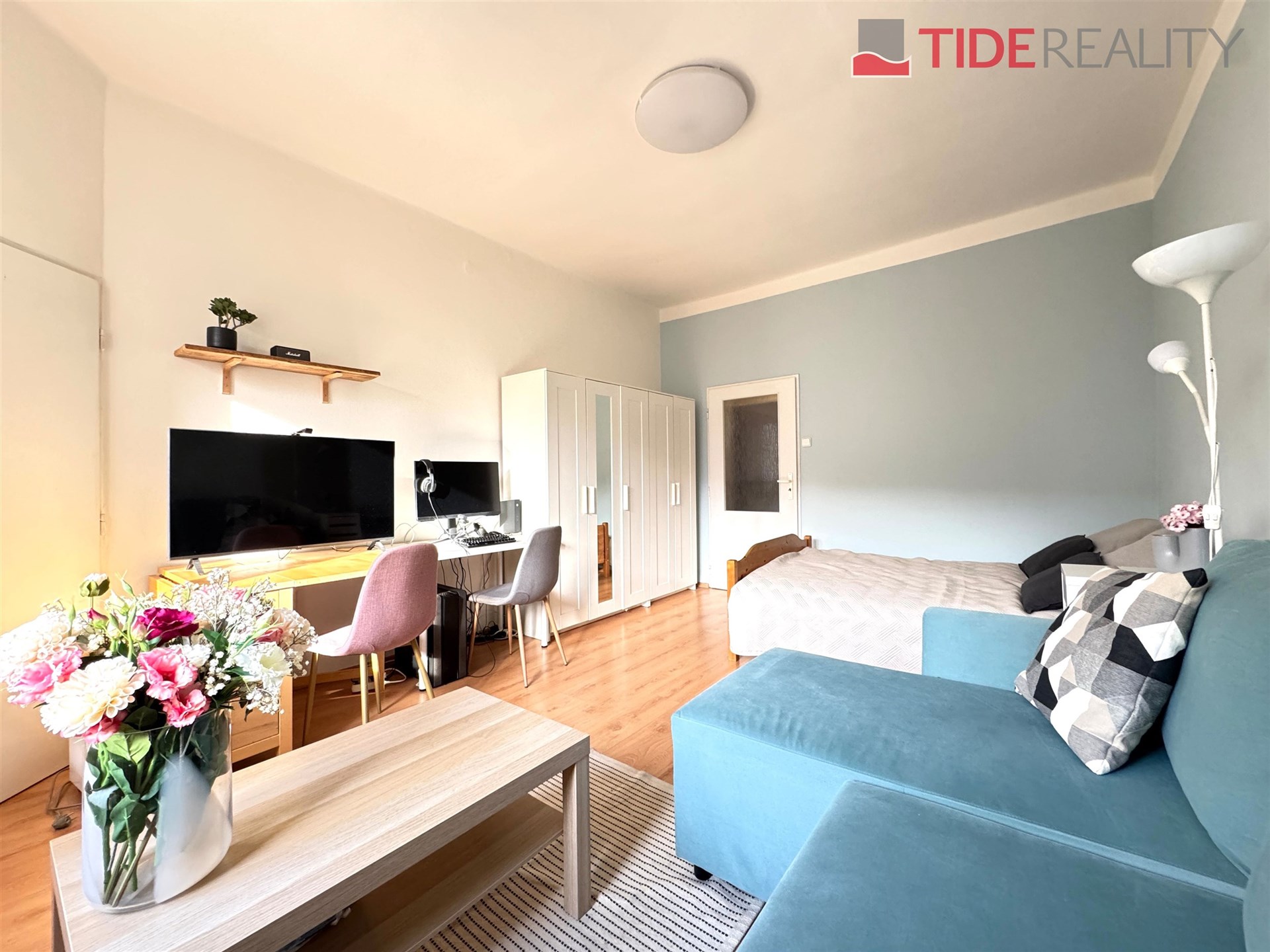 Útulný, slunný byt 1+kk o celkové rozloze 26 m2 řešen jako studio s komorou, koupelnou a předsíní. Obytná místnost je maximálně funkční a je tvořena koutem na spaní, obývacím a jídelním, či pracovním koutem a dále malým úložným prostorem (cca 1 m2). Kuchyňská linka je instalována v předsíni a nepřekáží tak provozu v hlavní místnosti. V koupelně je sprchový kout, umyvadlo, WC a přípojka na pračku. Koupelna má odvětrání oknem do světlíku. Byt má jižní orientaci a je situován do absolutně tichého vnitrobloku! Vytápění je zajištěno prostřednictvím domovní plynové kotelny, ohřev teplé vody vlastním bojlerem. K bytu náleží sklep o výměře 2 m2.