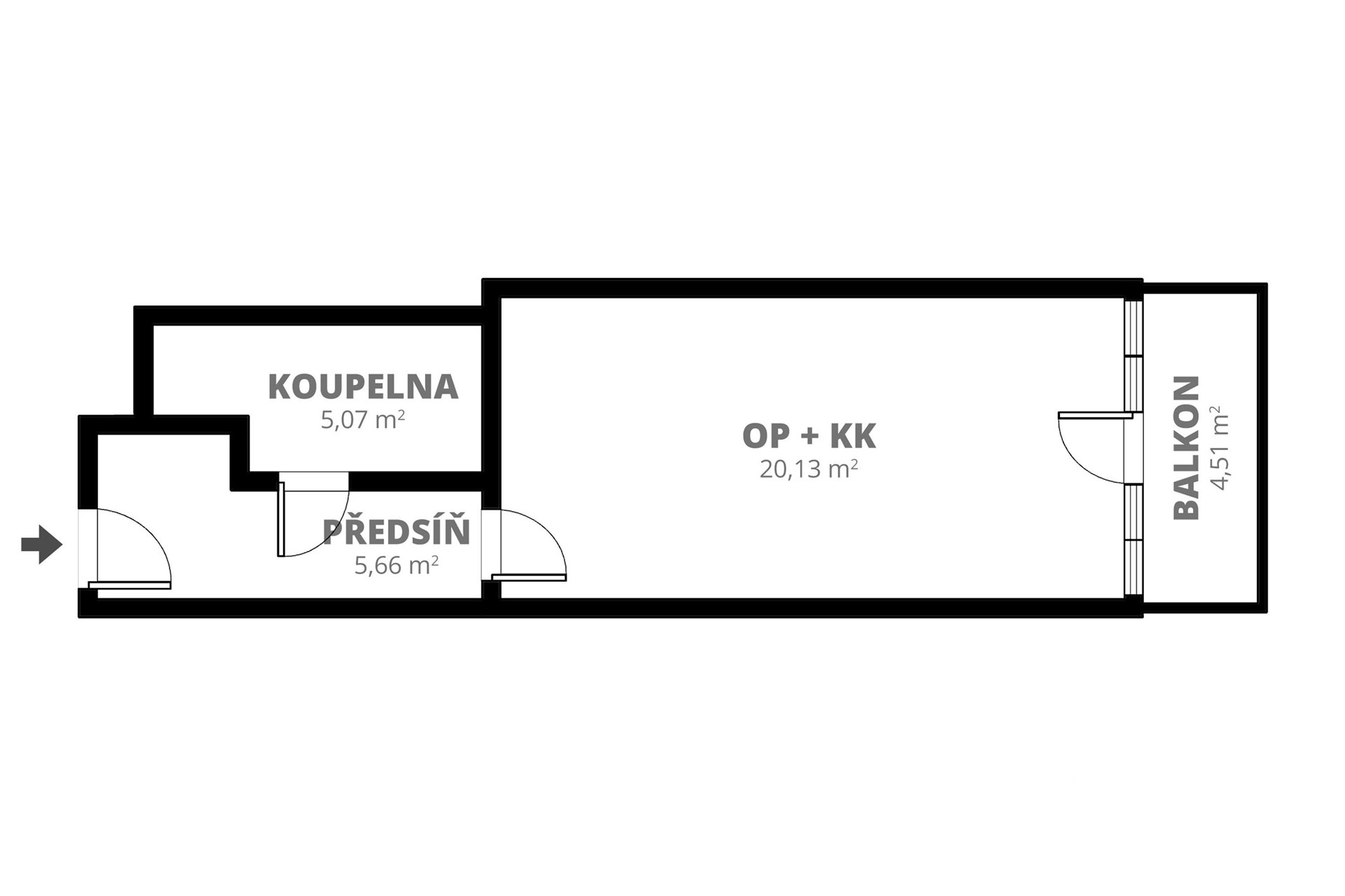 Byt o ploše 33,36 m² je situován v nejvyšším patře, díky čemuž nabízí dostatek denního světla, otevřený výhled a příjemný pocit soukromí. Balkon o velikosti 4,51 m² se snadno stane místem pro ranní kávu či krátký odpočinek během dne. Praktický sklep (1,70 m²) řeší úložné prostory.