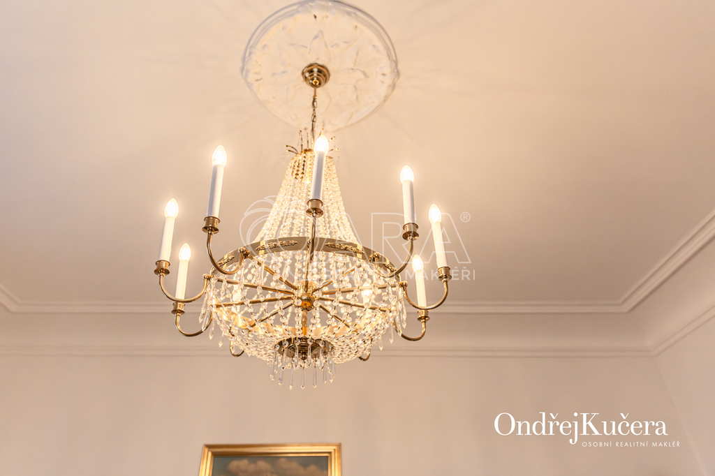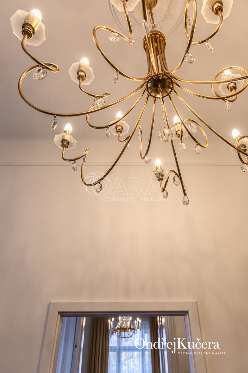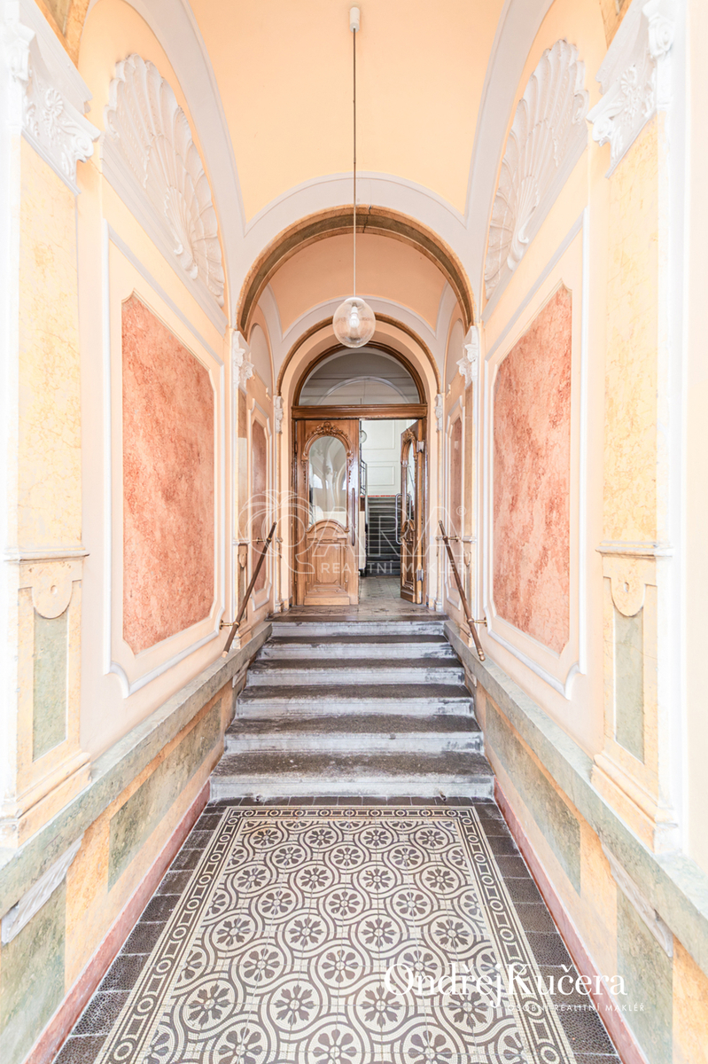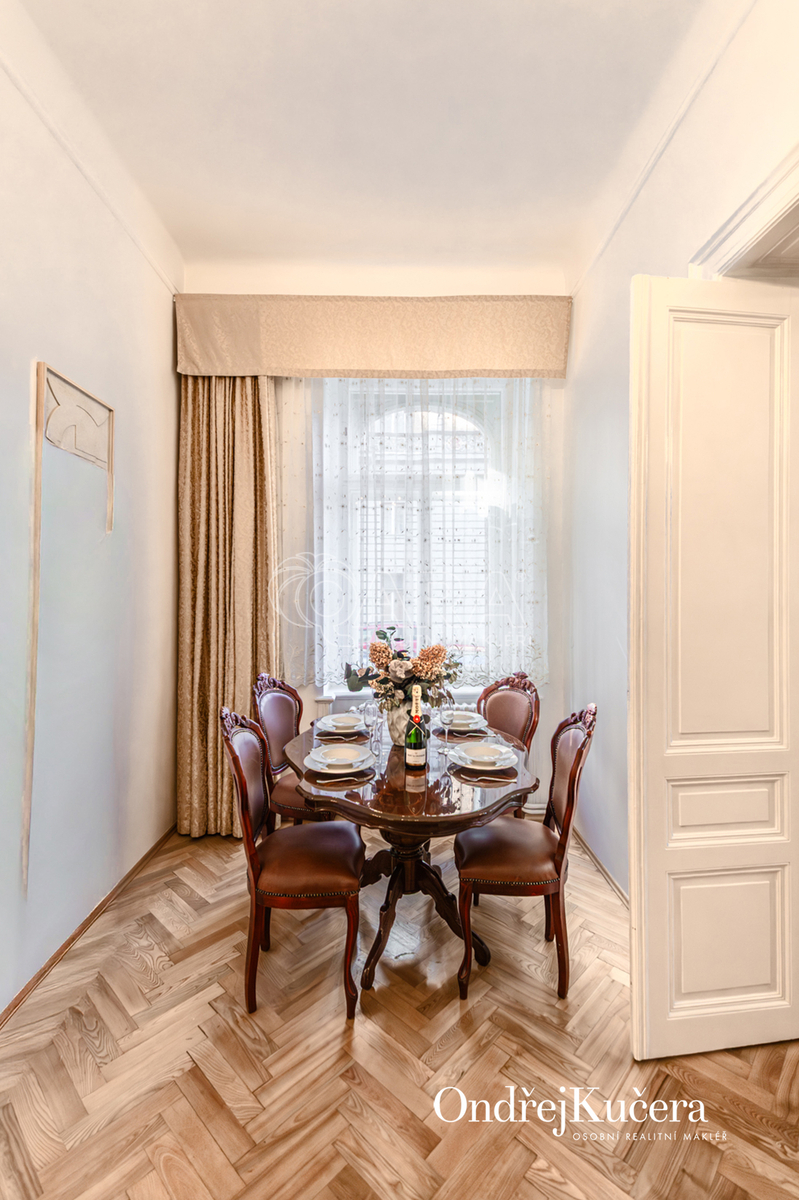 Součástí prodeje může být i kompletní vybavení včetně historického nábytku, což umožňuje okamžité užívání bez dalších investic. K bytu také náleží sklep o velikosti cca 2,5 m² a společná chodba pouze pro dva byty.