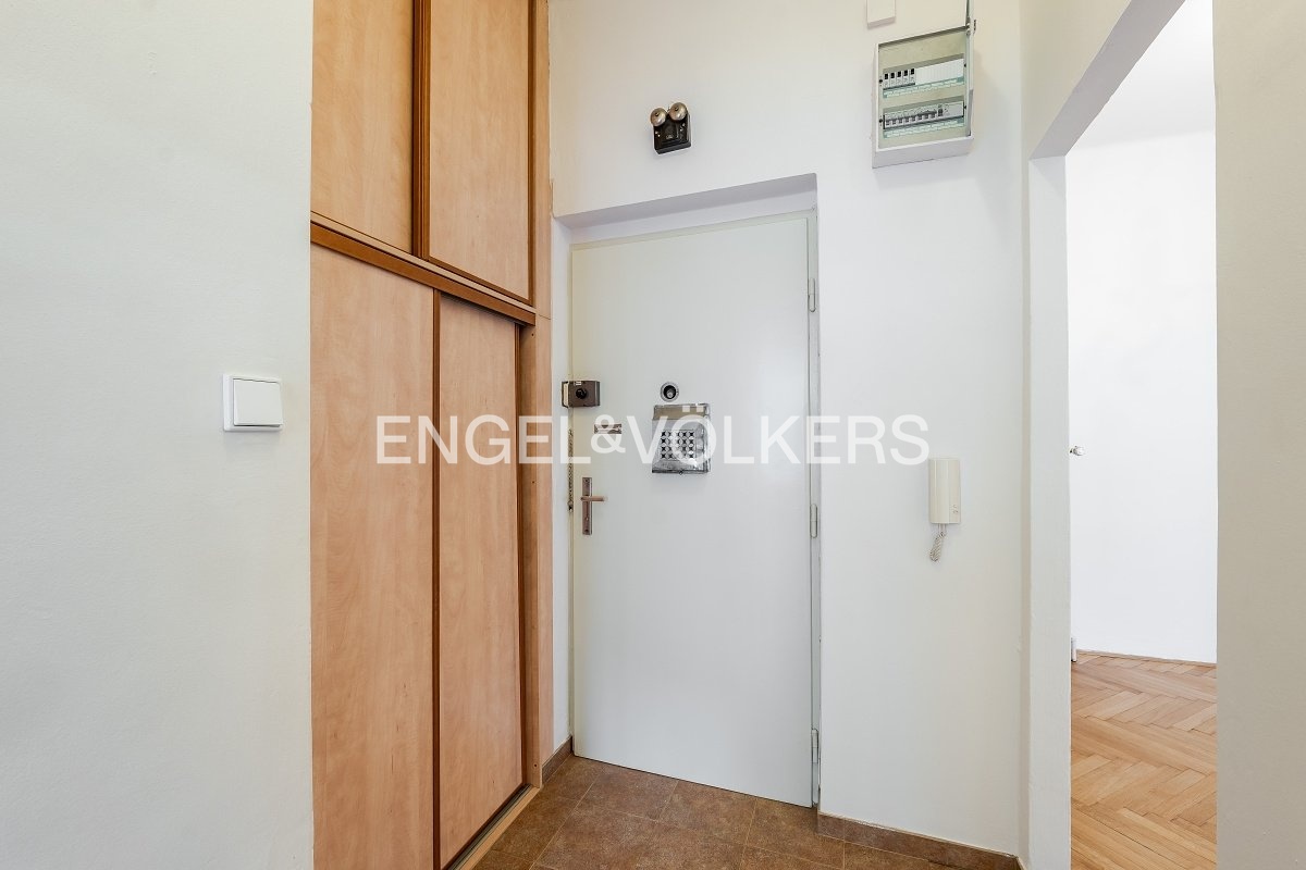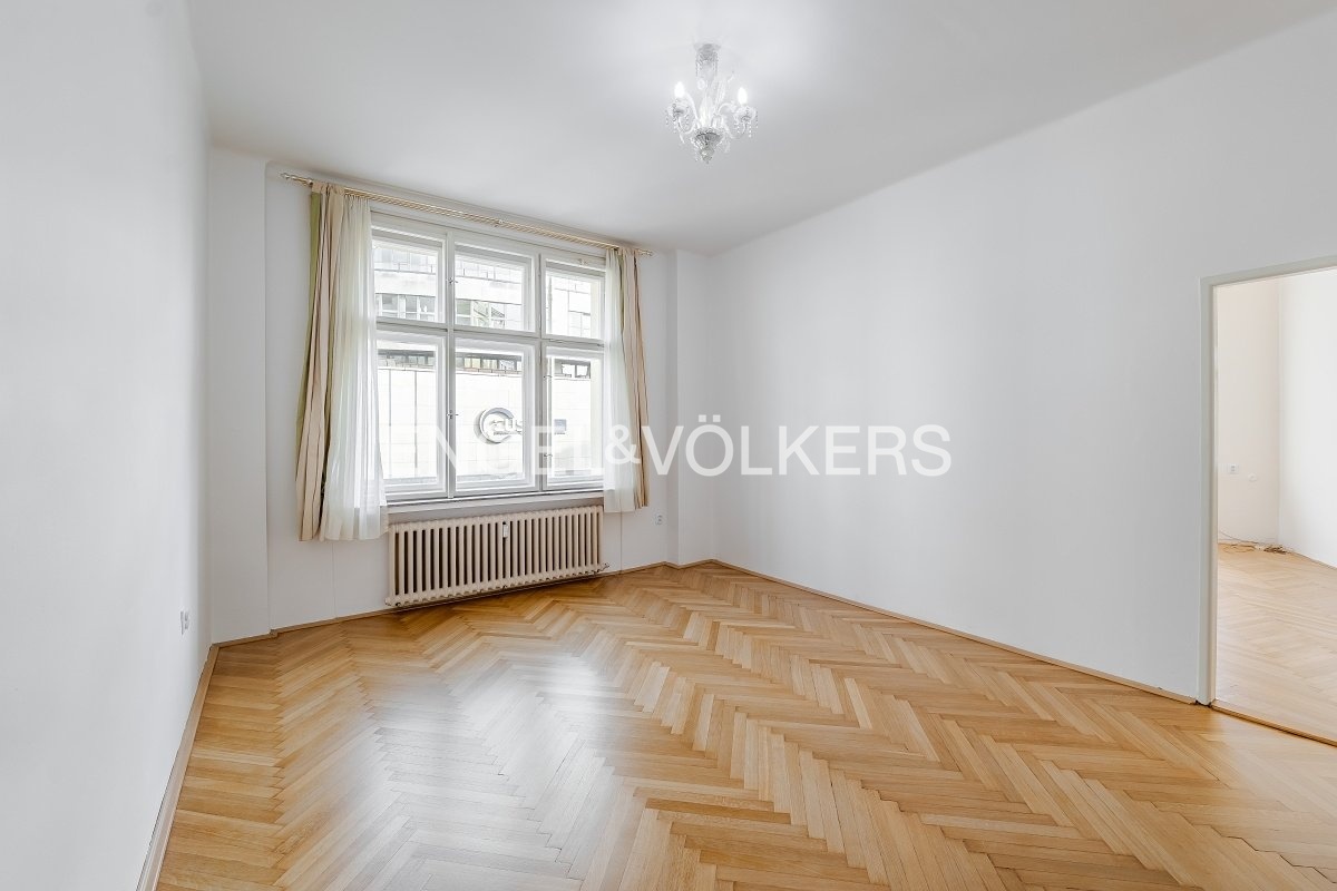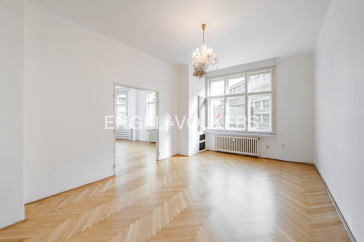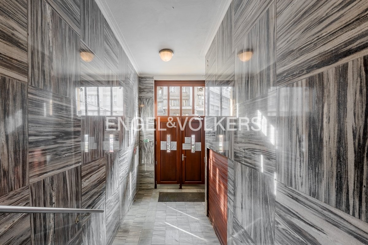 Samotný byt nabízí vzdušný rohový obývací pokoj, samostatnou kuchyň plně vybavenou všemi spotřebiči, dvě prostorné a světlé ložnice, koupelnu s vanou a pračkou, samostatnou toaletu, praktickou vstupní halu a prostornou komoru. Interiér si zachoval řadu původních historických prvků – dřevěné parkety, vysoké stropy, skleněné lustry, špaletová okna i dvoukřídlé dveře s mosaznými klikami.