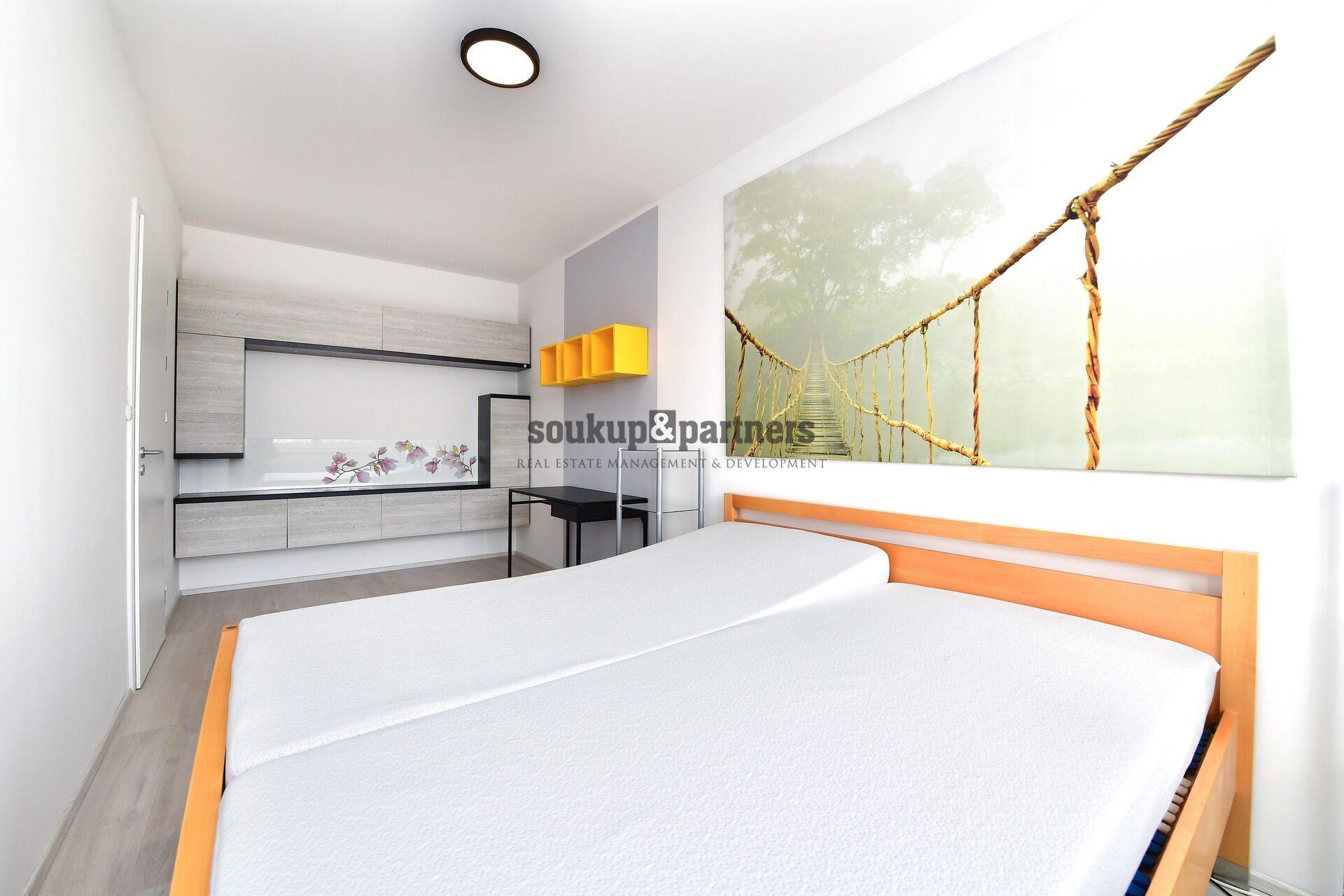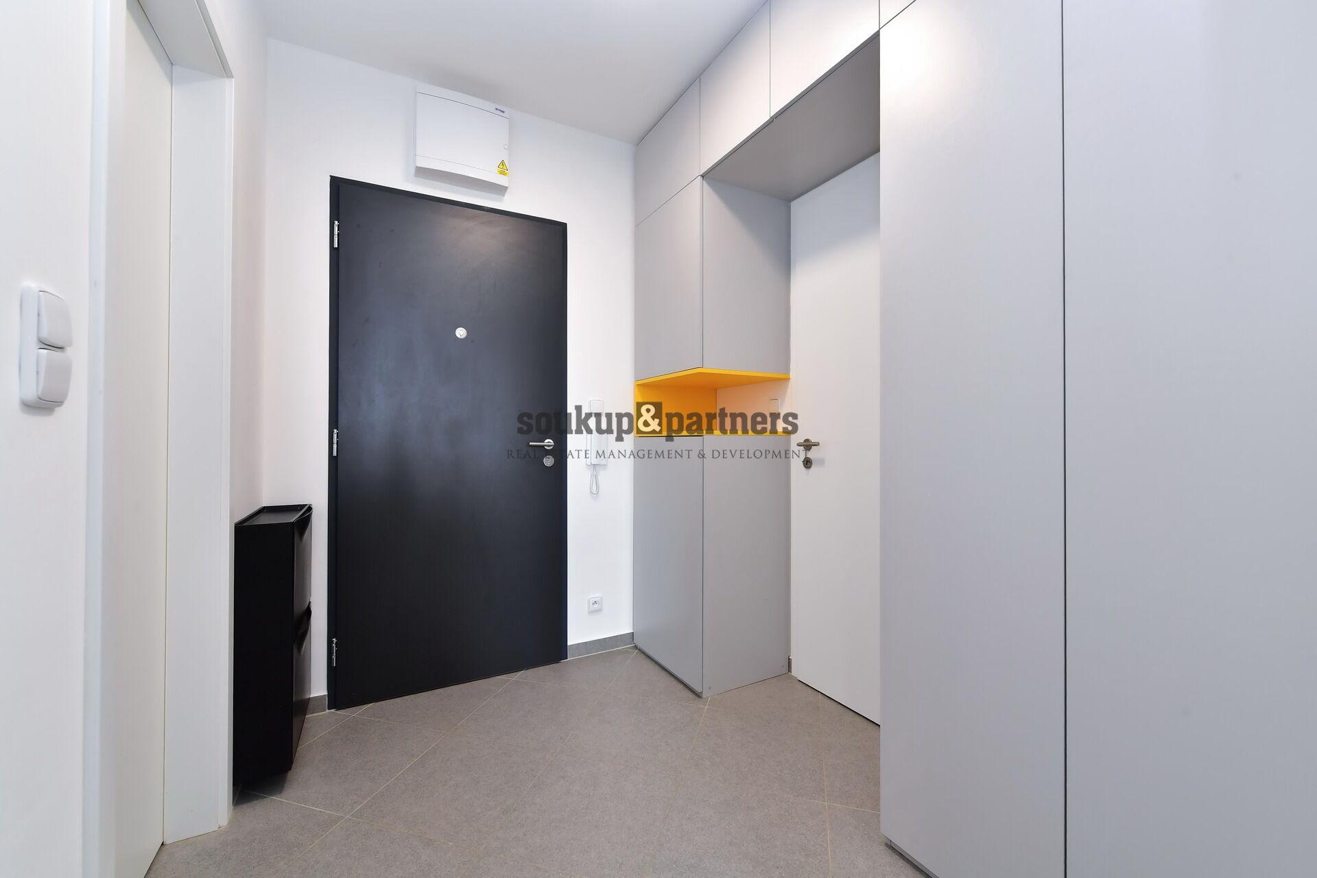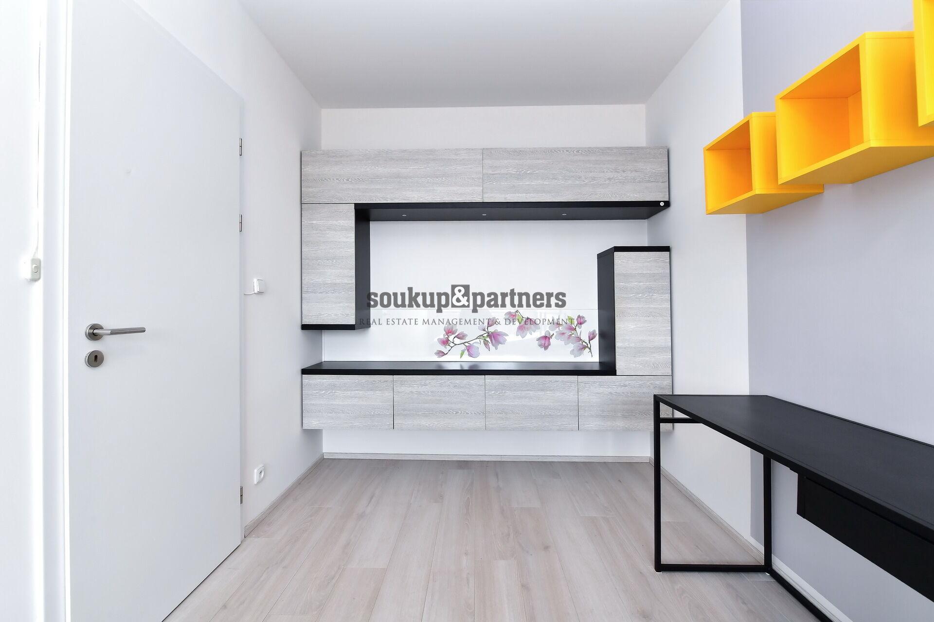 Interiér bytu je vybaven kvalitním moderním nábytkem a nabízí praktické dispoziční řešení včetně velké šatny s vestavěným nábytkem. Kuchyňská linka je plně vybavena spotřebiči – indukční varná deska, elektrická trouba, myčka nádobí, digestoř a kombinovanou lednicí.