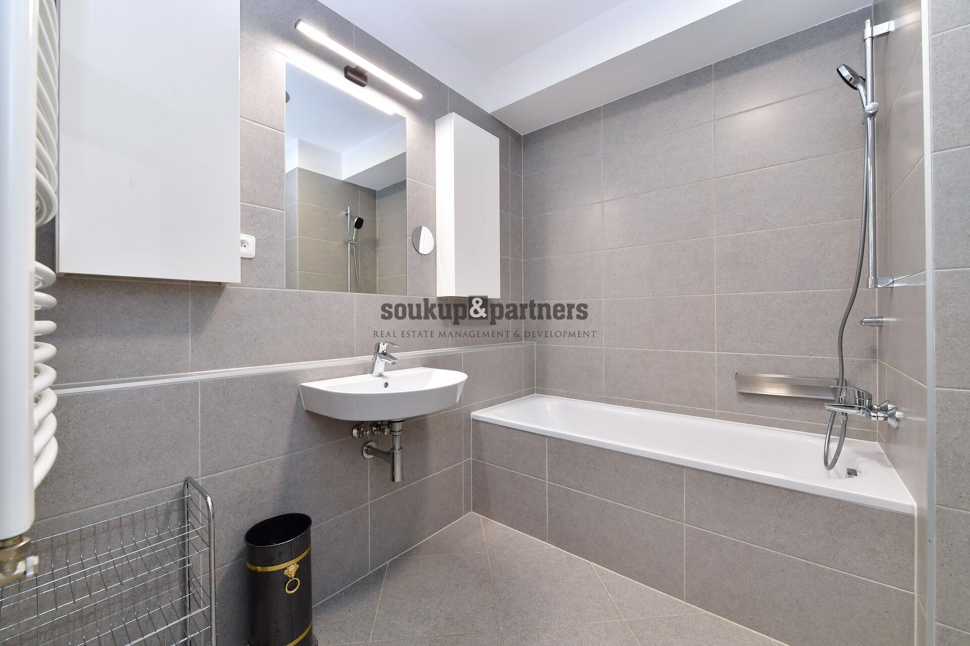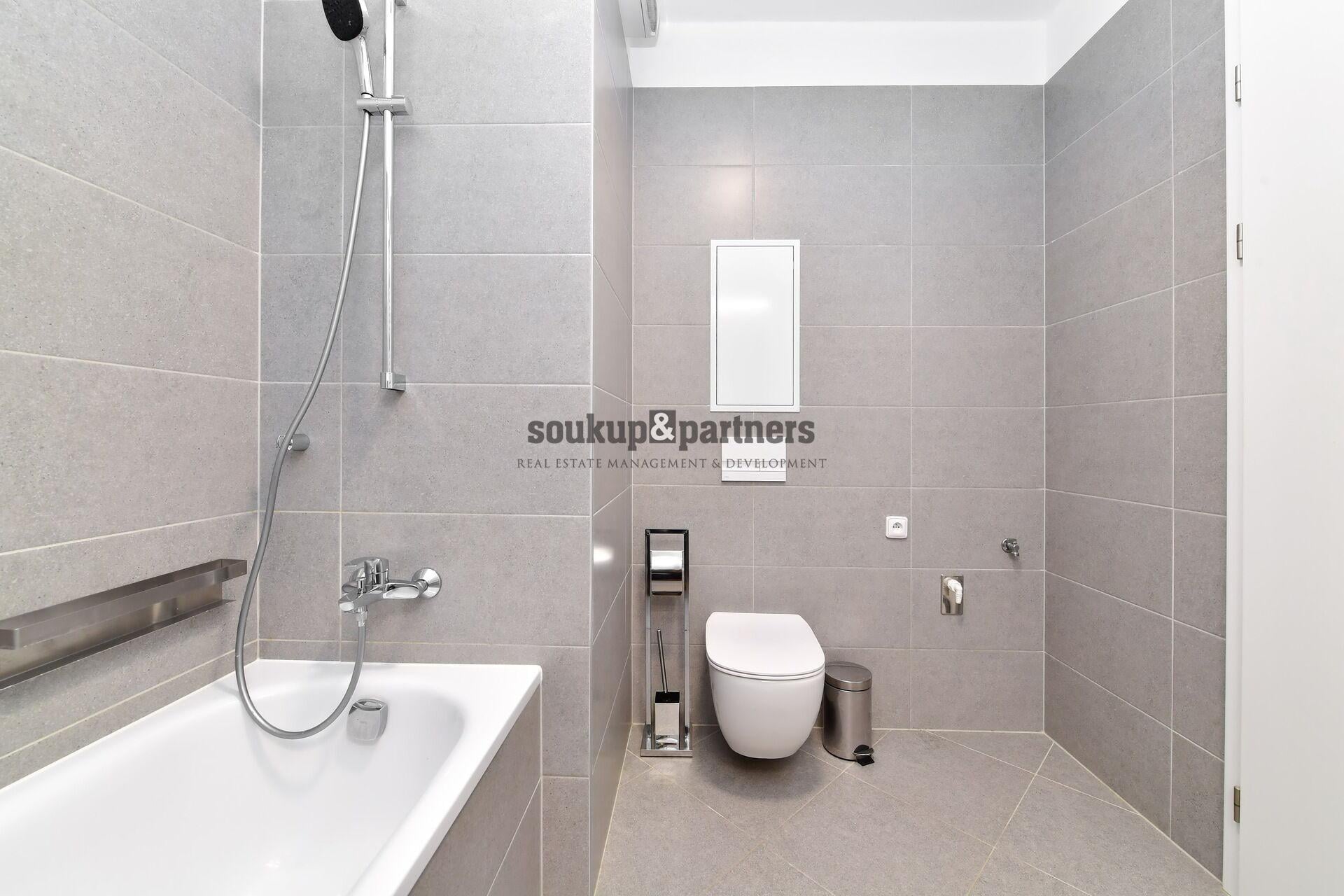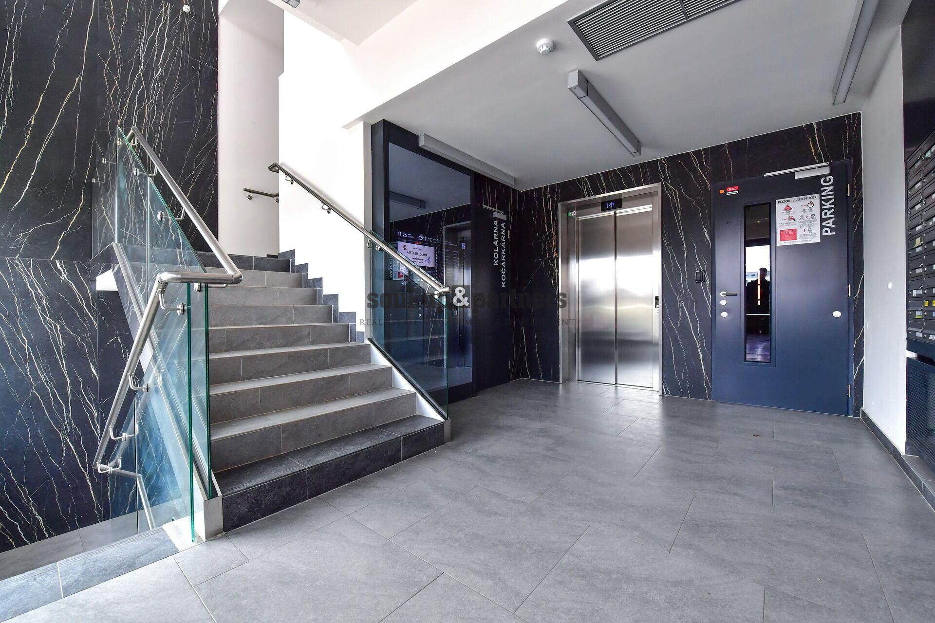 Interiér bytu je vybaven kvalitním moderním nábytkem a nabízí praktické dispoziční řešení včetně velké šatny s vestavěným nábytkem. Kuchyňská linka je plně vybavena spotřebiči – indukční varná deska, elektrická trouba, myčka nádobí, digestoř a kombinovanou lednicí.