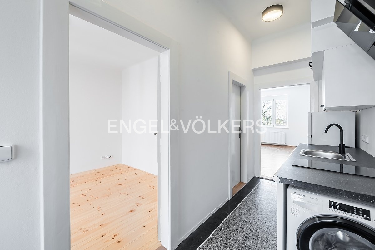 Byt je po rekonstrukci a nabízí prakticky řešenou dispozici – samostatnou kuchyň vybavenou spotřebiči včetně pračky, dva pokoje, z nichž jeden je orientovaný do klidného vnitrobloku a disponuje balkonem, zatímco druhý směřuje do ulice. Dále je k dispozici koupelna se sprchovým koutem a praktická komora.