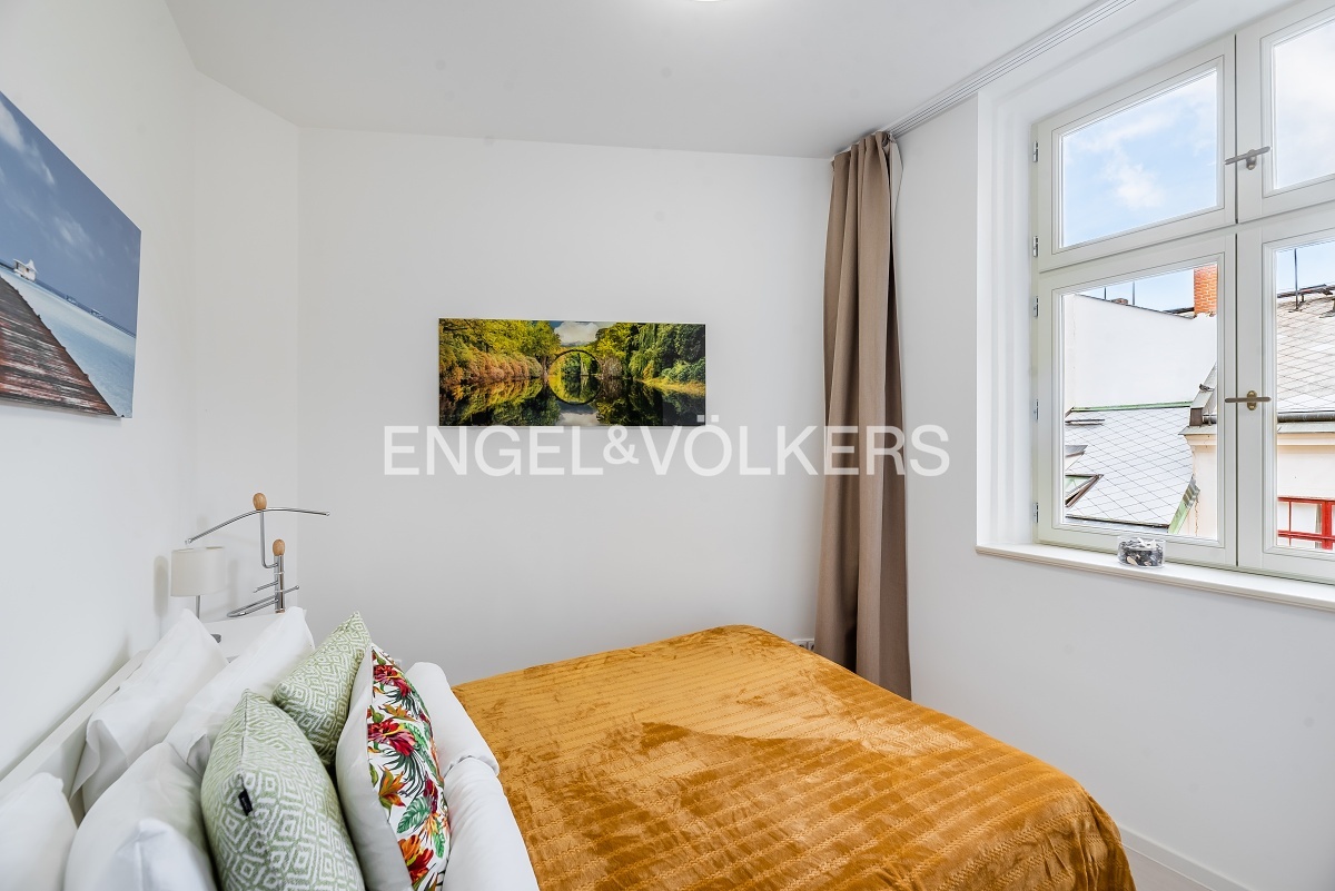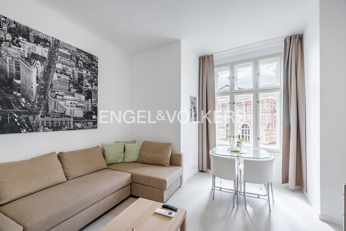 K dlouhodobému pronájmu nabízíme krásný světlý byt v samém centru Prahy. Jednotka se nachází ve 4. patře udržovaného činžovního domu bez výtahu a nabízí se kompletně vybavená.