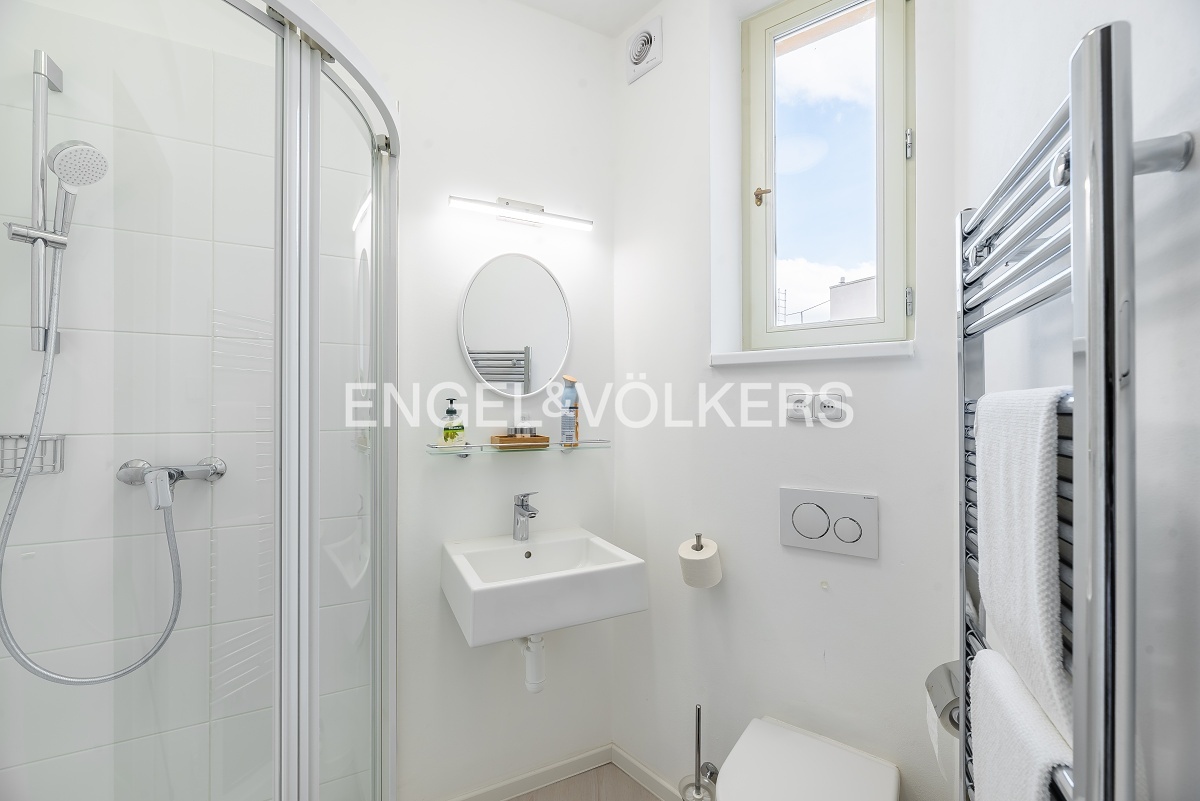 Kuchyně nabízí dostatek pracovního prostoru a je vybavená veškerými spotřebiči včetně dvoudveřové lednice, varné desky, trouby, myčky a pračky. Obývací pokoj navazující na kuchyni je krásně světlý s výhledem do ulice Vodičkova. Ložnice je orientovaná do tichého vnitrobloku. Koupelna disponuje sprchovým koutem.